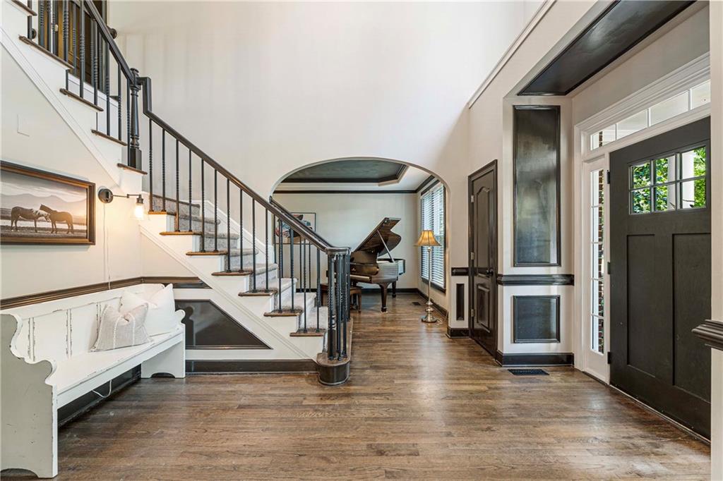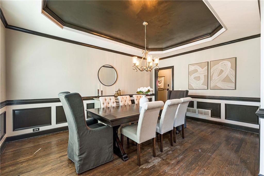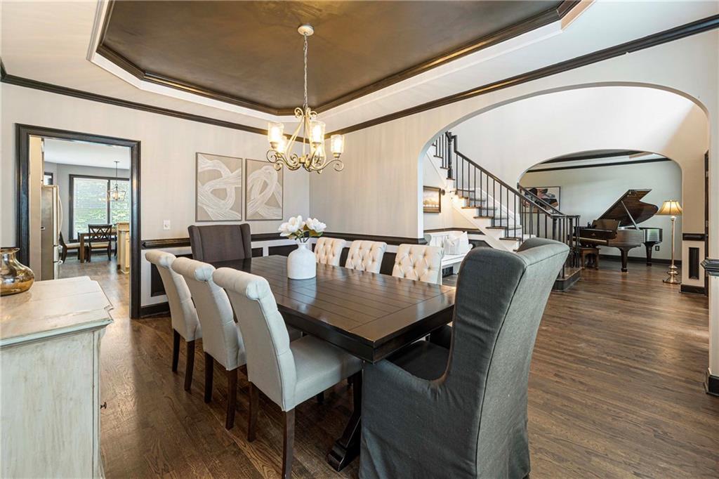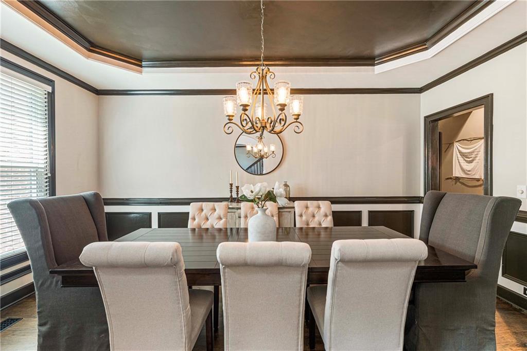 From the moment you step onto the covered front porch and into the two-story foyer, you're greeted by rich details, custom wainscoting, elegant moldings, and curated spaces that feel equal parts welcoming and refined. On either side, formal living and dining rooms are dressed up with arched entryways, tray ceilings, and intricate wall paneling. Hosting dinner for 12 or more is effortless in the spacious dining room.