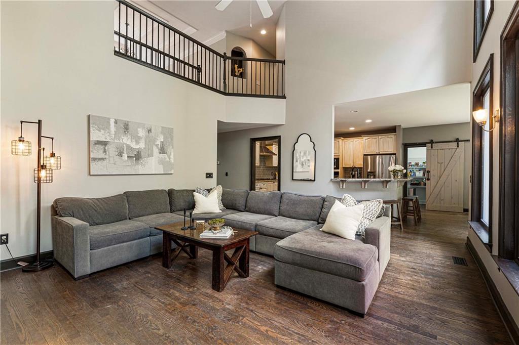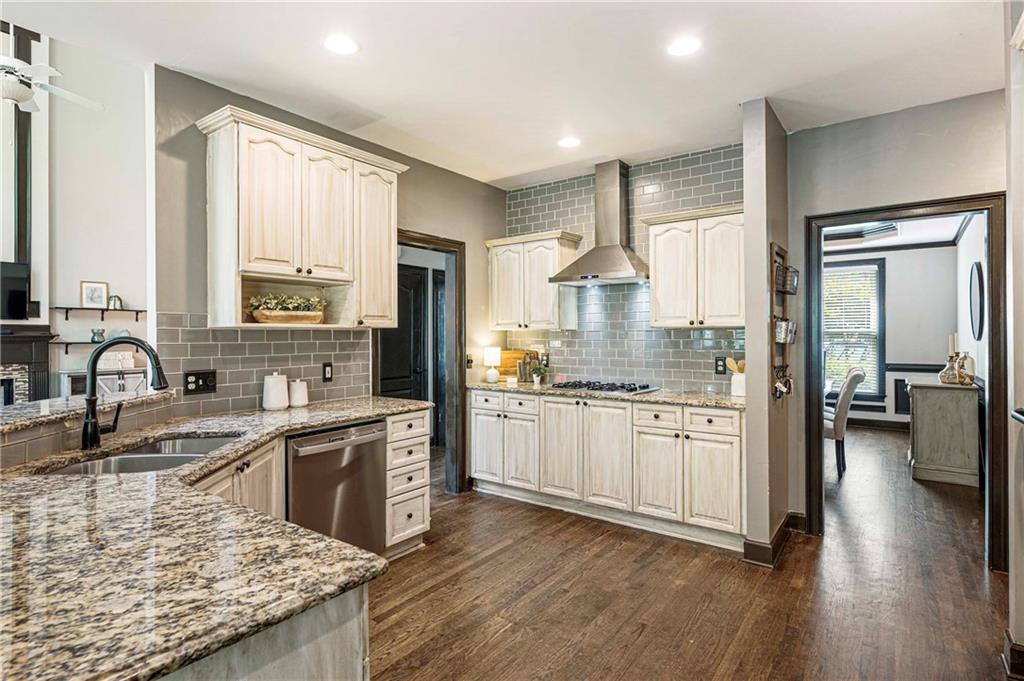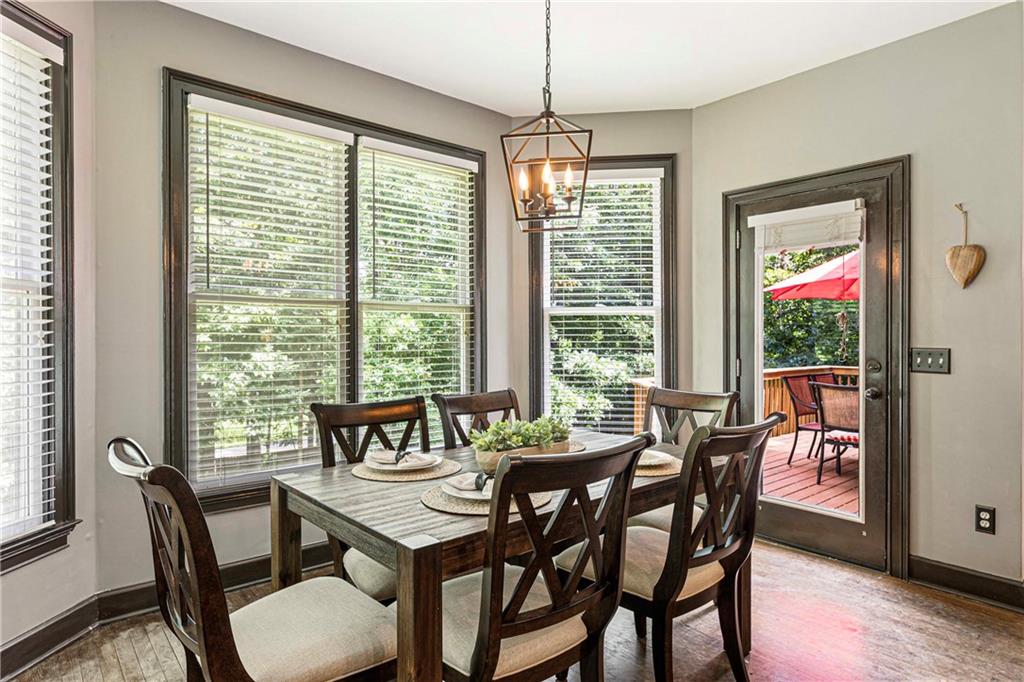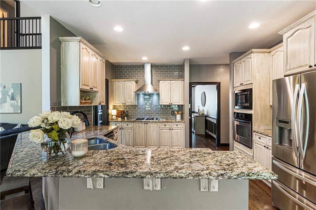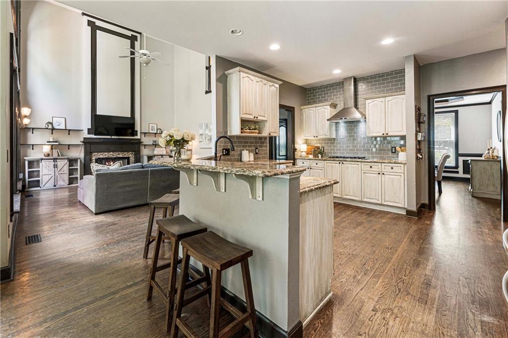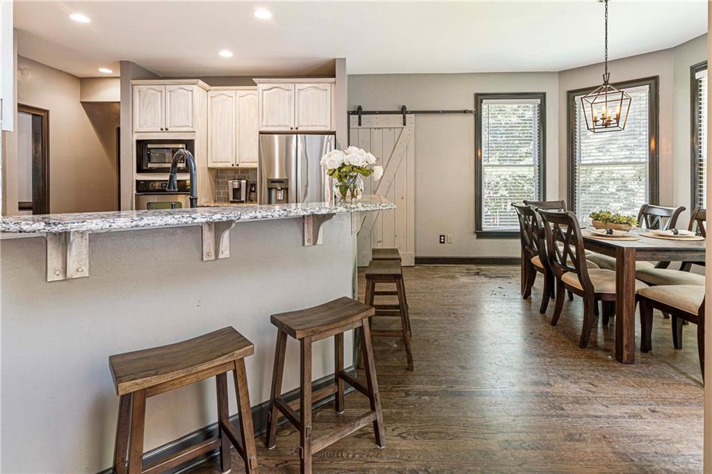 The kitchen checks all the boxes--white cabinetry, subway tile, solid-surface counters, stainless steel appliances, a breakfast bar, and a walk-in pantry behind a statement-making barn door. Whether you're grabbing coffee in the bright breakfast nook or stepping out to the back deck for a casual BBQ with friends, the indoor-outdoor flow makes it all feel effortless.