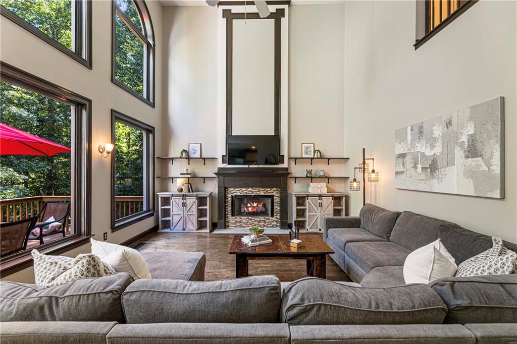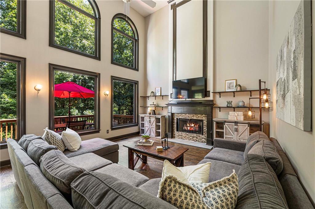 The heart of the home is the showstopper: a soaring two-story family room drenched in natural light, thanks to a wall of oversized windows. A cozy fireplace anchors the space, while warm hardwood floors flow effortlessly into the dining room and kitchen, creating a cohesive and open layout perfect for everyday living and casual entertaining.
