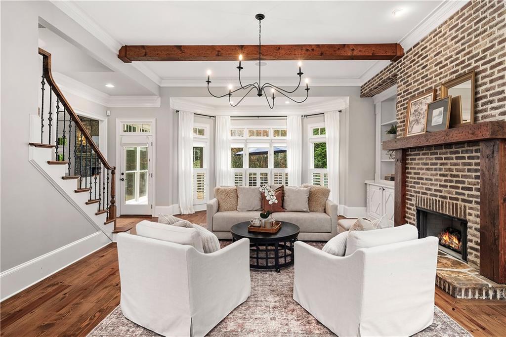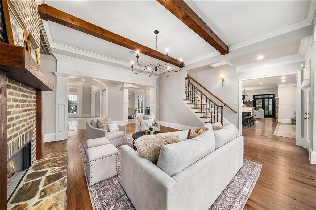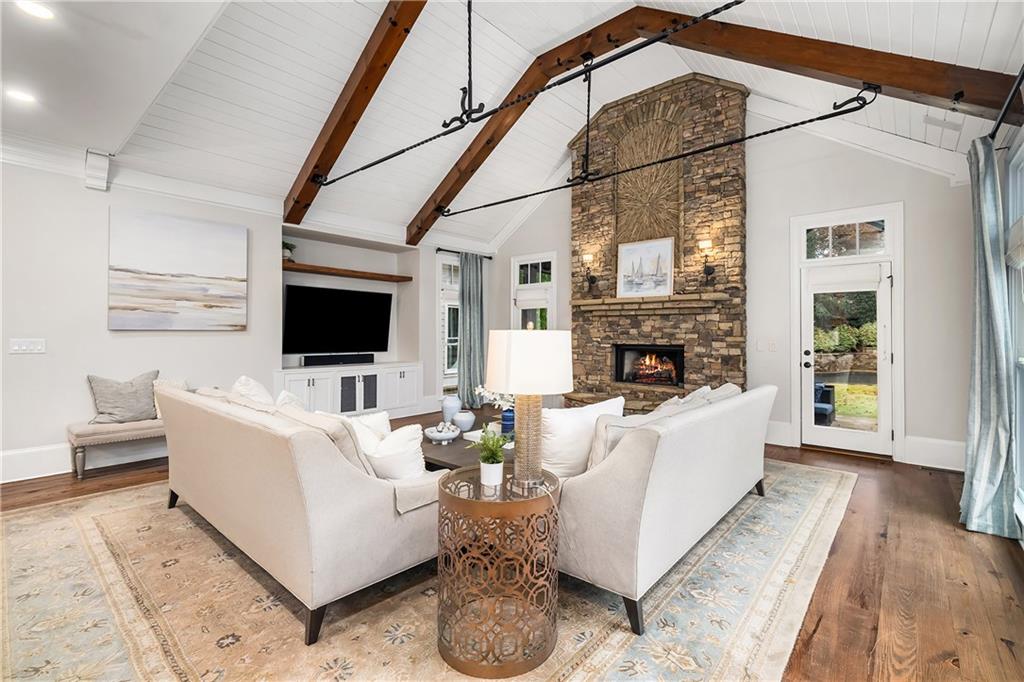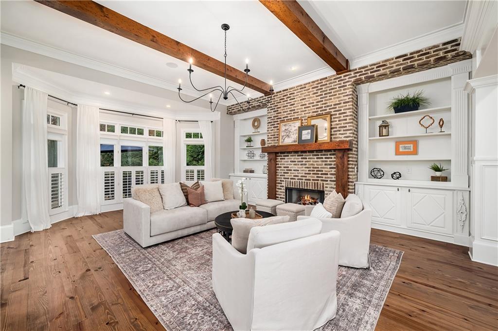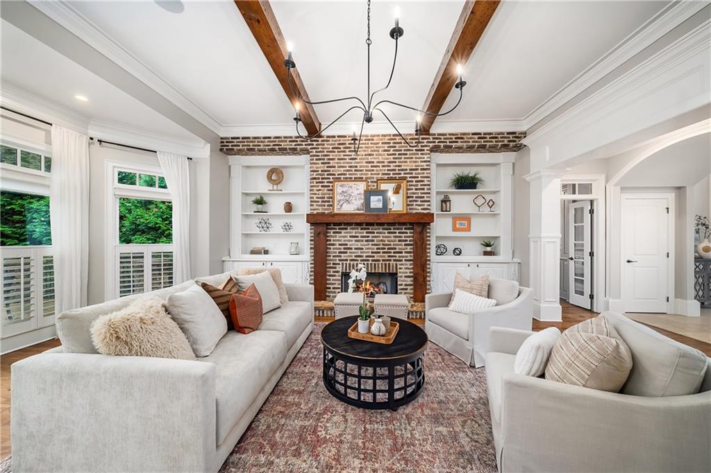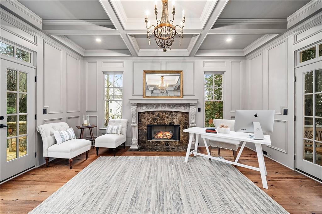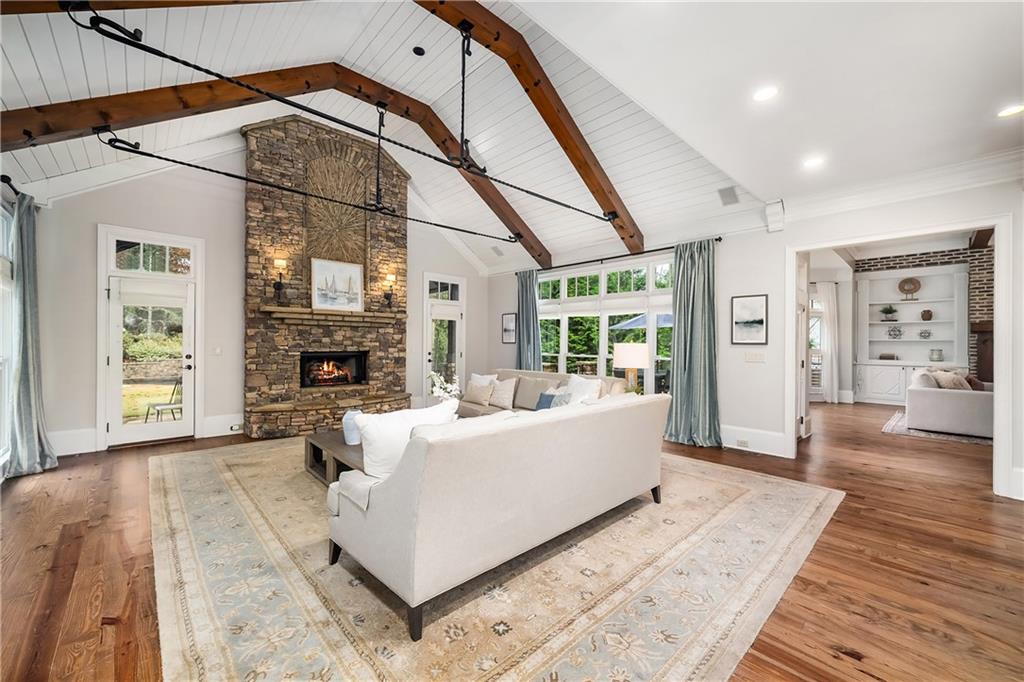 The formal living room features heart pine floors, a masonry fireplace flanked by built-in bookcases, a beamed ceiling with a chandelier and picture windows with plantation shutters overlooking and opening directly to the on-grade backyard, creating effortless indoor-outdoor entertaining. The gourmet chef's kitchen features white cabinetry, an oversized island with seating, thick granite slab countertops and professional-grade stainless steel appliances, including a double oven and a warming drawer. The kitchen opens into an inviting keeping room with a cathedral ceiling, a beamed wooden ceiling and a floor-to-ceiling stacked-stone fireplace with flanking doors that also open to the on-grade backyard oasis and pool, enhancing the home's exceptional flow. Just off the kitchen sits a breakfast room with stacked-stone accents and French doors opening to the side porch. An adjacent mudroom offers storage cubbies, a built-in desk in an office nook and a laundry room. A handsome study at the end of the hallway features judges molding, built-in bookcases, a coffered ceiling, French doors to the outdoors and a fireplace with a marble surround. A half bathroom completes the main level.
