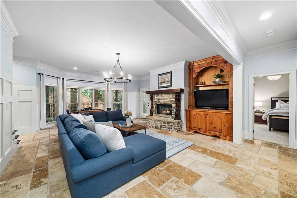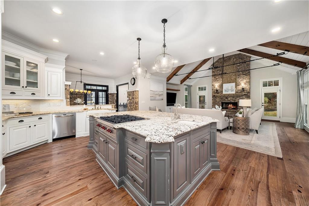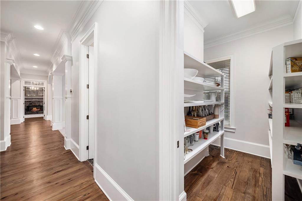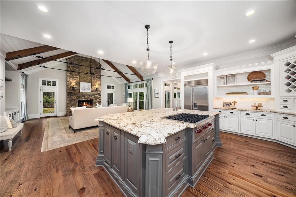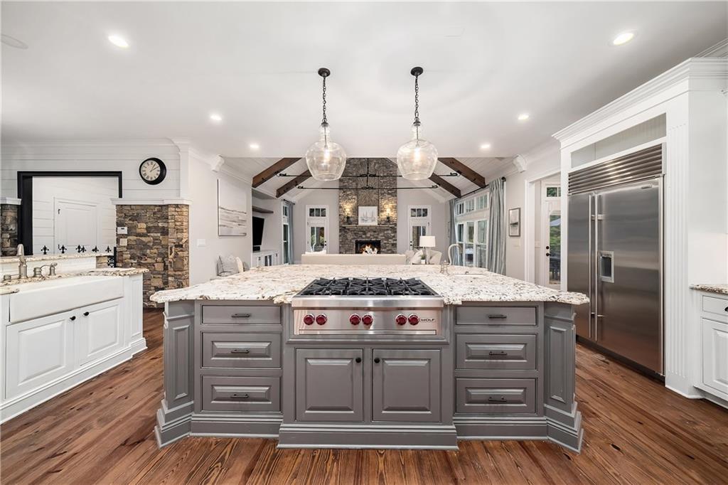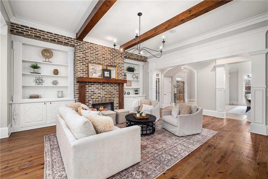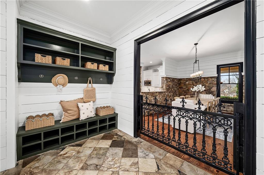 The formal living room features heart pine floors, a masonry fireplace flanked by built-in bookcases, a beamed ceiling with a chandelier and picture windows with plantation shutters overlooking and opening directly to the on-grade backyard, creating effortless indoor-outdoor entertaining. The gourmet chef's kitchen features white cabinetry, an oversized island with seating, thick granite slab countertops and professional-grade stainless steel appliances, including a double oven and a warming drawer. The kitchen opens into an inviting keeping room with a cathedral ceiling, a beamed wooden ceiling and a floor-to-ceiling stacked-stone fireplace with flanking doors that also open to the on-grade backyard oasis and pool, enhancing the home's exceptional flow. Just off the kitchen sits a breakfast room with stacked-stone accents and French doors opening to the side porch. An adjacent mudroom offers storage cubbies, a built-in desk in an office nook and a laundry room. A handsome study at the end of the hallway features judges molding, built-in bookcases, a coffered ceiling, French doors to the outdoors and a fireplace with a marble surround. A half bathroom completes the main level.