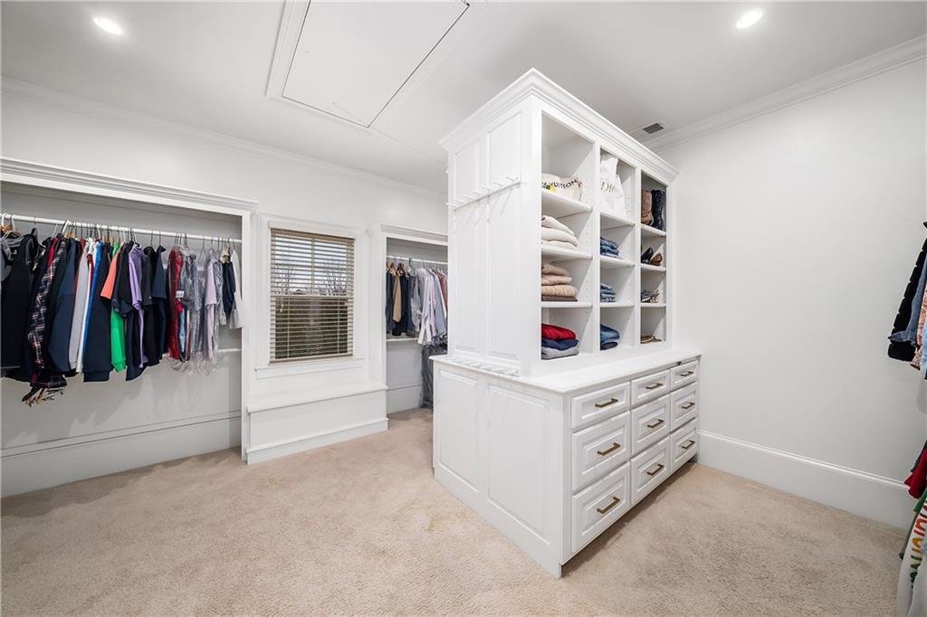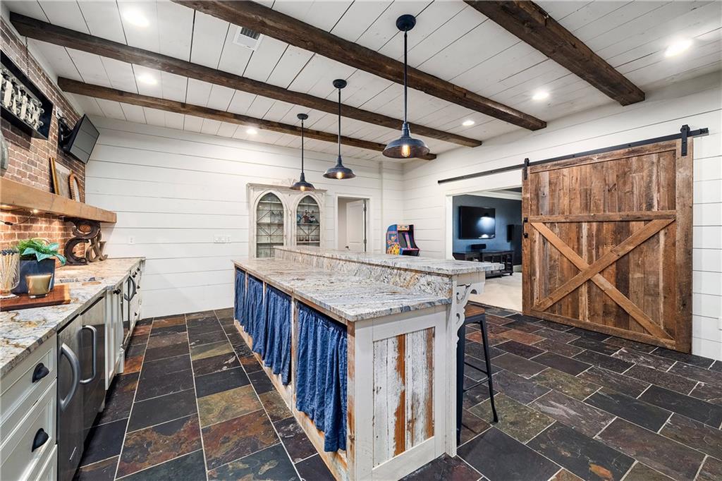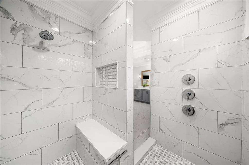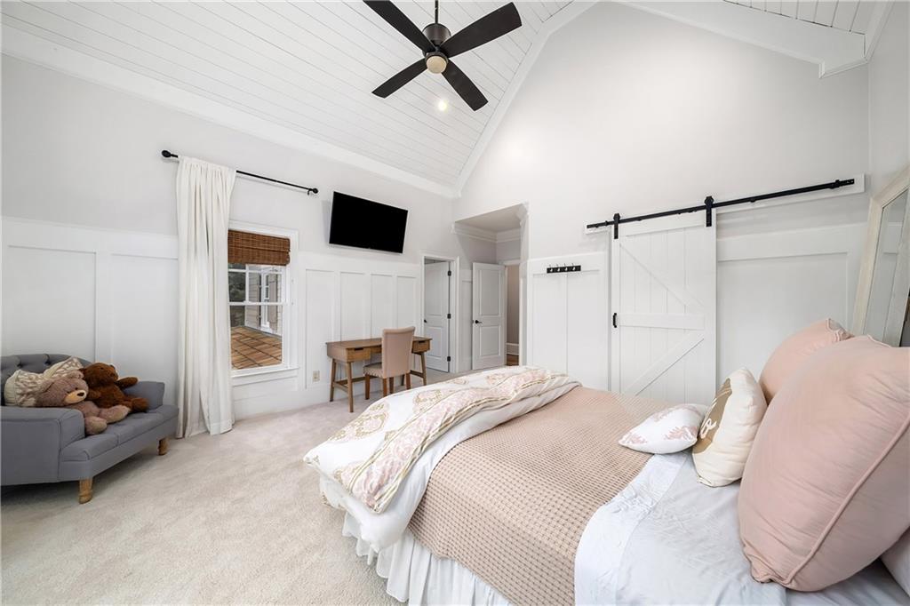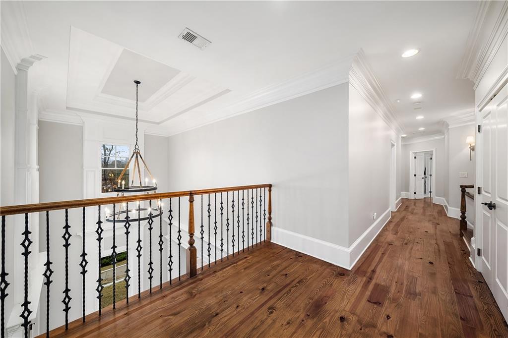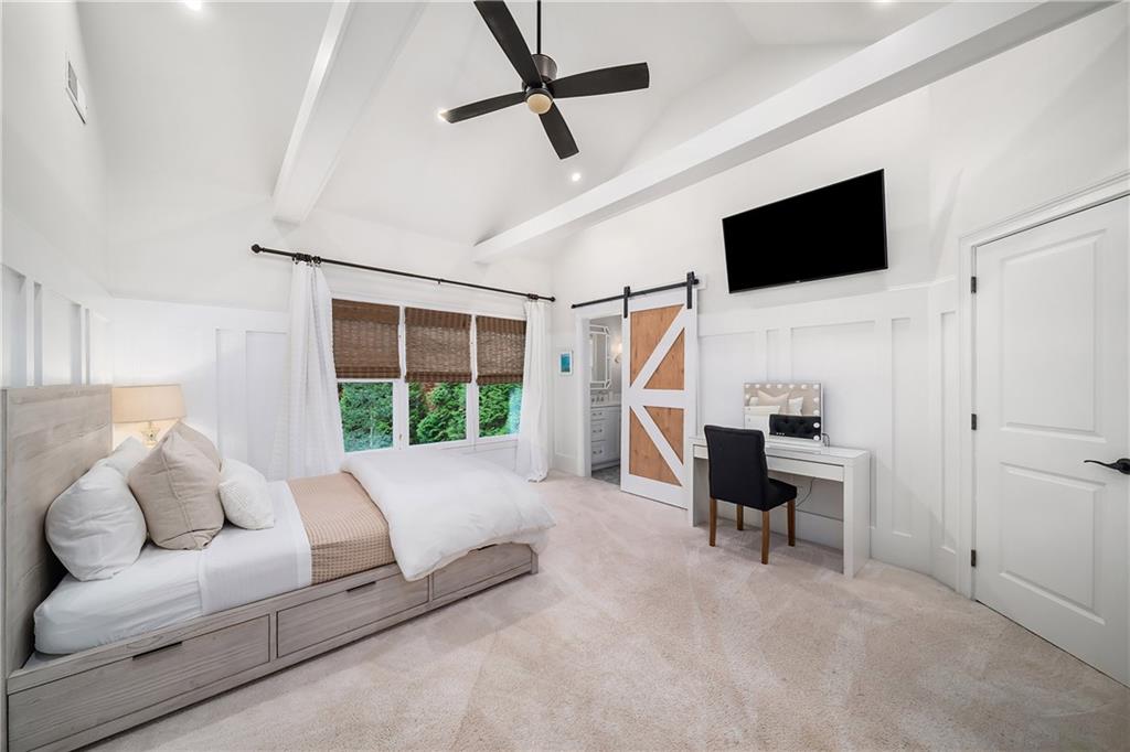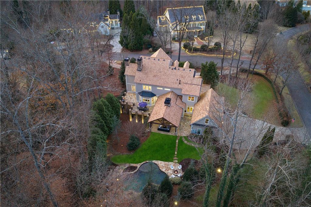The formal living room features heart pine floors, a masonry fireplace flanked by built-in bookcases, a beamed ceiling with a chandelier and picture windows with plantation shutters overlooking and opening directly to the on-grade backyard, creating effortless indoor-outdoor entertaining. The gourmet chef's kitchen features white cabinetry, an oversized island with seating, thick granite slab countertops and professional-grade stainless steel appliances, including a double oven and a warming drawer. The kitchen opens into an inviting keeping room with a cathedral ceiling, a beamed wooden ceiling and a floor-to-ceiling stacked-stone fireplace with flanking doors that also open to the on-grade backyard oasis and pool, enhancing the home's exceptional flow. Just off the kitchen sits a breakfast room with stacked-stone accents and French doors opening to the side porch. An adjacent mudroom offers storage cubbies, a built-in desk in an office nook and a laundry room. A handsome study at the end of the hallway features judges molding, built-in bookcases, a coffered ceiling, French doors to the outdoors and a fireplace with a marble surround. A half bathroom completes the main level.