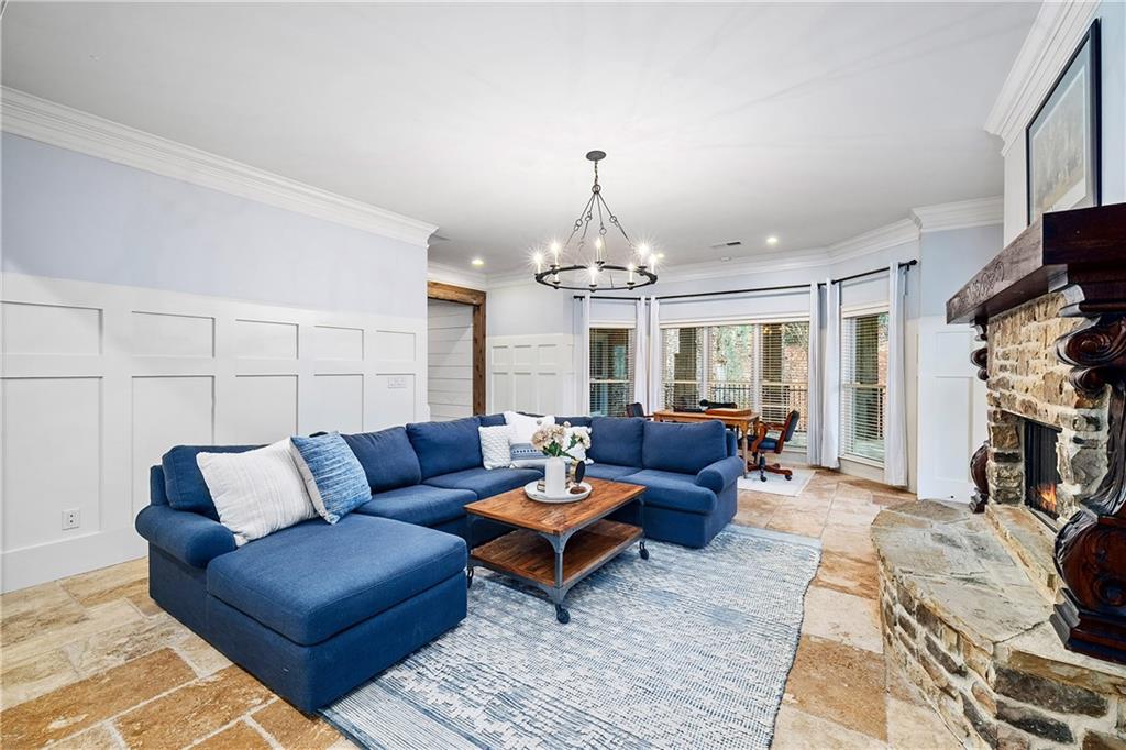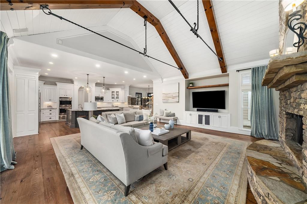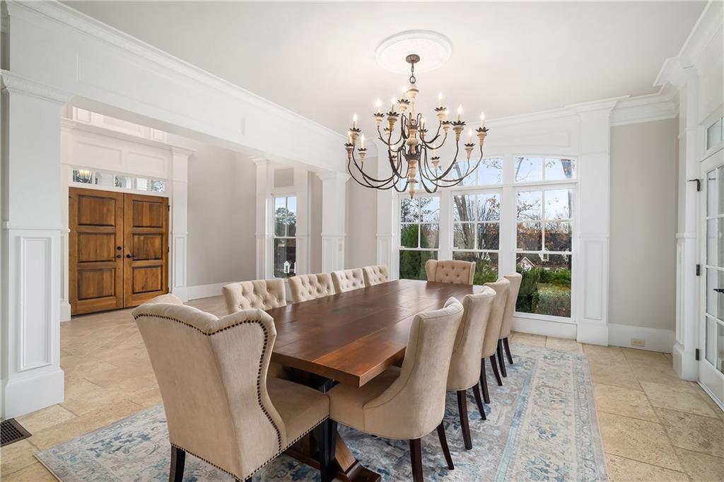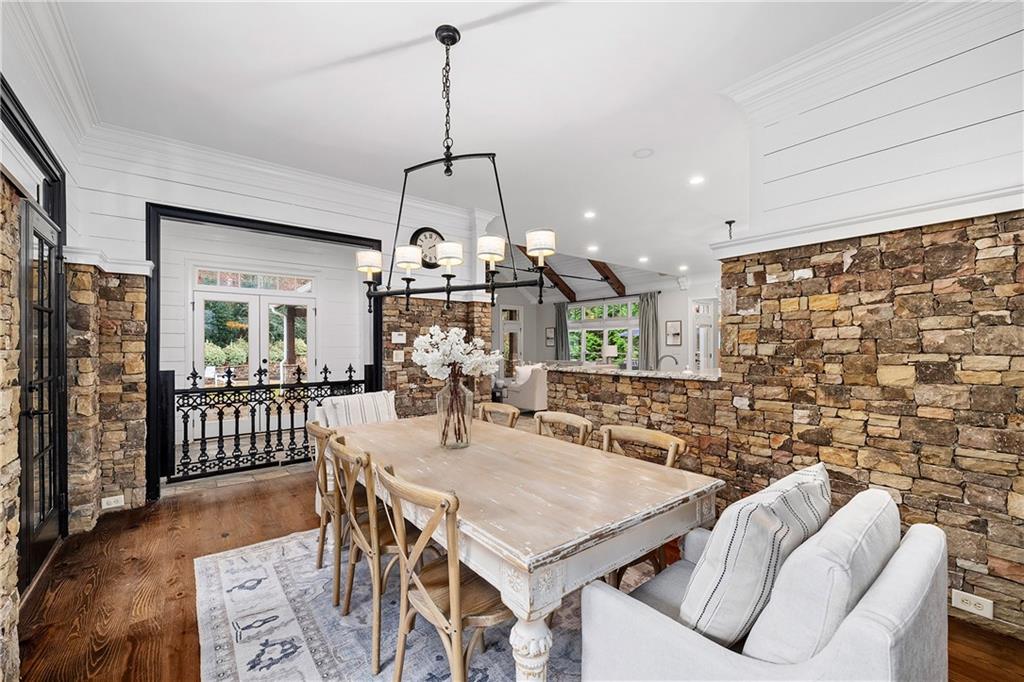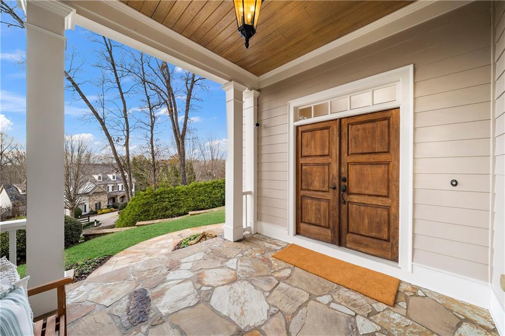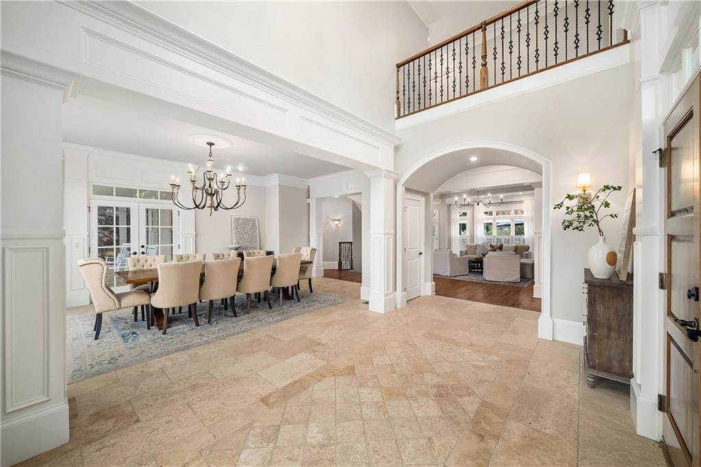 Located in Six Hills, one of Milton's most sought-after neighborhoods offering notable walkability to Downtown Crabapple, this gracious residence welcomes you with a charming covered entry and a deep, wraparound front and side porch. Beautiful stonework on the facade is echoed in the low stone wall that frames the circular driveway. Double doors open to a two-story foyer that leads naturally into an elegant dining room with oversized molding, large windows and double French doors that open to the covered front porch.