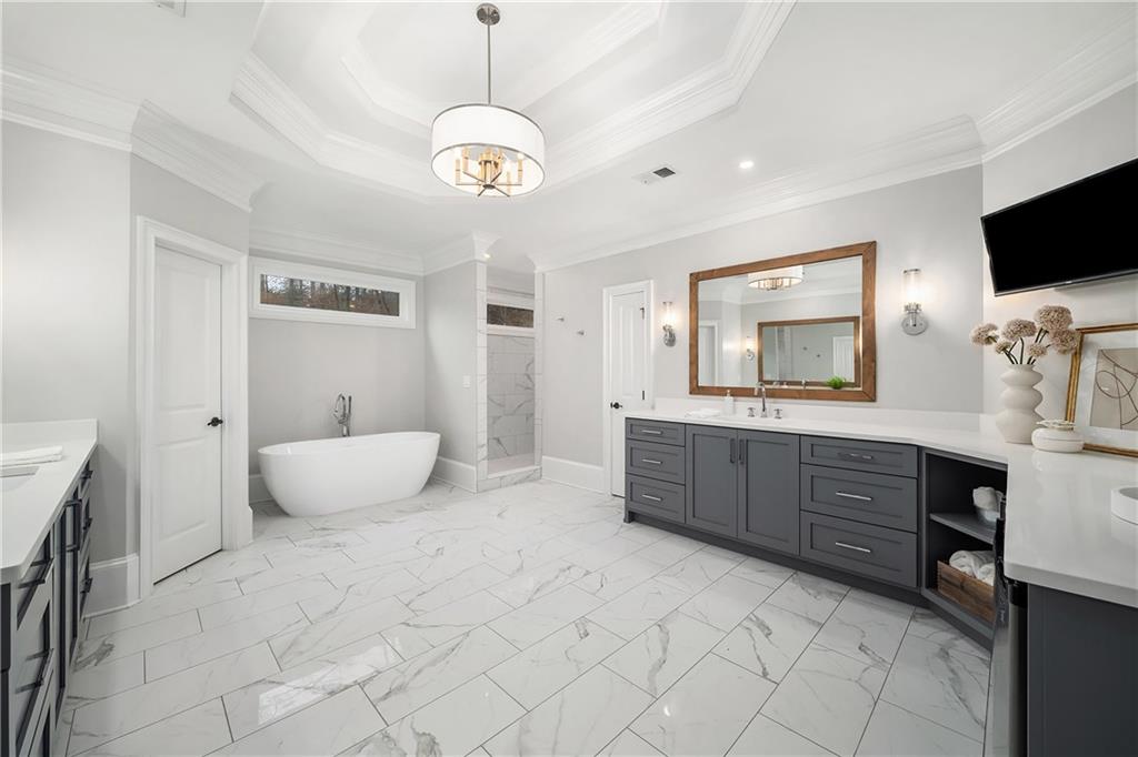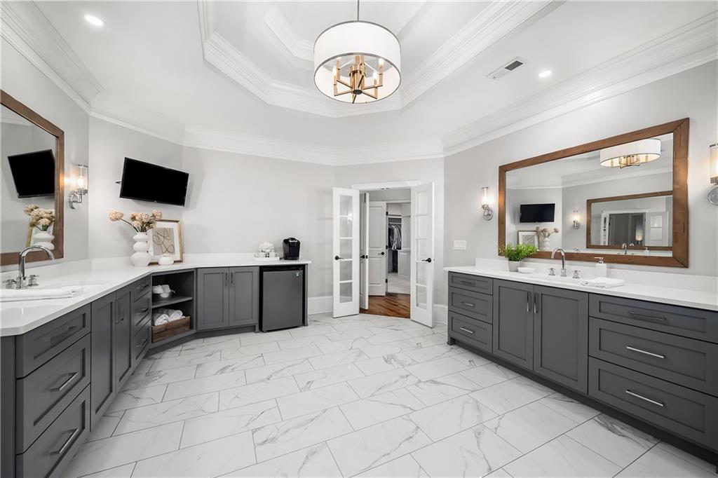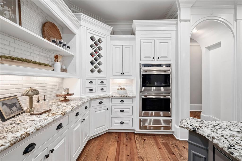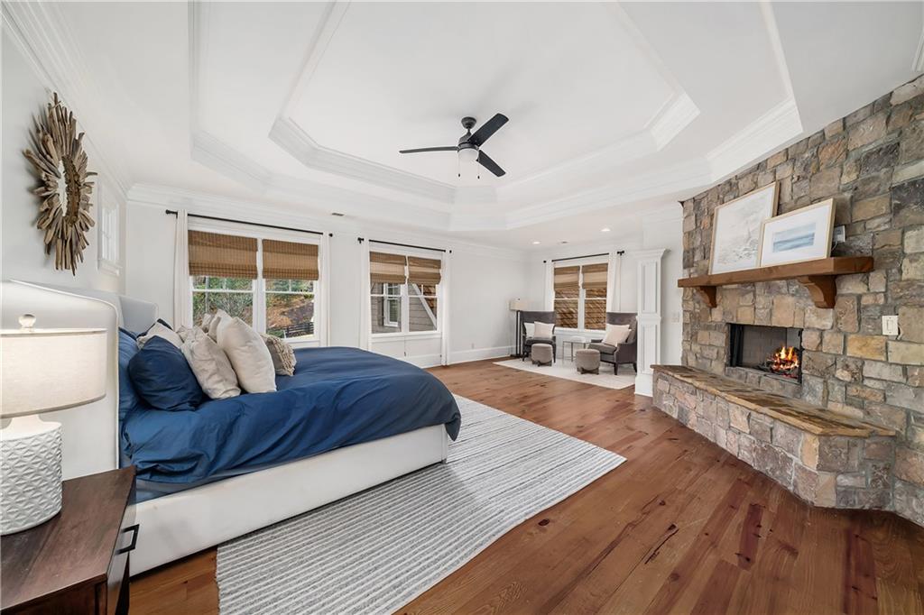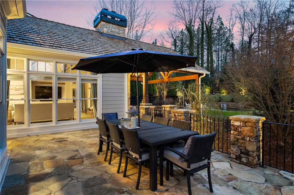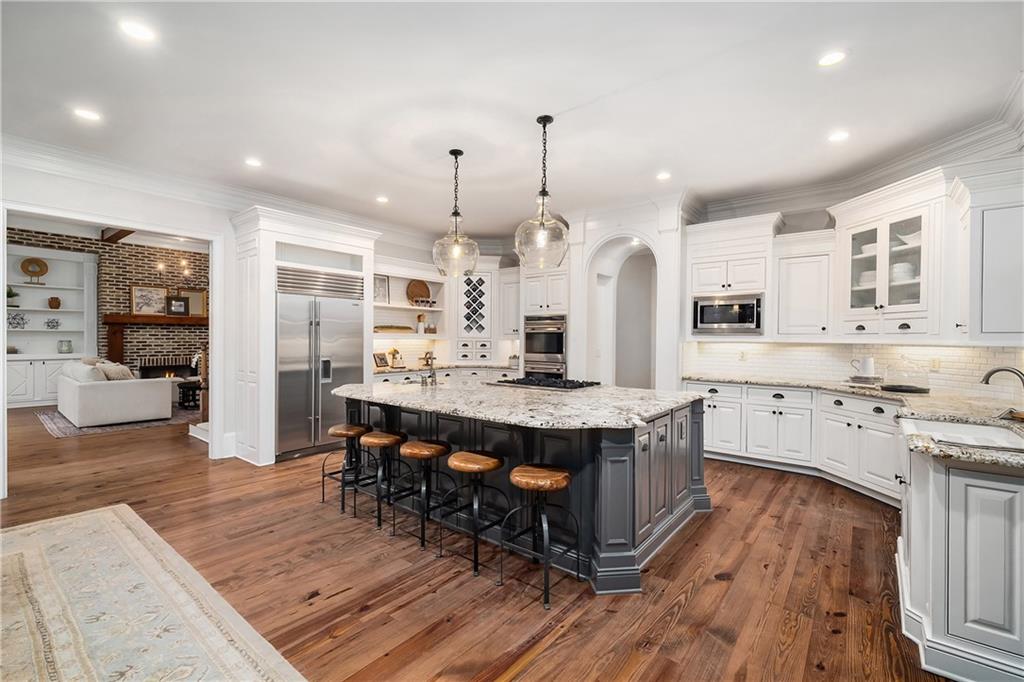 Located in Six Hills, one of Milton's most sought-after neighborhoods offering notable walkability to Downtown Crabapple, this gracious residence welcomes you with a charming covered entry and a deep, wraparound front and side porch. Beautiful stonework on the facade is echoed in the low stone wall that frames the circular driveway. Double doors open to a two-story foyer that leads naturally into an elegant dining room with oversized molding, large windows and double French doors that open to the covered front porch.