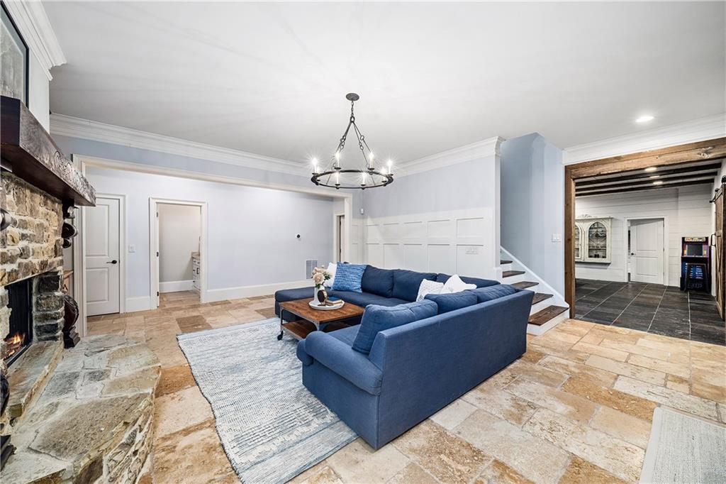 The terrace level provides exceptional additional living space with a large family room featuring a stone fireplace and built-in storage. A generously sized recreation room includes a bar, slate floors and a beamed ceiling. This level also features a media room, a gym, a tucked-away room perfect for a charming bunk room, a bedroom with an en suite bathroom, an additional bathroom and access to the lower-level covered stone porch. An outstanding bonus of this property is the one-bedroom, one-bathroom in-law suite located above the three-car garage.
