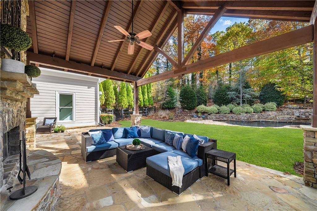 Situated on 1.4+- acres, the property's outdoor living is equally impressive. A covered patio off the main level features stone floors, a stacked-stone fireplace and a spacious sitting area that opens directly to the grassy play area and the beautiful saltwater pool and spa, complete with multiple waterfalls and a built-in fire pit. Mature landscaping provides both privacy and a picturesque backdrop for year-round enjoyment.