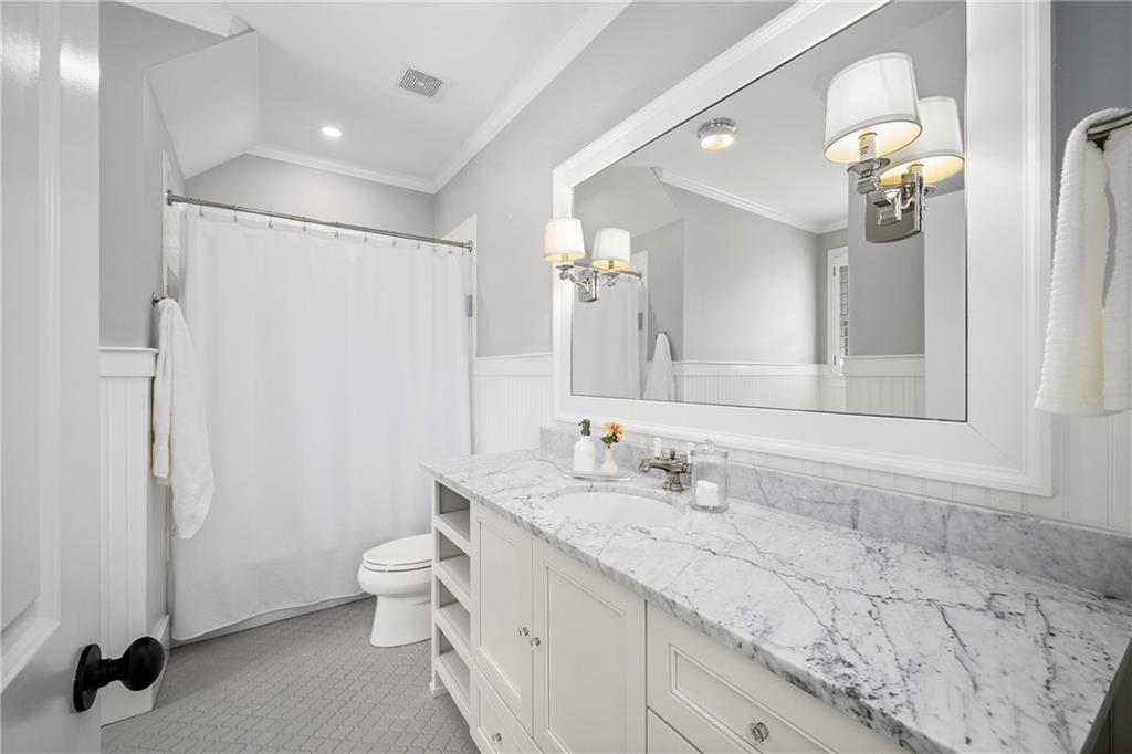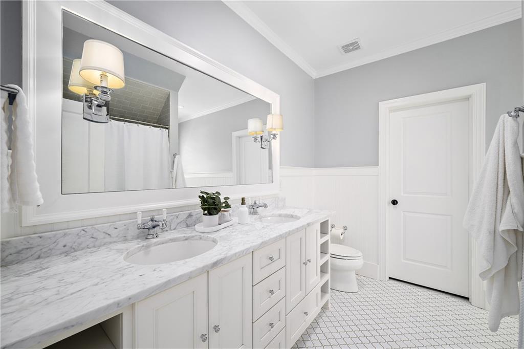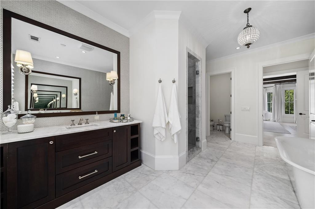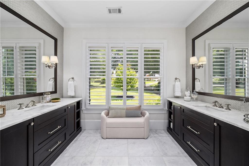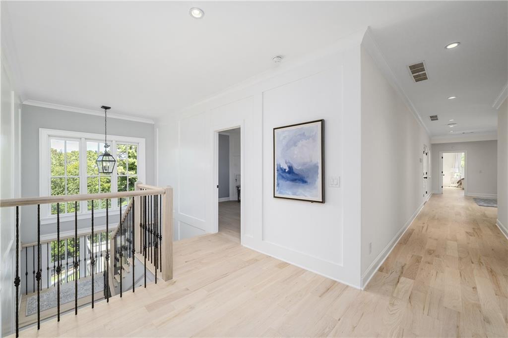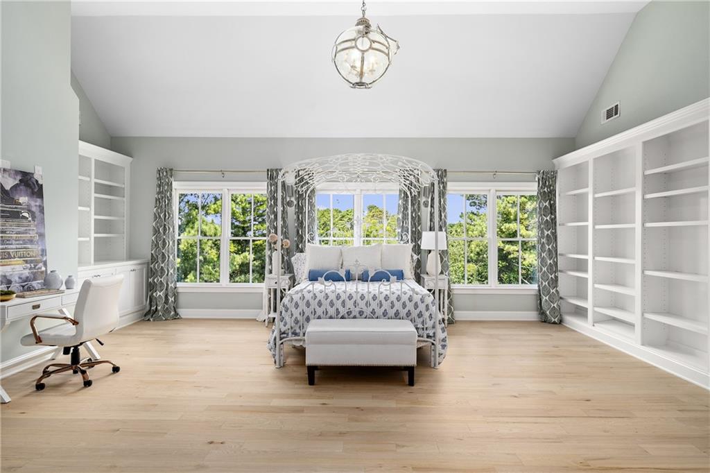 Upstairs, a centrally located secondary primary suite or upper bonus features vaulted ceiling, custom built-ins, and a luxurious en suite bath. The upper holds five additional bedrooms each with en suite baths as well as a convenient second laundry room. Tucked between two upper bedrooms you will find a private flexible area that would work well for a study space, reading area or upper play zone.