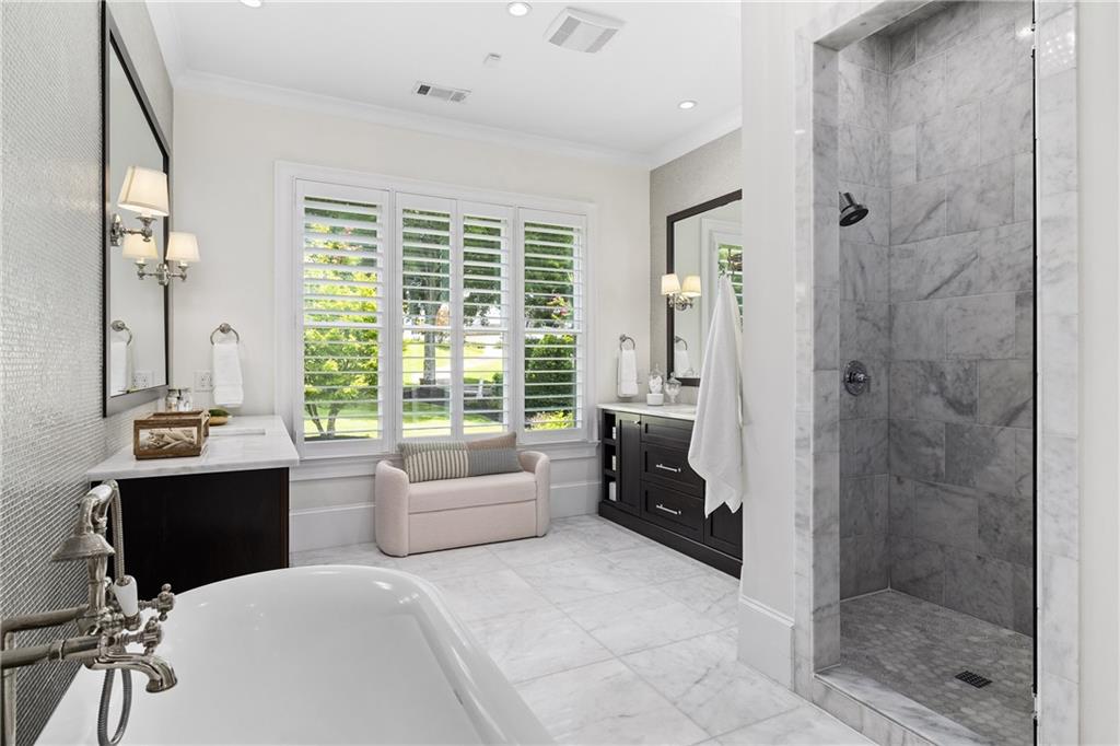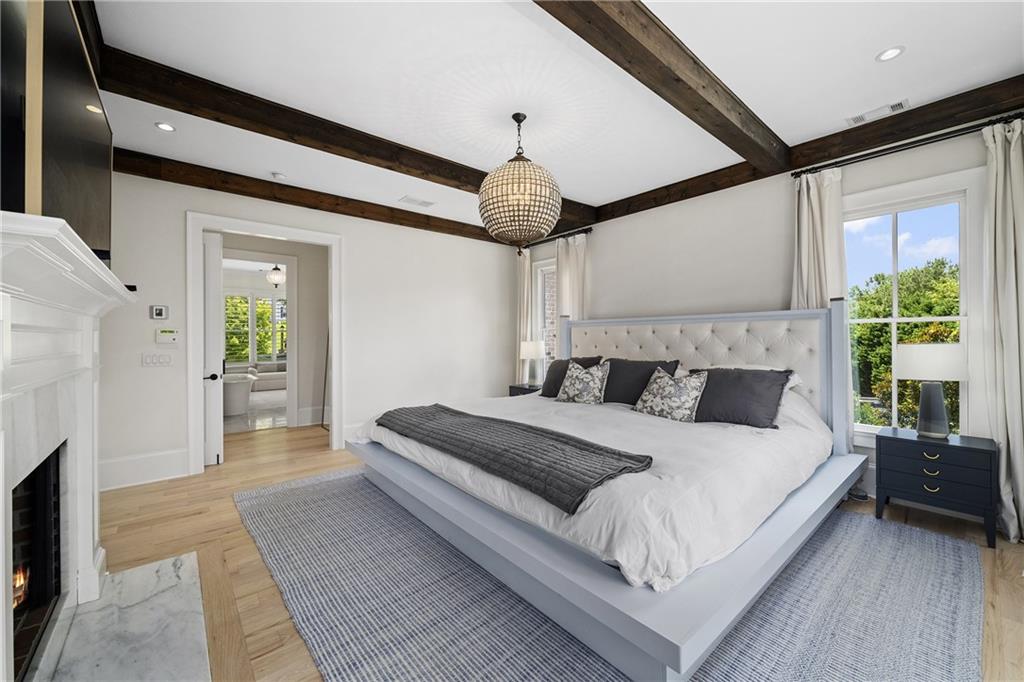 The main-level owner suite is a serene retreat with bay window seating alcove, wood-beamed ceiling, and marble-surround fireplace. The spa-inspired owner's bath features dual marble-topped vanities, a freestanding soaking tub set against a dramatic glass-tiled accent wall, a marble shower, water closet with bidet, and a custom walk-in closet with built-ins and a large central island.