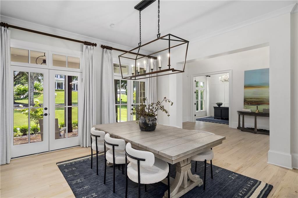 Set on 1.03 meticulously landscaped acres in The Hayfield, known for its gas lantern street lights, tree- lined drive and copper mailboxes, this distinguished residence blends timeless architectural beauty with elevated upgrades throughout. A sweeping front porch lit by gas lanterns opens into a radiant two-story foyer. To one side, a private study with French doors and board and batten paneling offers a peaceful retreat. Opposite, a formal dining room features an exposed brick accent wall and French doors to the front porch--perfect for entertaining or quiet evenings.