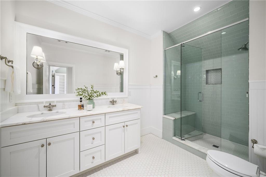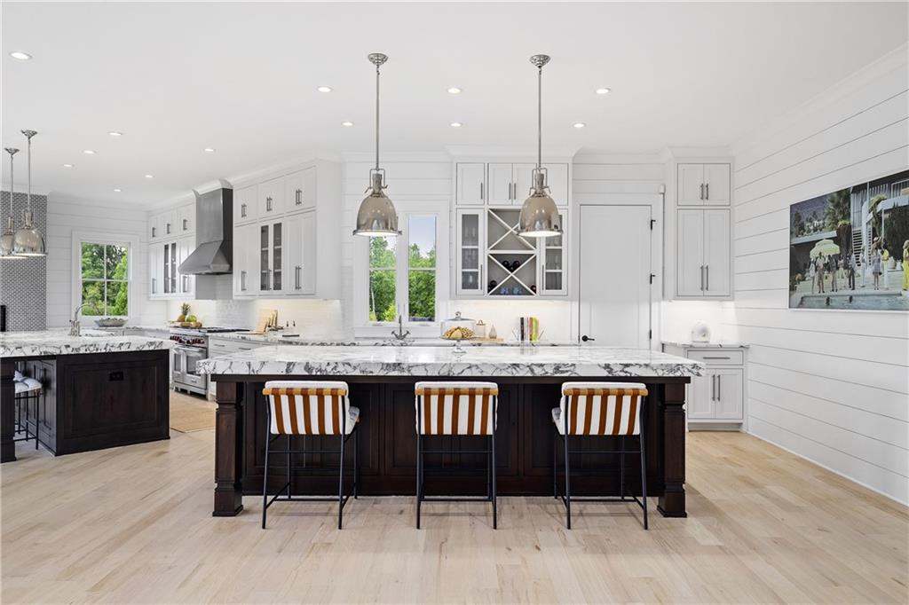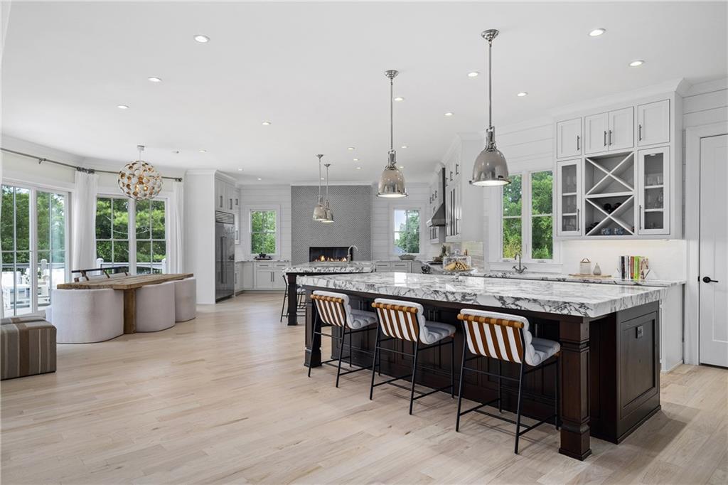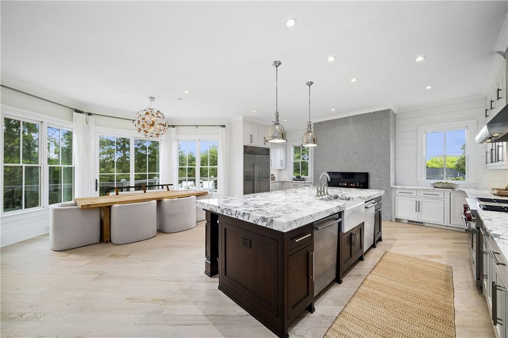 The gourmet chef's kitchen is a true showpiece: custom white cabinetry to the ceiling, dual oversized islands topped with 3-inch marble, and a dramatic gas fireplace add warmth and elegance. Premier appliances include a Sub-Zero refrigerator, Wolf six-burner range with double ovens, two Bosch dishwashers, and a Sub-Zero wine refrigerator. A farmhouse sink and sunny breakfast area overlook the private backyard, while a walk-in pantry - with a second refrigerator, coffee/appliance bar, and abundant storage - offers unmatched convenience. A second friend's entry on main with charming dutch door leads to the main level laundry room, large mudroom with 6 built-in sections, and two half baths round out the main living areas with both function and style.