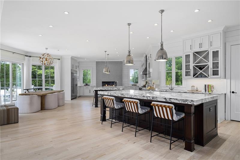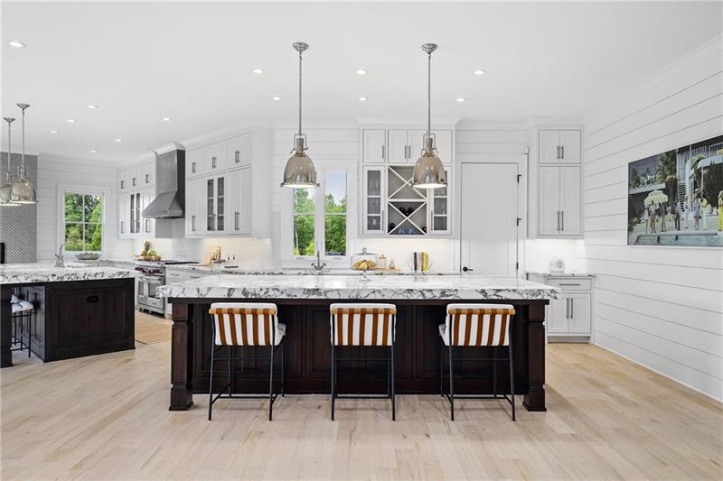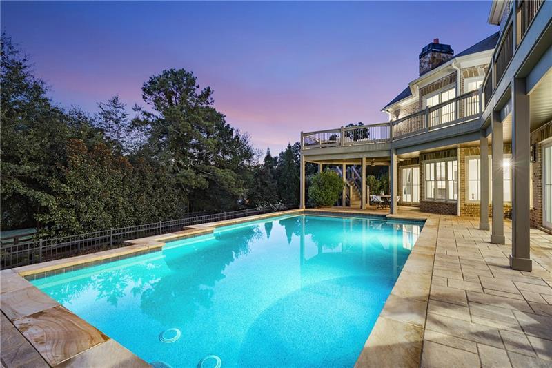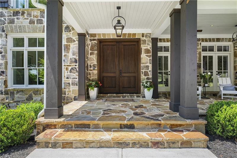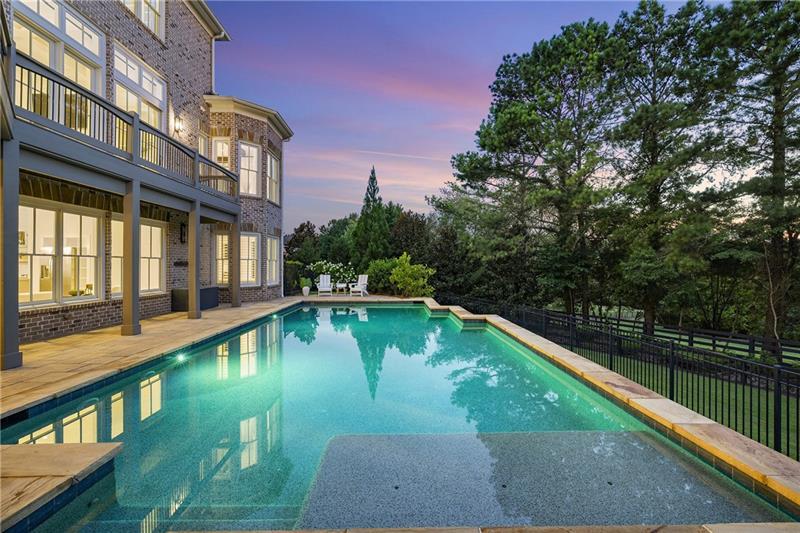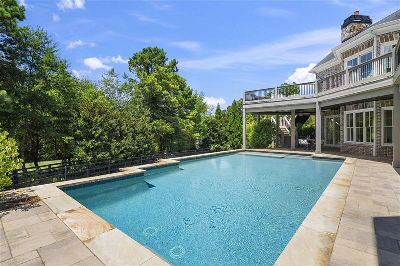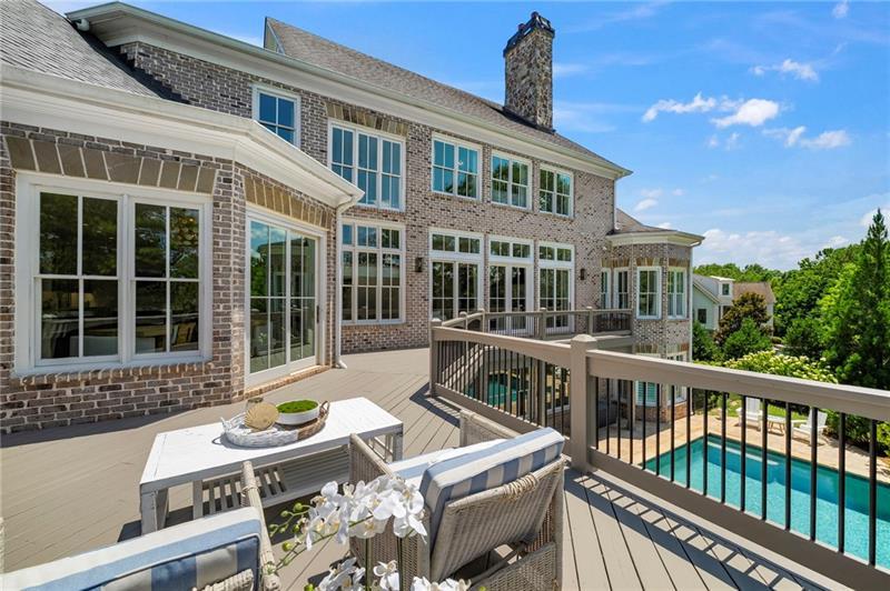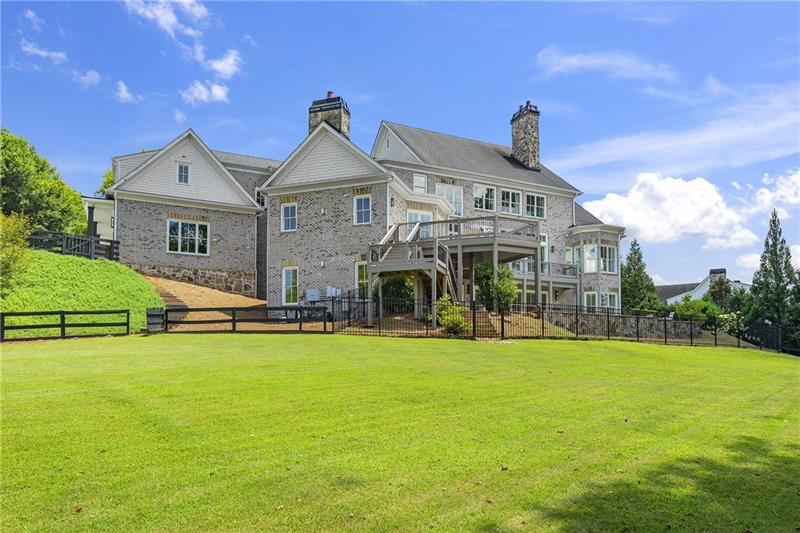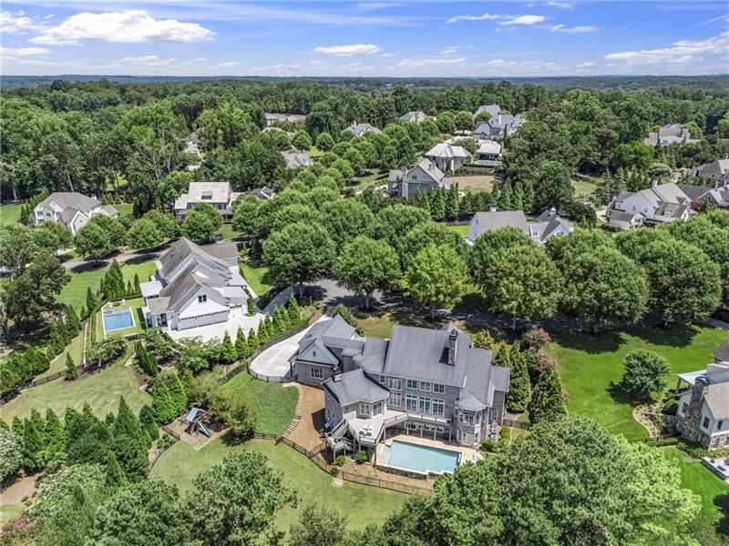 Set on meticulously landscaped acreage in gated neighborhood of The Hayfield, known for its gas lantern street lights, tree- lined drive and copper mailboxes, this distinguished residence blends timeless architectural beauty with elevated upgrades throughout. A sweeping front porch lit by gas lanterns opens into a radiant two-story foyer. To one side, a private study with French doors and board and batten paneling offers a peaceful retreat. Opposite, a formal dining room features an exposed brick accent wall and French doors to the front porch-perfect for entertaining or quiet evenings. The main living room unfolds beneath a coffered ceiling, centered around a stately fireplace with custom built-ins. French doors flood the room with natural light and open to a sprawling rear deck, ideal for entertaining. The gourmet chef's kitchen is a true showpiece: custom white cabinetry to the ceiling, dual oversized islands topped with 3-inch marble, and a dramatic gas fireplace add warmth and elegance. Premier appliances include a Sub-Zero refrigerator, Wolf six-burner range with double ovens, two Bosch dishwashers, and a Sub-Zero wine refrigerator. A farmhouse sink and sunny breakfast area overlook the private backyard, while a walk-in pantry - with a second refrigerator, coffee/appliance bar, and abundant storage - offers unmatched convenience. A second friend's entry on main with charming dutch door leads to the main level laundry room, large mudroom with 6 built-in sections, and two half baths round out the main living areas with both function and style. The main-level owner suite is a serene retreat with bay window seating alcove, wood-beamed ceiling, and marble-surround fireplace. The spa-inspired owner's bath features dual marble-topped vanities, a freestanding soaking tub set against a dramatic glass-tiled accent wall, a marble shower, water closet with bidet, and a custom walk-in closet with built-ins and a large central island. Upstairs, a centrally located secondary primary suite or upper bonus features vaulted ceiling, custom built-ins, and a luxurious en suite bath. The upper holds five additional bedrooms each with en suite baths as well as a convenient second laundry room. Tucked between two upper bedrooms you will find a private flexible area that would work well for a study space, reading area or upper play zone. The finished terrace level offers stylish entertaining and everyday comfort. A full kitchen and lounge flow into a second family room with a whimsical playhouse. A spacious guest bedroom, a gym with spa-like bath, and a movie room with built-in speakers create versatile living spaces. A flex room awaits your vision-whether wine cellar, art studio, or meditation space. A storm room with reinforcement offers the potential for a secure space for safe room, gun room or storage. Additional space is entered from media that lends itself to optional golf simulator room. French doors open to the covered patio and a resort-style saltwater gunite pool with tanning ledge. A level lawn is bordered by mature trees, a playset, and lush landscaping. In 2023, the grounds were refreshed with new sod, irrigation, wood fencing, and vibrant plantings-hydrangeas, roses, and sculpted hedges. Upgraded exterior lighting creates a magical ambiance at dusk. An oversized three-car side garage accommodates SUVs, golf carts, or recreational gear with ease. The home is set in the most popular trio of schools including Milton, Northwestern and Birmingham Falls. Located in the quiet, sought-after neighborhood of The Hayfield with walkability (back walkway in neighborhood with it's own gate) to The Union Restaurant and Bar and just minutes from Downtown Crabapple/Milton, Downtown Alpharetta, and Avalon-this is a home where luxury, comfort, and convenience meet. Welcome Home! (The primary image has been digitally altered to show the home painted white).