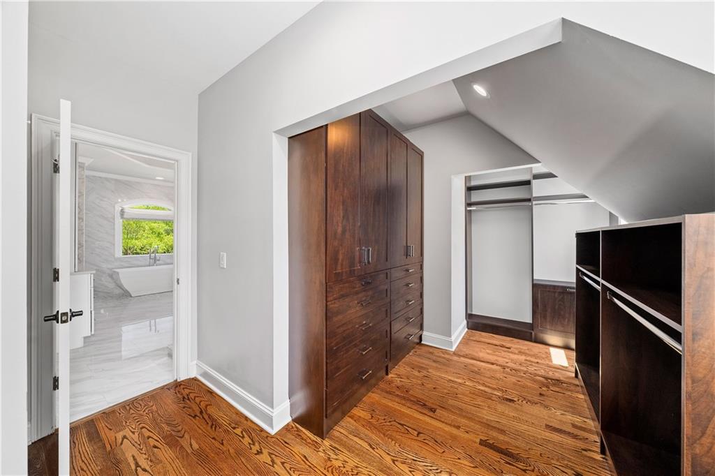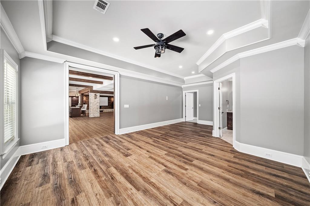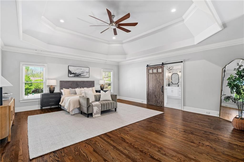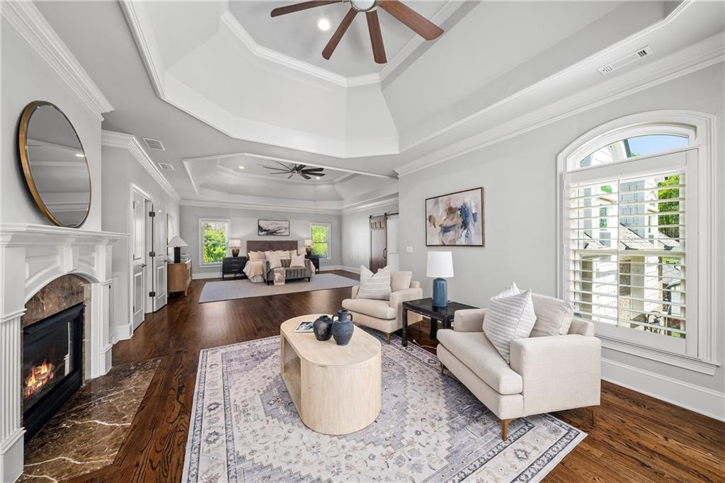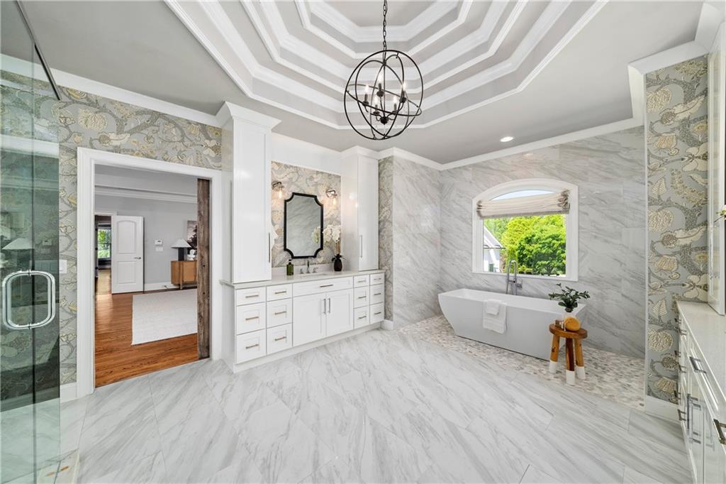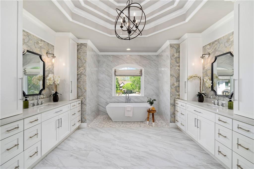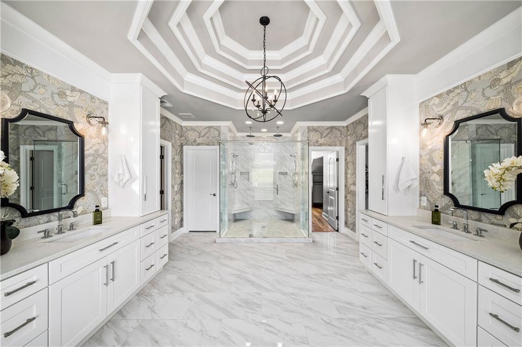 The main level hosts a private guest suite, while upstairs, four spacious en suite bedrooms provide luxurious comfort. The primary suite is a true sanctuary, featuring a spacious fireside sitting room, a custom barn door and a spa-inspired bathroom adorned with elegant marble finishes, dual vanities, an oversized shower with triple rain heads and a freestanding soaking tub. Two custom, walk-in closets complete the retreat. A convenient upstairs laundry room completes this level.