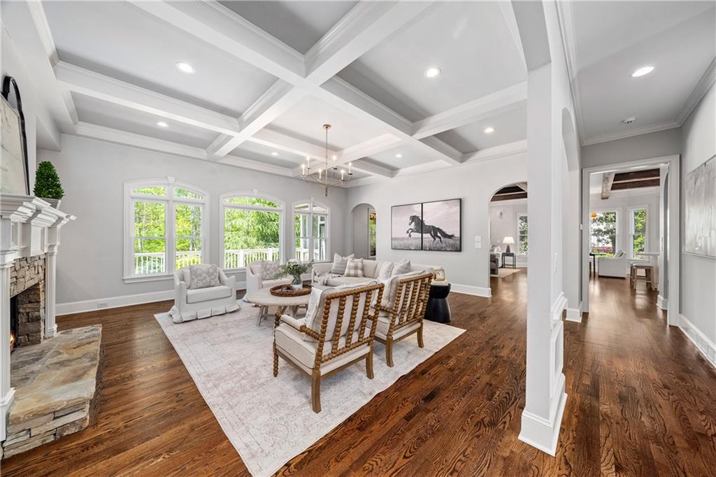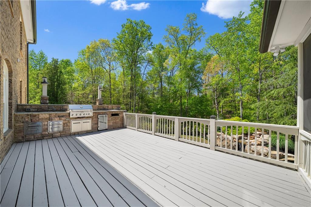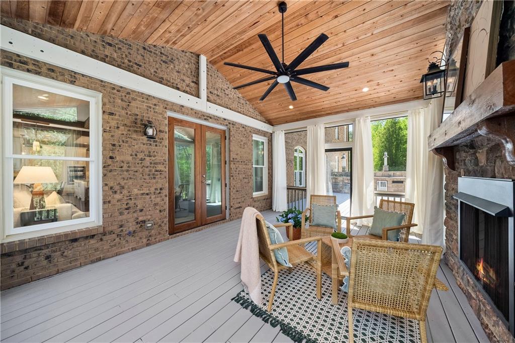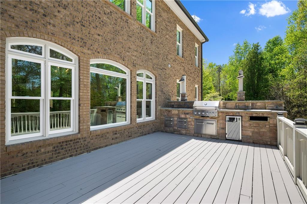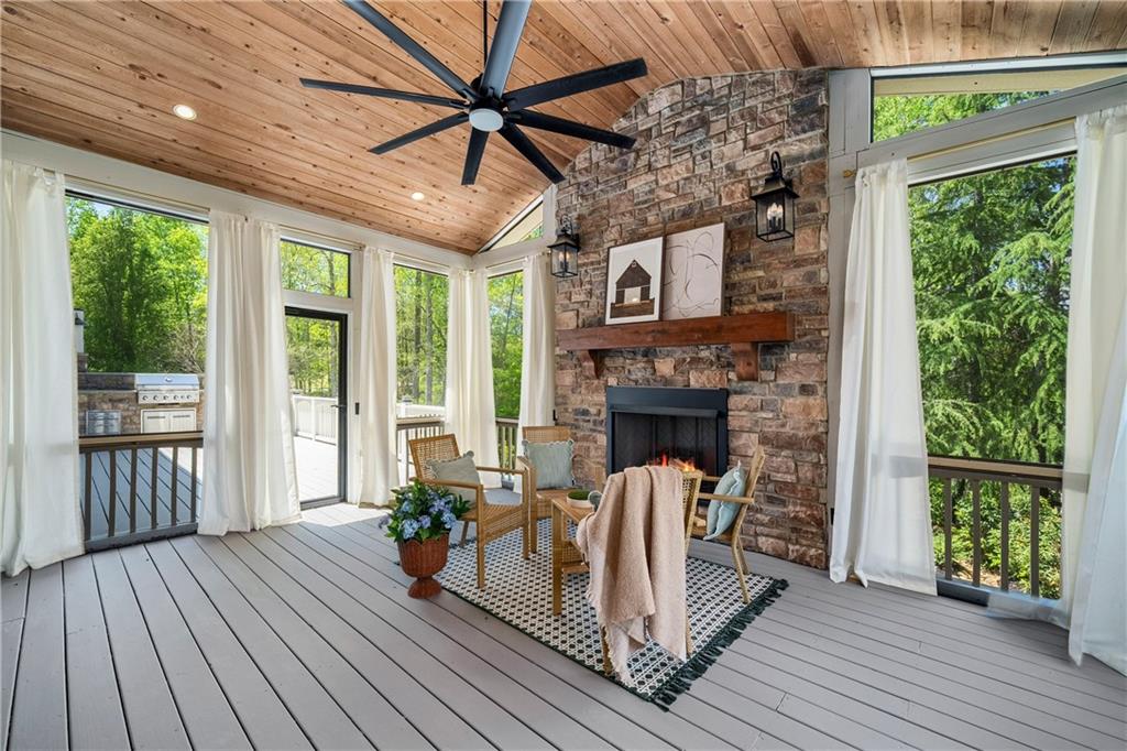 Anchored by a striking coffered ceiling and a stone fireplace, the great room flows effortlessly into the gourmet kitchen--a chef's dream with quartz countertops, a spacious island, a farmhouse sink, professional-grade stainless steel appliances and a concealed floor-to-ceiling pantry. The adjoining breakfast area and keeping room invite, while French doors lead to a vaulted, screened porch with a rustic stone fireplace--an inviting space for year-round enjoyment. The screened porch offers access to the open-air deck, complete with a built-in grilling station, a summer kitchen and a large dining area-perfect for al fresco evenings.