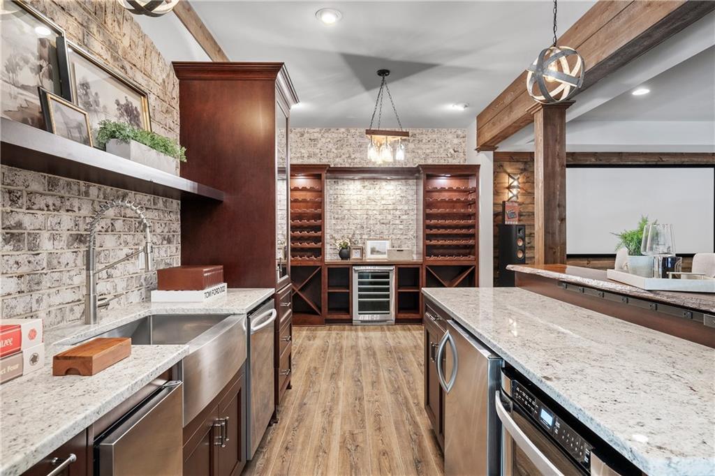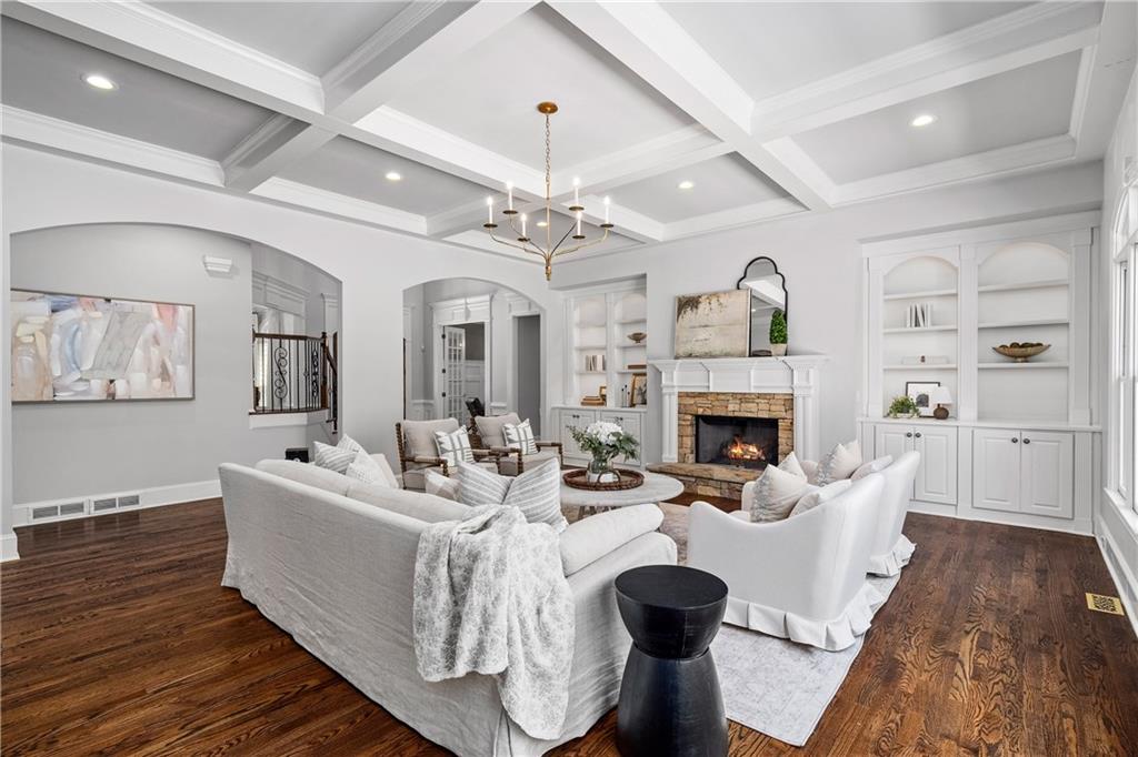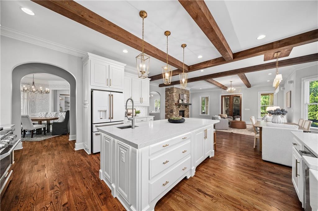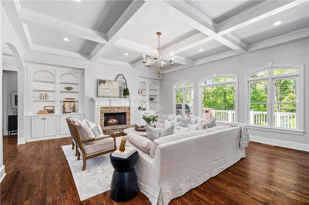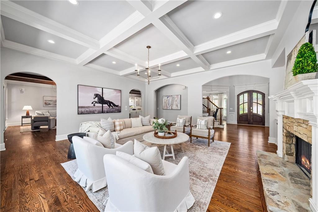 Anchored by a striking coffered ceiling and a stone fireplace, the great room flows effortlessly into the gourmet kitchen--a chef's dream with quartz countertops, a spacious island, a farmhouse sink, professional-grade stainless steel appliances and a concealed floor-to-ceiling pantry. The adjoining breakfast area and keeping room invite, while French doors lead to a vaulted, screened porch with a rustic stone fireplace--an inviting space for year-round enjoyment. The screened porch offers access to the open-air deck, complete with a built-in grilling station, a summer kitchen and a large dining area-perfect for al fresco evenings.