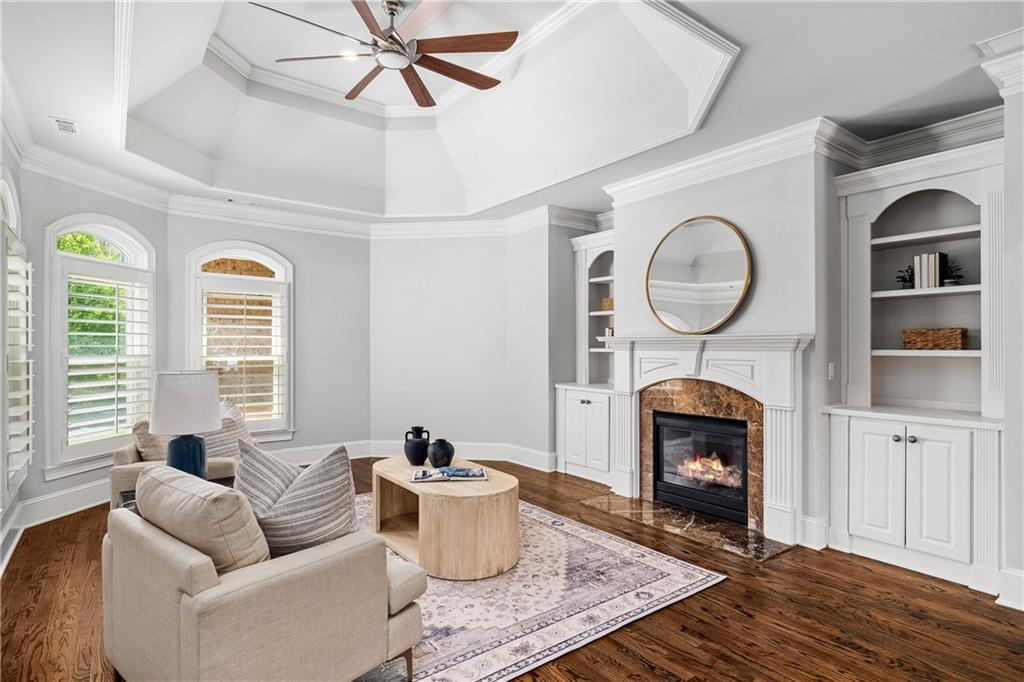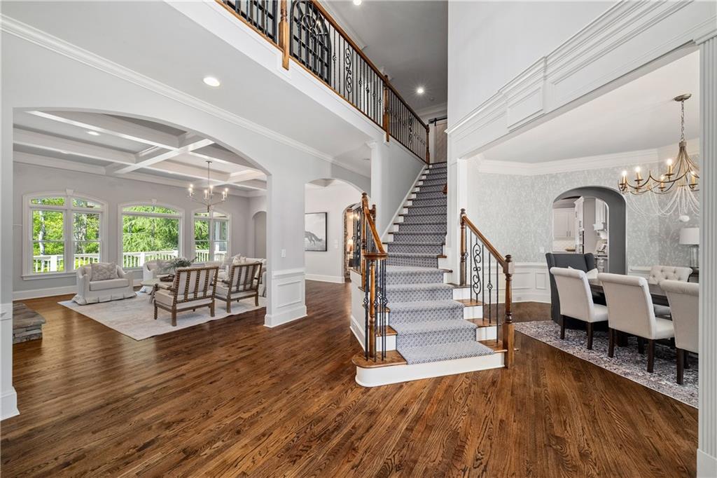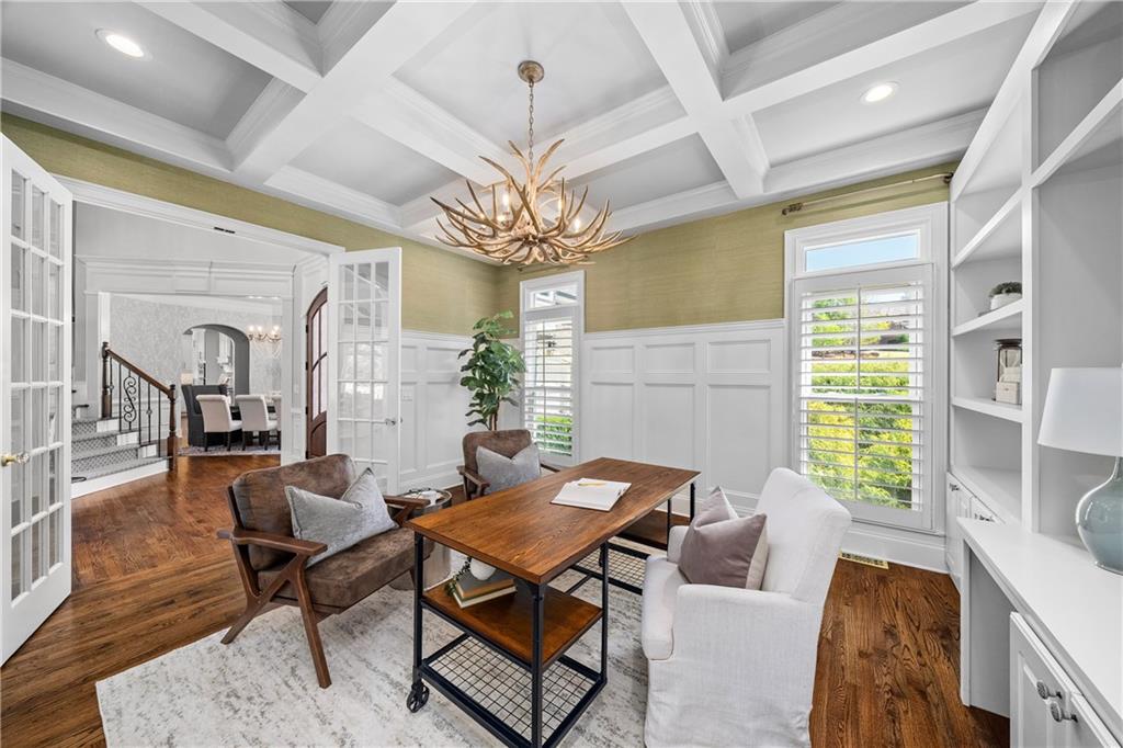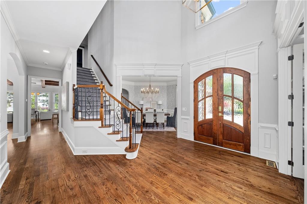 A grand entrance through eight-foot arched double doors opens to a dramatic two-story foyer and sweeping staircase, introducing a bright open-concept floor plan appointed with custom millwork and gleaming hardwood floors throughout. The elegant dining room offers an intimate setting for entertaining, while the handsome office opposite the dining room features built-in cabinetry and a refined coffered ceiling.