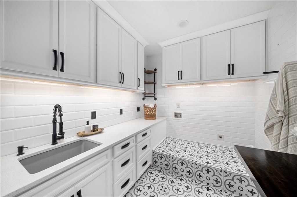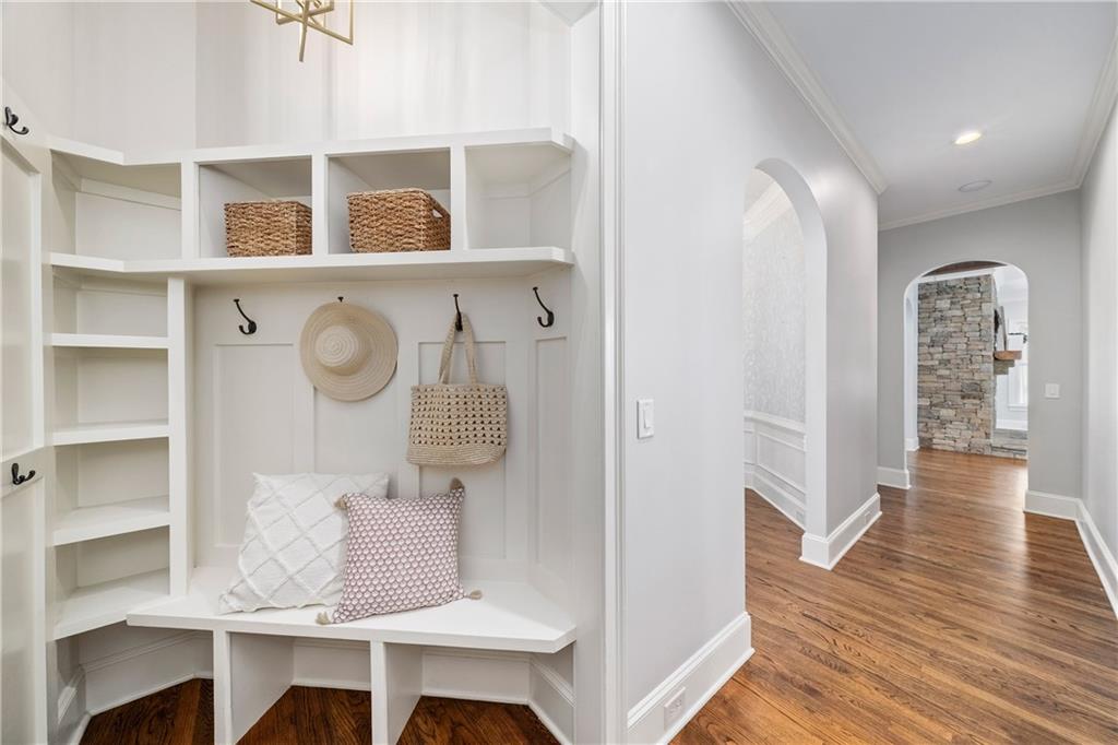 Off the kitchen, enjoy the convenience of a mudroom/drop zone off the three-car garage, featuring Diamond floors, custom cabinetry and a workbench for impeccable organization.