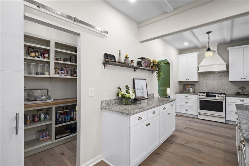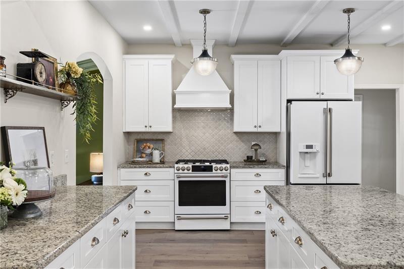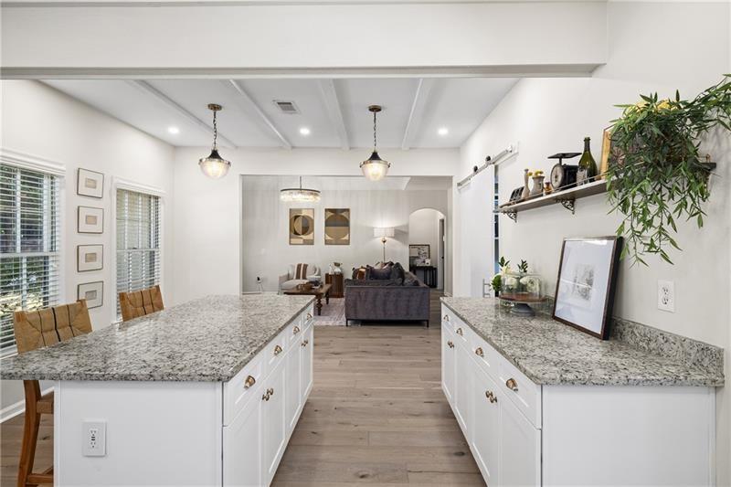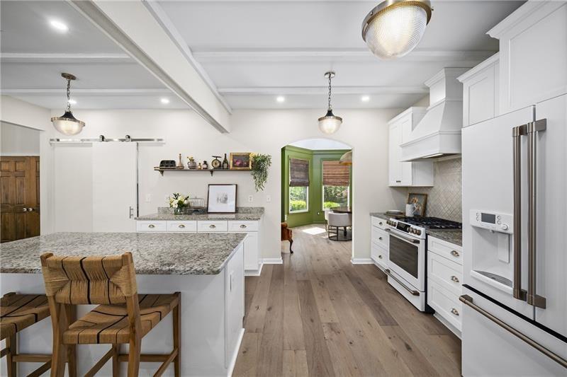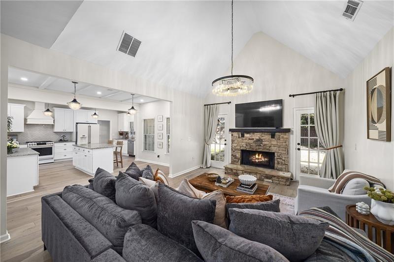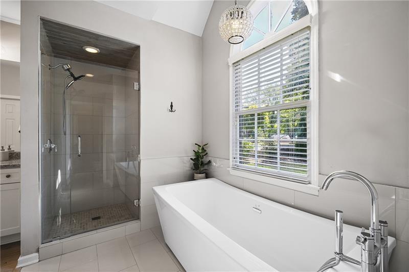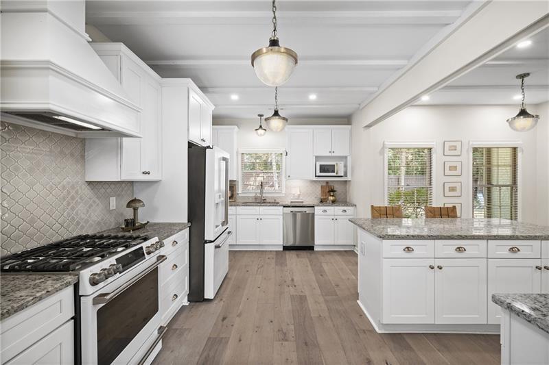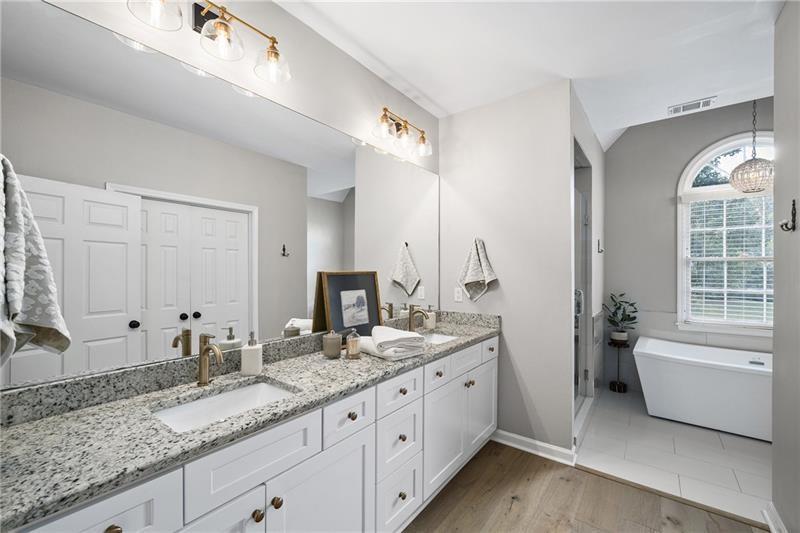 The home welcomes with a gracious entrance foyer and an open flow ideal for both everyday living and entertaining. Anchored by hardwood floors and abundant natural light, the main level features a formal living room, fireside family room, a separate dining room, and an updated eat-in kitchen with stone counters, a large island, and views into the living space. A coveted primary suite on the main offers a spacious retreat with a spa-style bathroom including double vanities and a separate tub and shower.