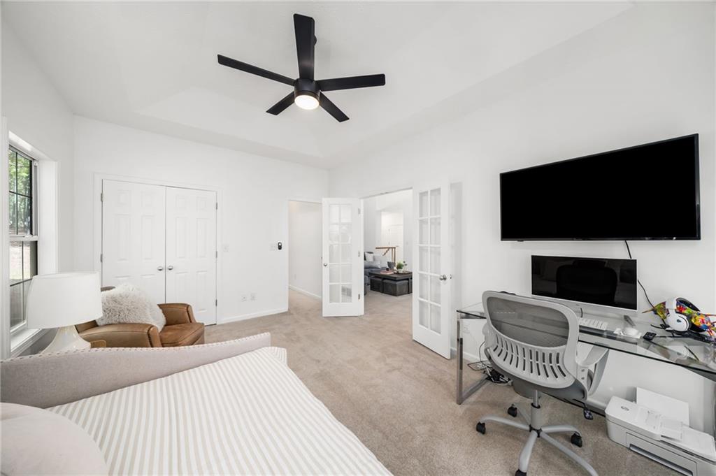 The family room centers on a large fireplace with a gas starter and French doors leading to a versatile flex room--ideal as a study, a playroom or an additional bedroom--with its own private balcony. On the main level, two additional bedrooms share a well-appointed bathroom. The light-filled main-level primary suite enjoys its own wing of the home with French doors out to the deck, a double vanity bathroom with a jetted bathtub and a separate shower. The spacious en suite walk-in closet conveniently connects to the laundry room with a sink and sunny front-facing window.