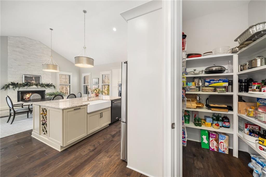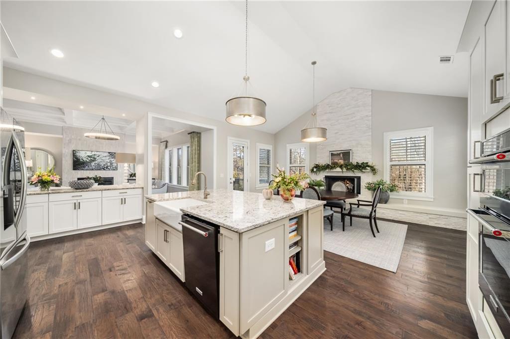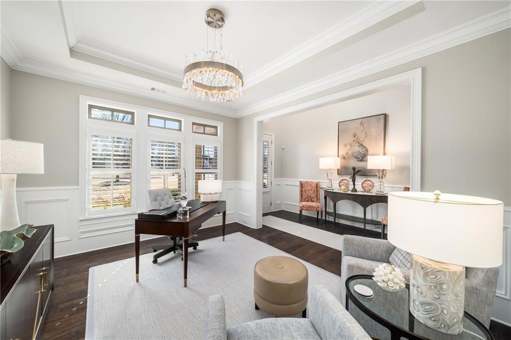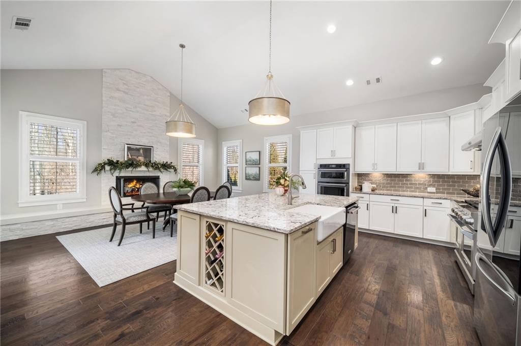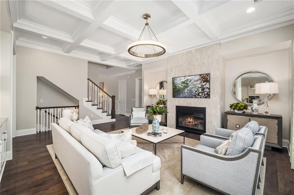 An inviting rocking-chair front porch opens to a light-filled two-story foyer. The main level unfolds with an effortless balance of formal and informal living, including an elegant dining room transformed into a sun-filled study or sitting area with an integrated bar and butler's pantry. An expansive great room with coffered ceiling and stone gas fireplace flows into the chef's kitchen, featuring abundant cabinetry, oversized island with farmhouse sink, a KitchenAid 6-burner gas range with griddle and double ovens, additional built-in oven, microwave, and a spacious walk-in pantry. The kitchen opens seamlessly to a fireside keeping room with built-in window seating and views of the rear grounds. A French door extends the living space to an elevated deck overlooking the saltwater pool, landscaped backyard, and custom, retractable motorized awning.