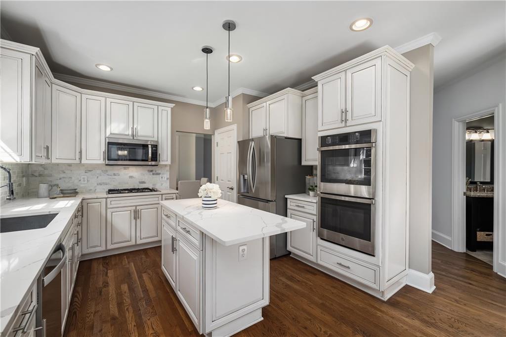 Inside, you'll find a two-story foyer that opens to spacious living and family rooms, with the family room featuring built-in bookcases and a charming brick fireplace. The gourmet kitchen boasts white cabinetry, a large island with Quartz countertops, and double ovens, with a bright, open-concept dining room just off the kitchen. A convenient main-level bedroom with full bath provides flexibility for guests or multigenerational living.