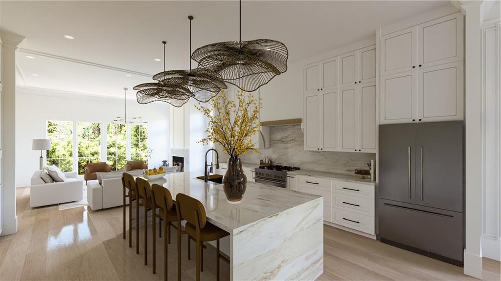 The family room is anchored by a fireplace and framed by numerous windows and doors that open to the back patio, creating a seamless indoor-outdoor experience. The main floor also features the primary bedroom, a true retreat with a spa-like bath showcasing a soaking tub, separate marble-walled shower, double vanities, and a large walk-in closet. Additional main-level amenities include a half bath, a laundry room, and a generous walk-in pantry that can easily be converted into a future elevator (true elevator shaft), as well as direct access to the two-car garage.