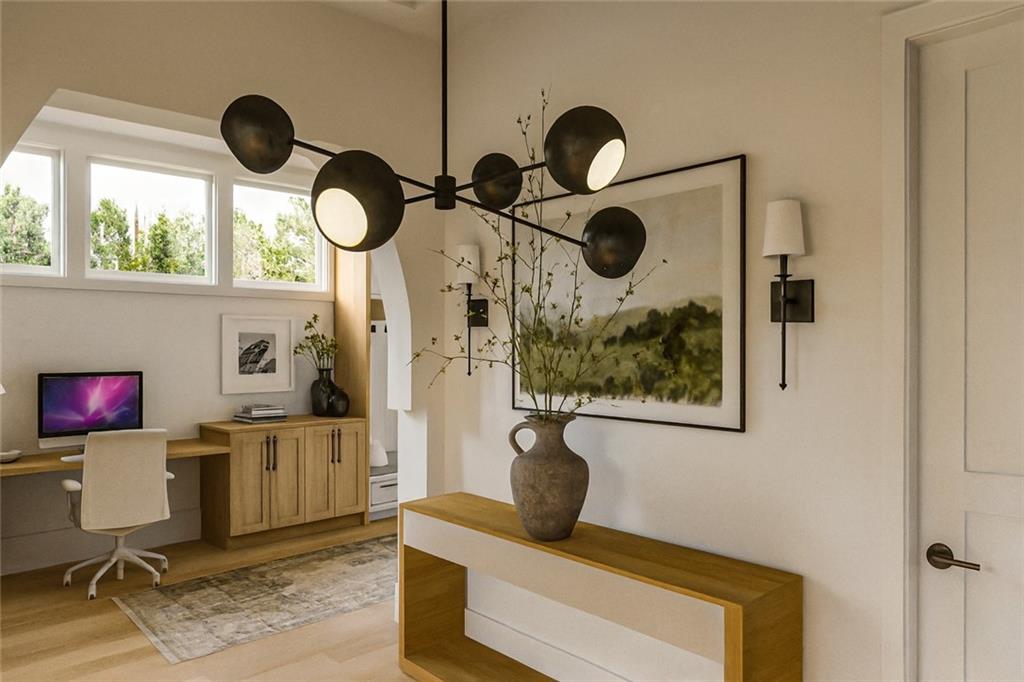 The upper level hosts the serene primary suite, highlighted by abundant natural light and a tray ceiling with detailed wood inlays. The primary bath includes a double vanity, separate frameless shower, and soaking tub. A secondary bedroom with an en suite bath, a generous loft, and a laundry room with a sink complete this floor. Thoughtful upgrades include a custom coffee station, a twin window that fills the kitchen with natural light, and elegant trim details throughout.