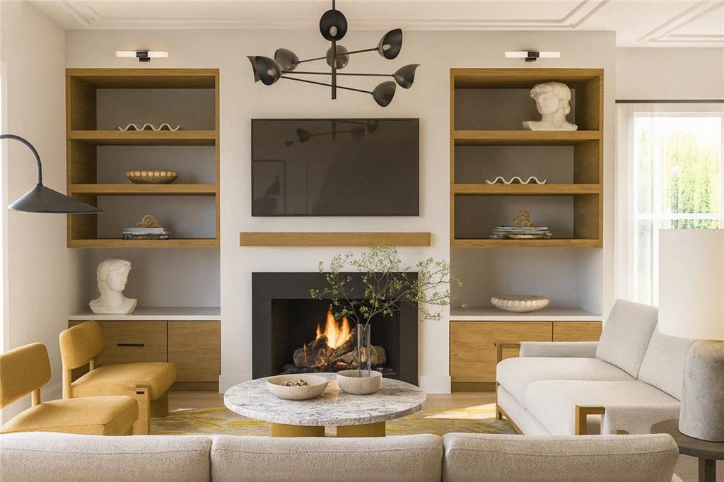 The main level is built for both everyday living and entertaining, featuring a chef's kitchen with an oversized island, a full scullery, and open views to the family room with a fireplace and custom built-ins. An airy dining area seats 8+ and fills the space with natural light. This level also includes a bedroom, full bath, and separate powder room. Multi-slide doors open to a spacious deck with covered and uncovered areas and a fireplace for year-round use.