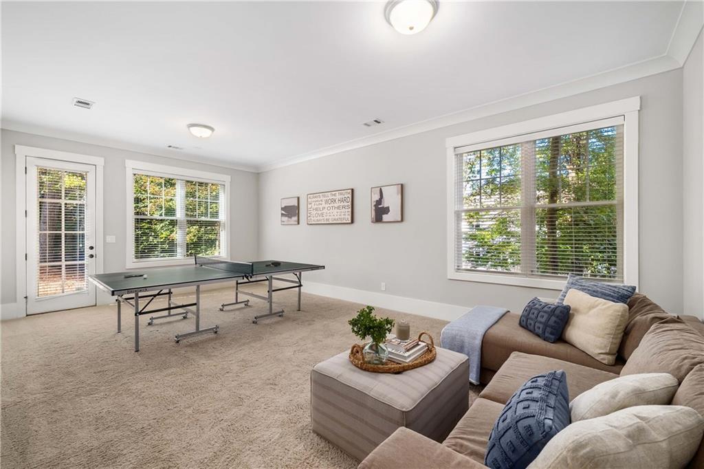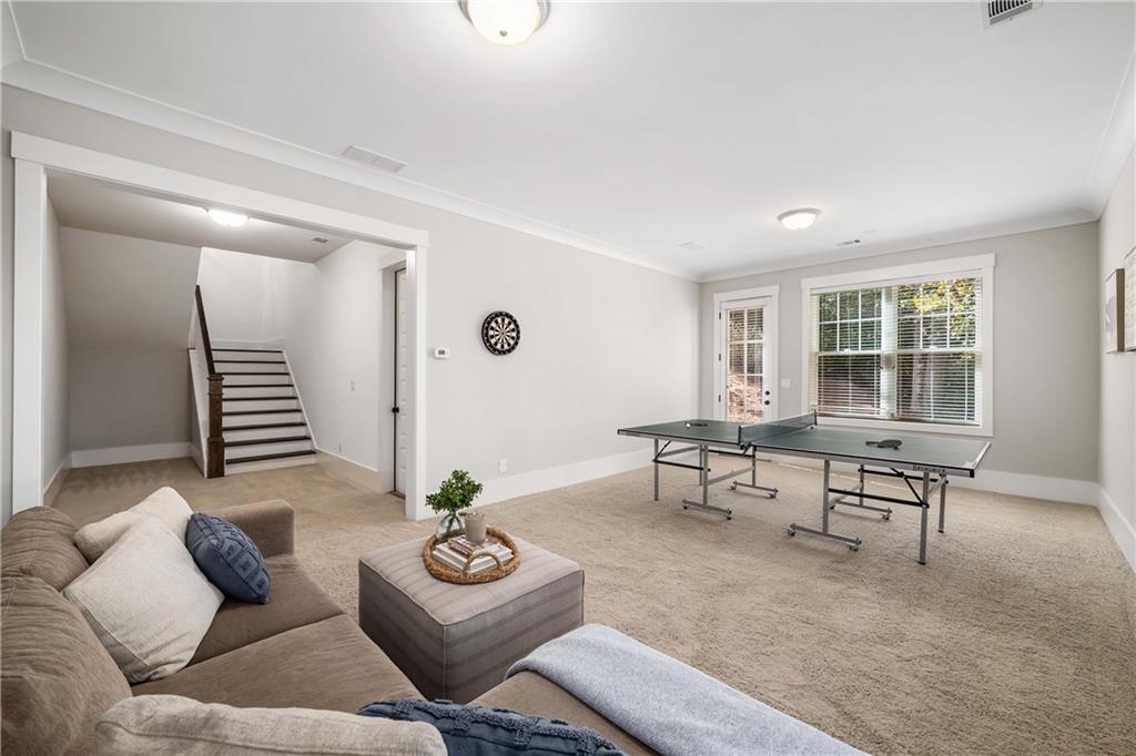 The terrace level, with 9-foot ceilings, expands the living space with a versatile bonus room and generous unfinished areas, perfect for storage or future customization. Additional highlights include wood moldings, an irrigation system, and a neighborhood complete with sidewalks and streetlights. Recent upgrades include a whole-home water filtration system (2025), whole-home surge protector with warranty (2024), a new back deck, and two HVAC units replaced within the past five years.