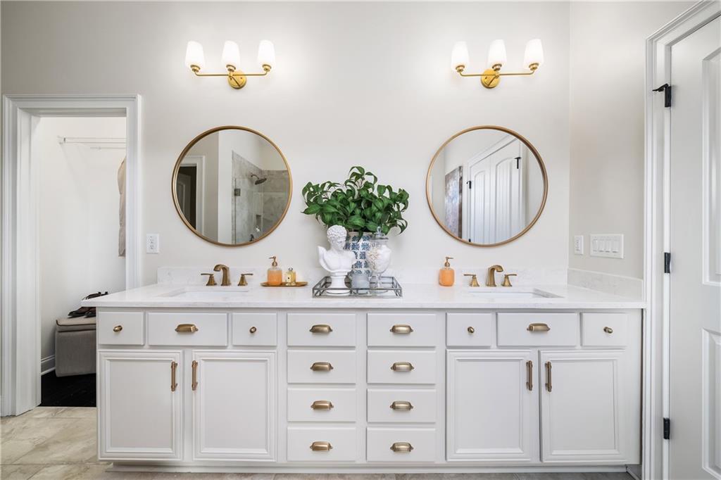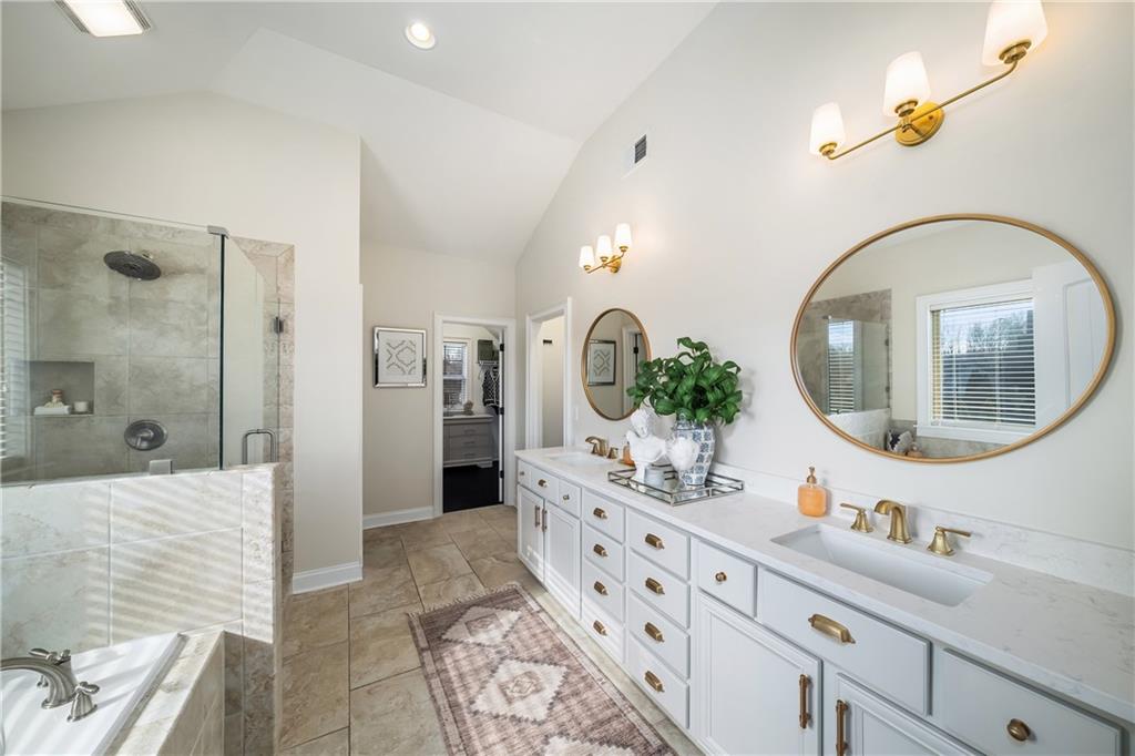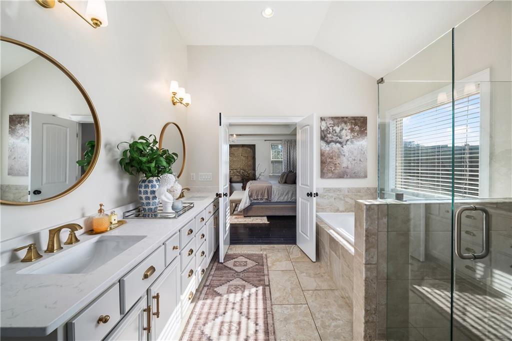 Upstairs, hardwood floors extend throughout the landing and loft area, creating a cohesive and elevated feel. A large open loft offers an ideal space for a television room, playroom or recreation area. The primary suite is a true retreat, featuring hardwood flooring, a tray ceiling and a beautifully renovated spa-inspired en suite bathroom with dual vanities, abundant storage, a seamless glass shower, a separate garden bathtub and a generous walk-in closet. Three additional bedrooms and two bathrooms complete the upper level, each bedroom finished with newer carpet for comfort. A hall bathroom with dual sinks and a conveniently located laundry room complete the level.