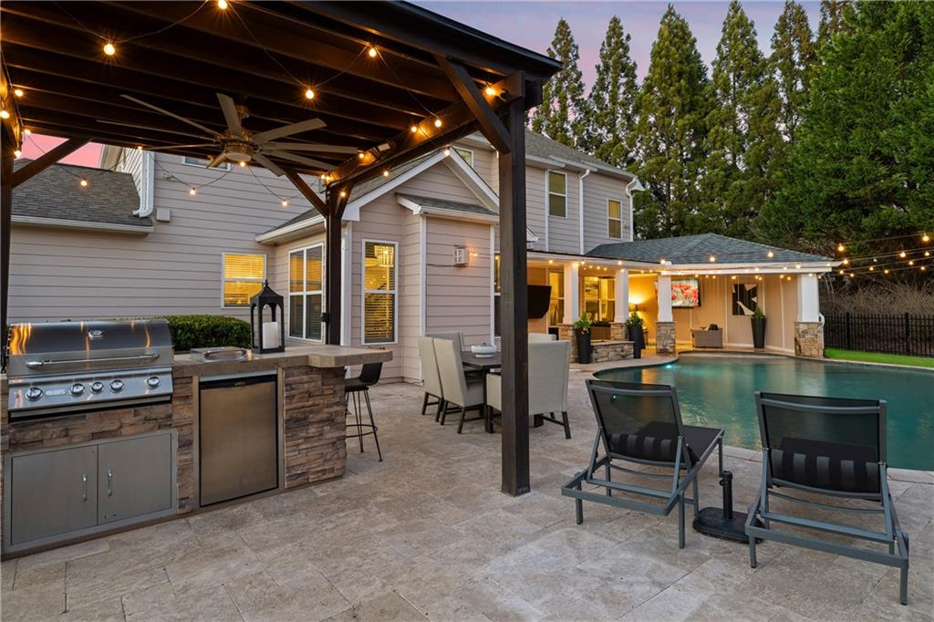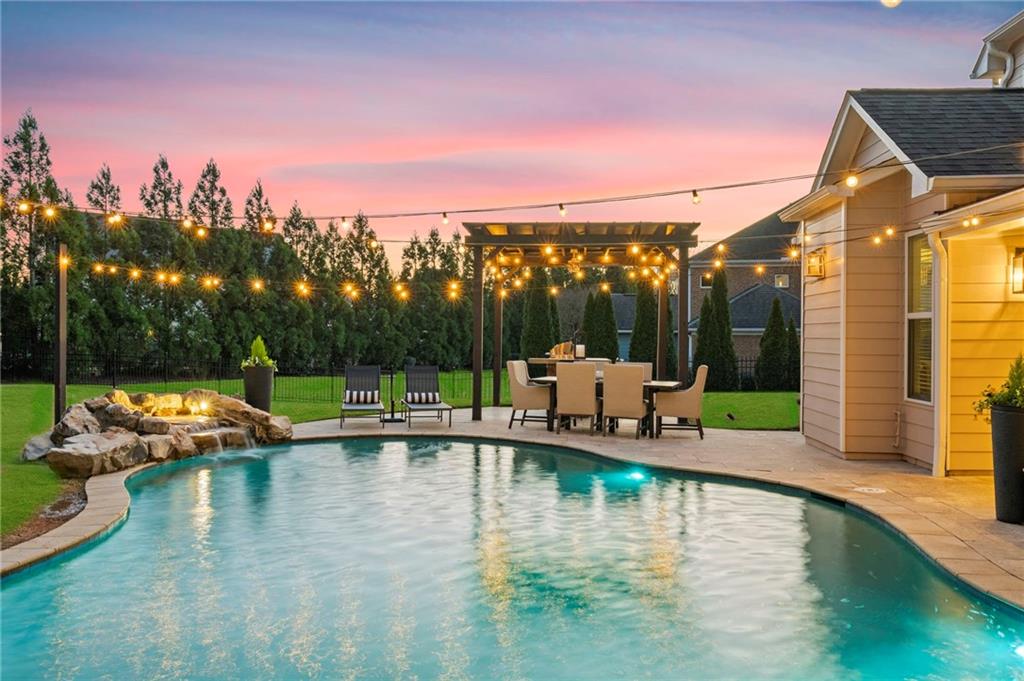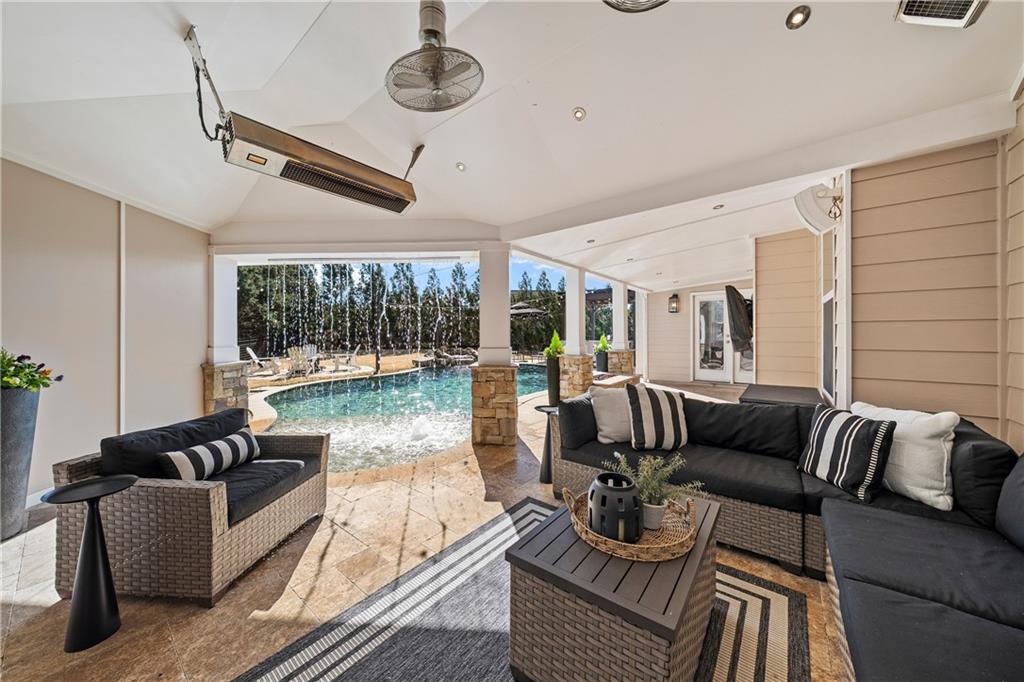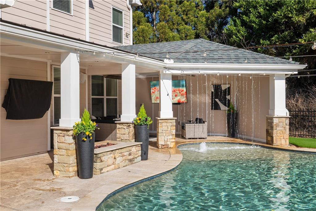 Outdoor living is nothing short of exceptional. A covered patio with ceiling fans, two professional-grade gas heaters and multiple television connections creates an effortless extension of the living space. Beyond, the custom gunite pool with heated saltwater system, waterfalls, a water curtain with lighting and an expansive tanning ledge becomes the focal point of the private backyard. A poured concrete, stone-look seating area offers the perfect setting for Adirondack chairs and a gas fire pit, while a separate covered grilling pavilion with refrigerator and bar seating leads into the large, level, fenced yard, offering space to entertain, relax and enjoy year-round.