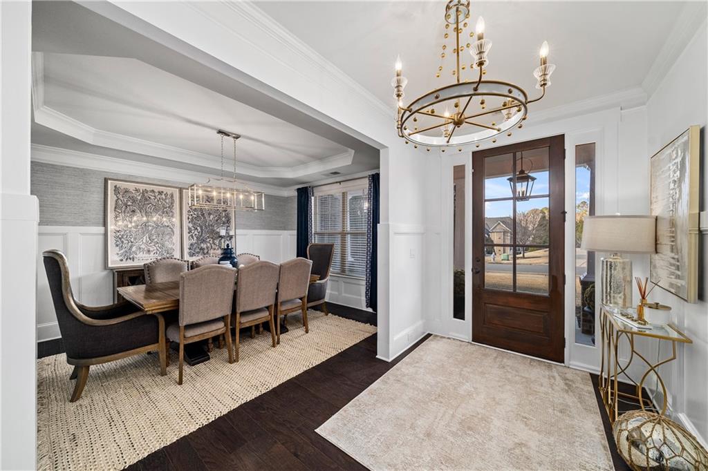 Set within the highly sought-after Marseilles community in West Forsyth, this brick and stone residence immediately impresses with timeless curb appeal, updated exterior lighting and a welcoming covered front porch. Inside, a gracious foyer detailed with board and batten molding continues into the dining room, which features a tray ceiling and an adjoining dry bar. Opposite the dining room, a beautifully appointed office or sitting room with French doors establishes a sense of thoughtful design and balance from the moment you arrive.