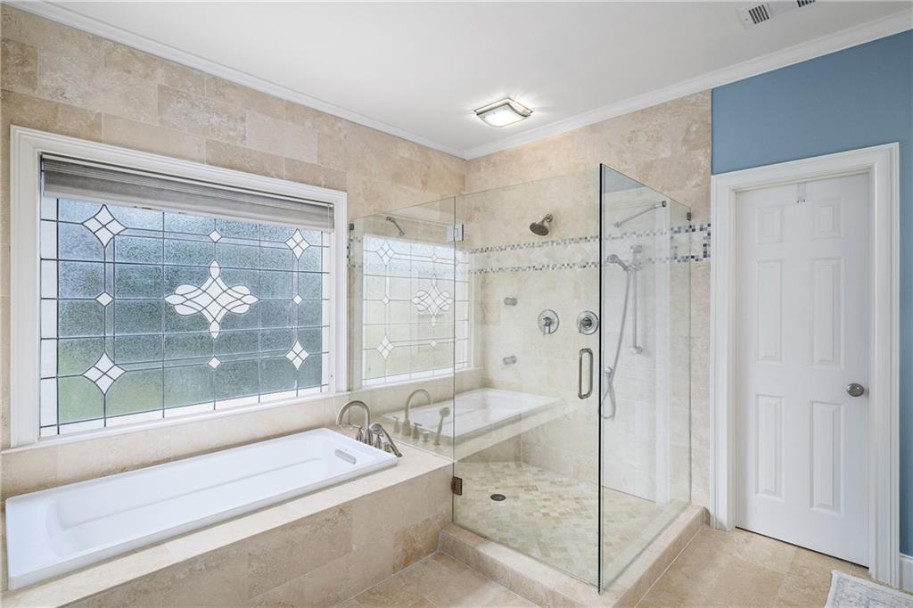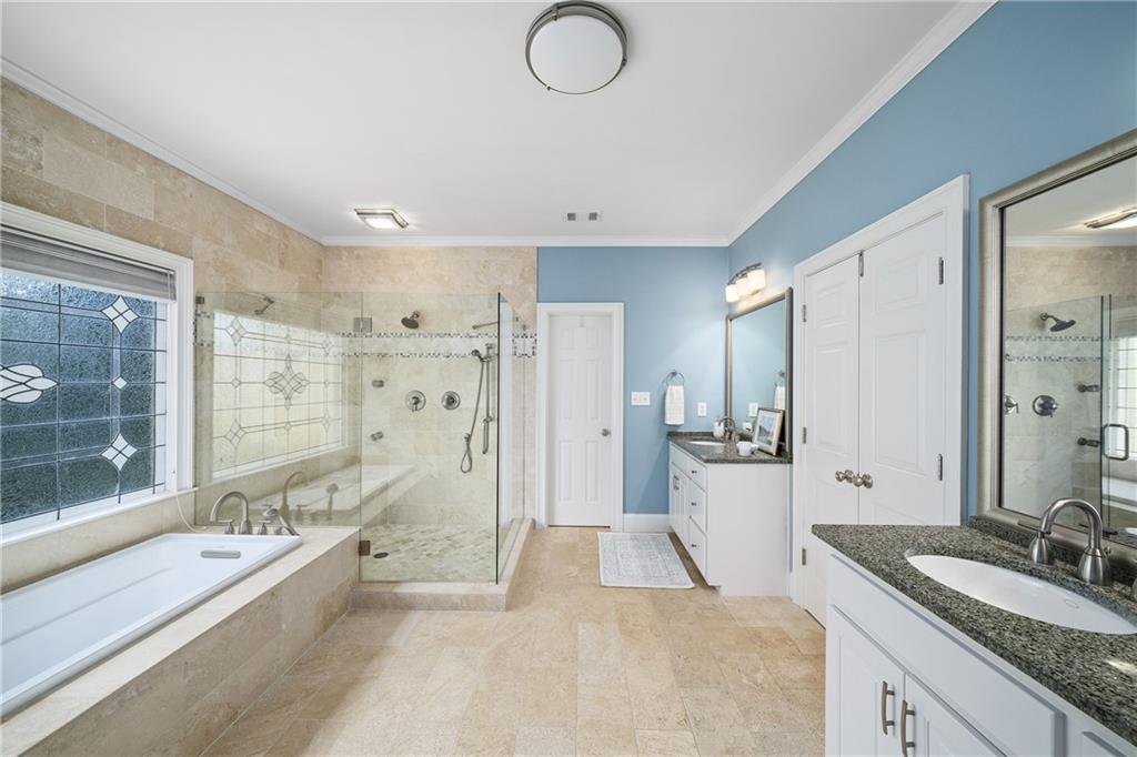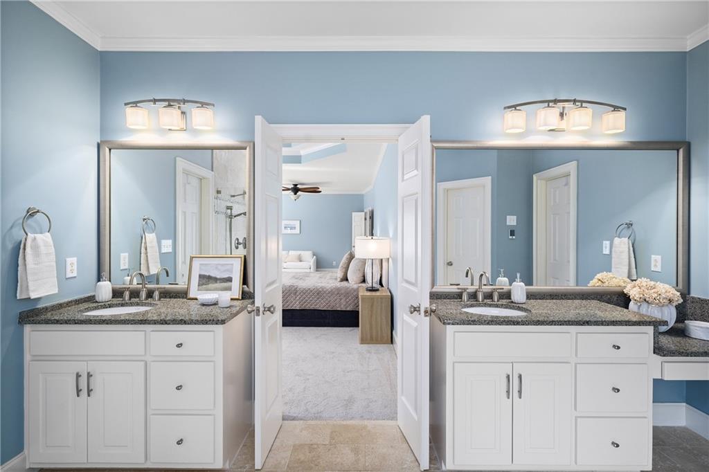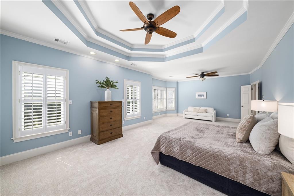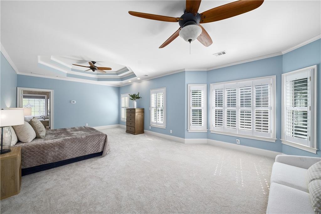 Upstairs, the primary suite offers a spacious retreat with a double-tray ceiling, a sitting area and plantation shutters. The en suite bathroom features dual vanities (one with a makeup station), a soaking bathtub, a frameless glass shower with dual temperature controls and multiple showerheads, plus a walk-in closet and private water closet. Two additional bedrooms share a well-appointed bathroom.