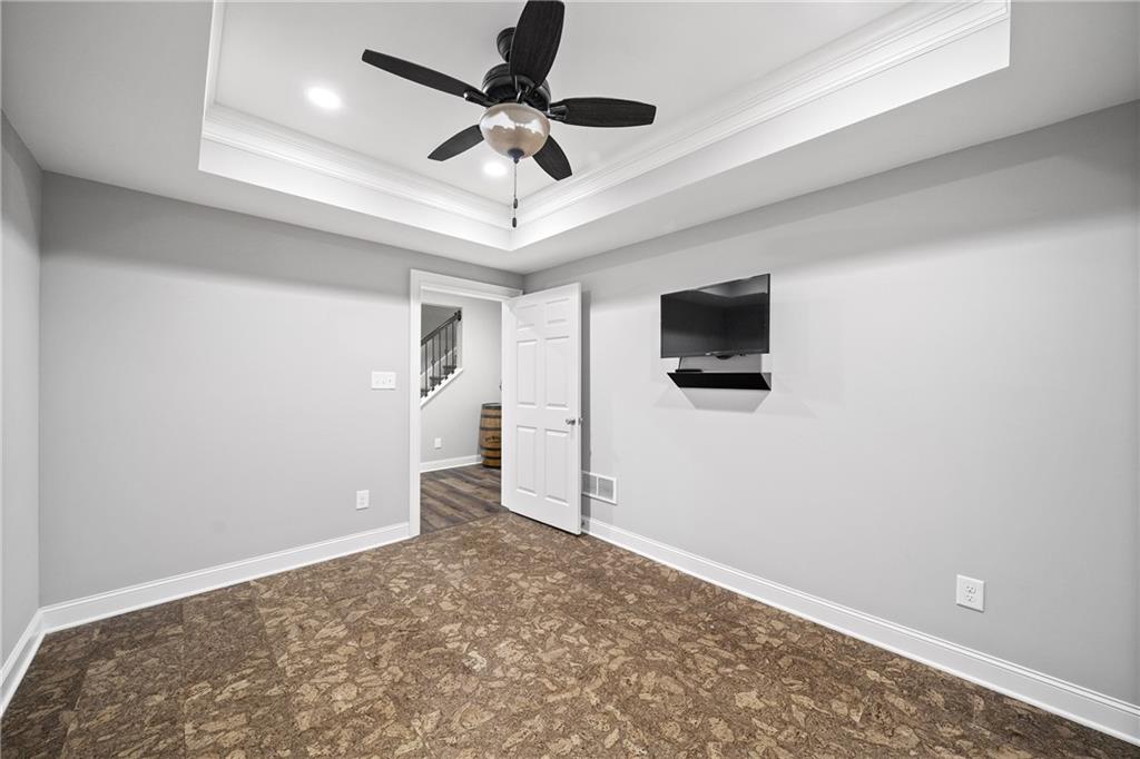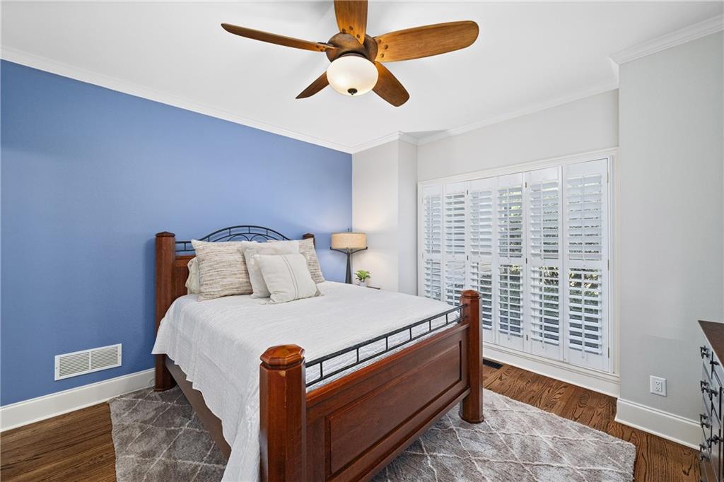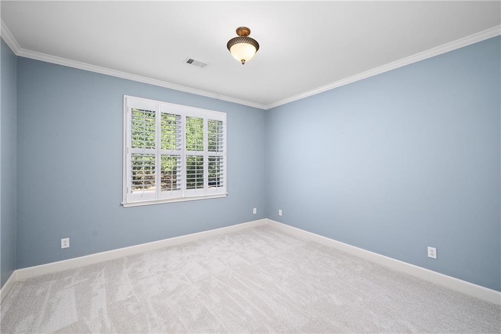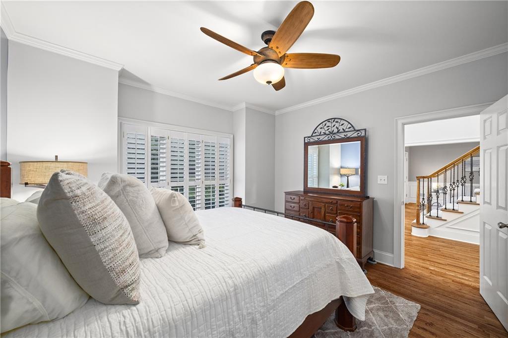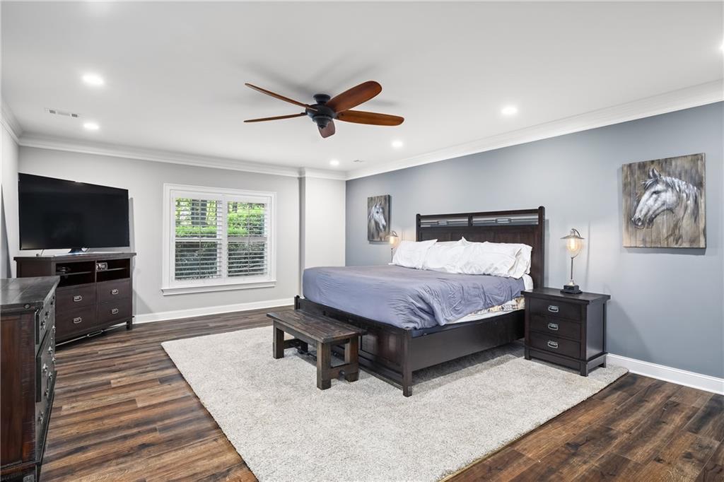 Upstairs, the primary suite offers a spacious retreat with a double-tray ceiling, a sitting area and plantation shutters. The en suite bathroom features dual vanities (one with a makeup station), a soaking bathtub, a frameless glass shower with dual temperature controls and multiple showerheads, plus a walk-in closet and private water closet. Two additional bedrooms share a well-appointed bathroom.