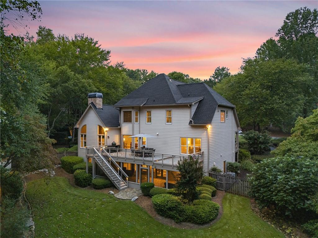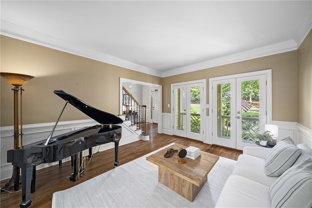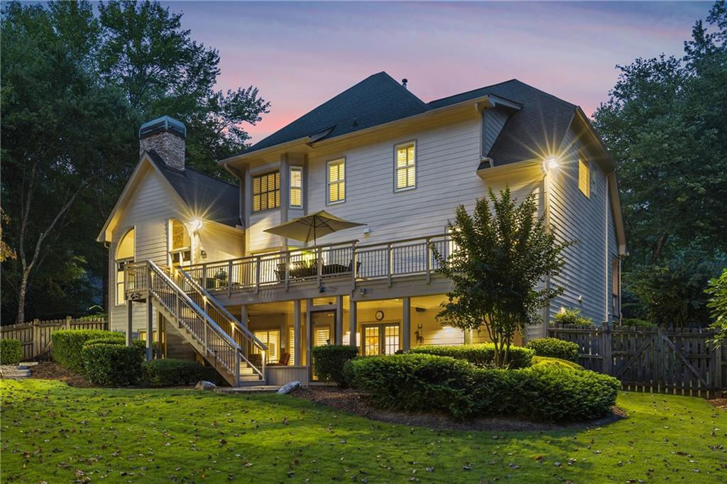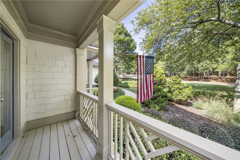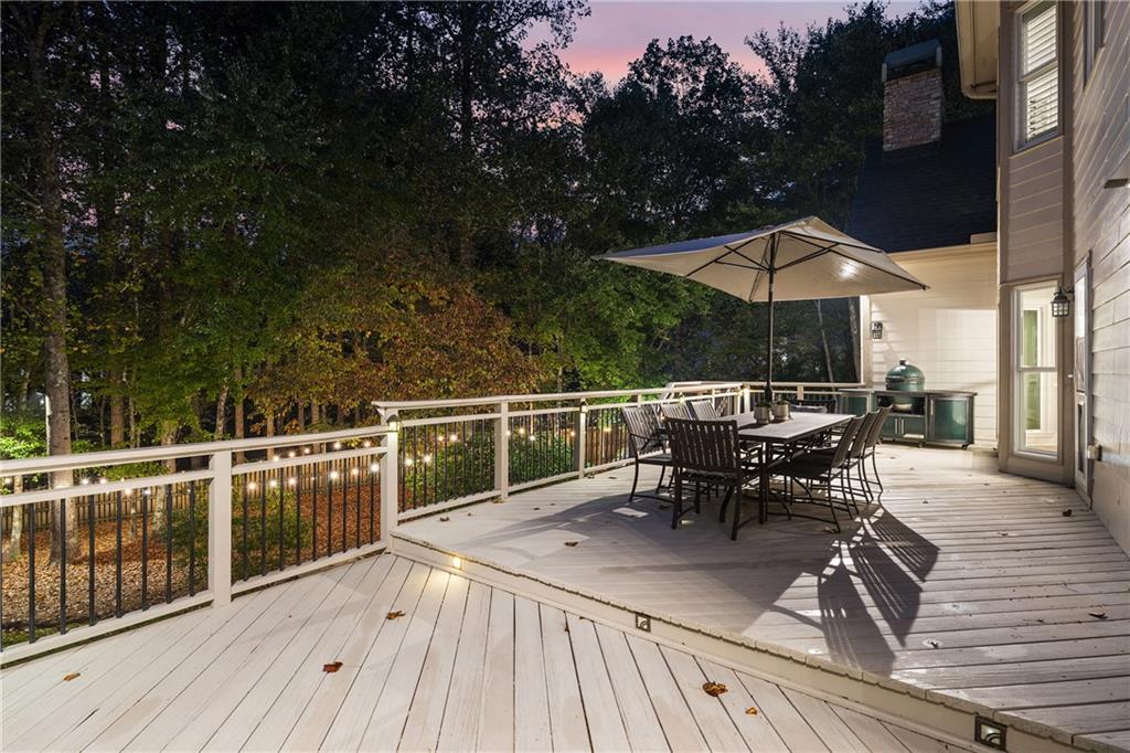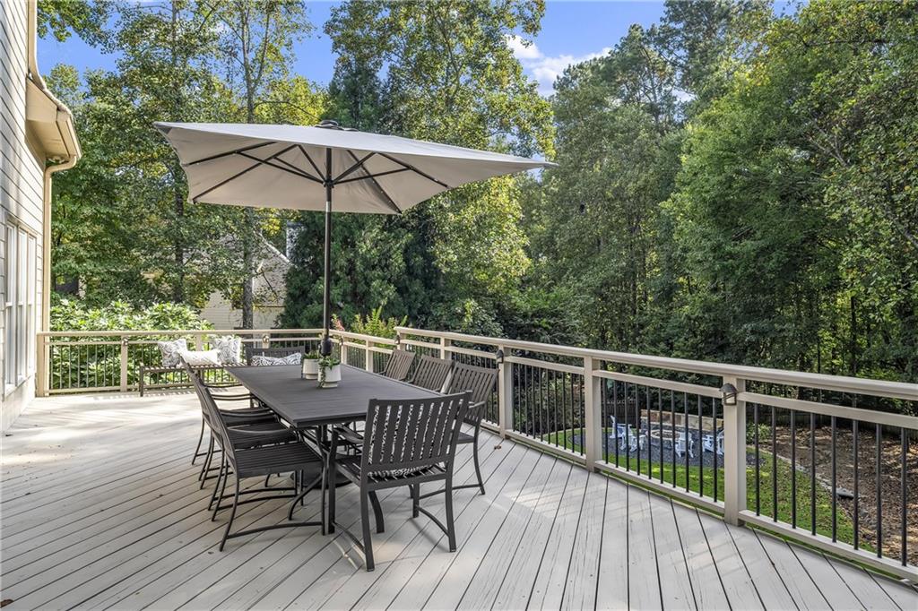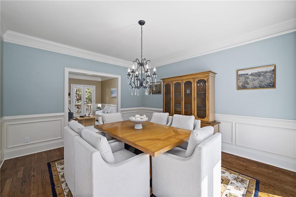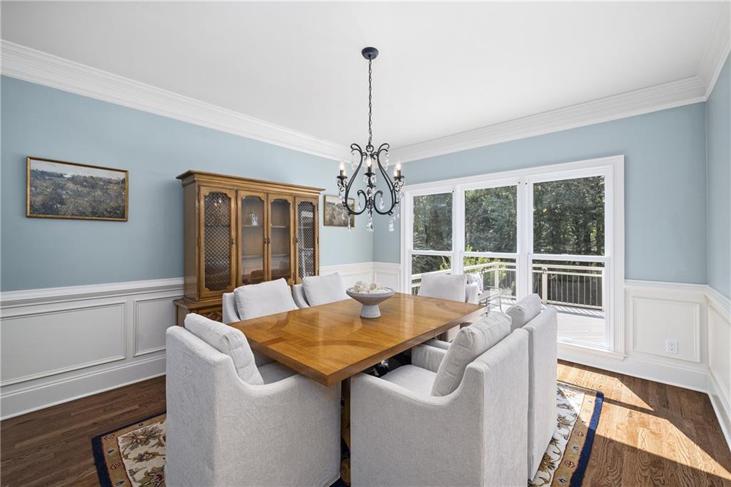 Inside, a soaring two-story foyer introduces hardwood floors, oversized crown molding and wainscoting details that continue throughout the formal living and dining rooms. French doors open from the living room to a private porch, while the inviting dining room enjoys serene views of the rear deck and landscaped yard beyond.