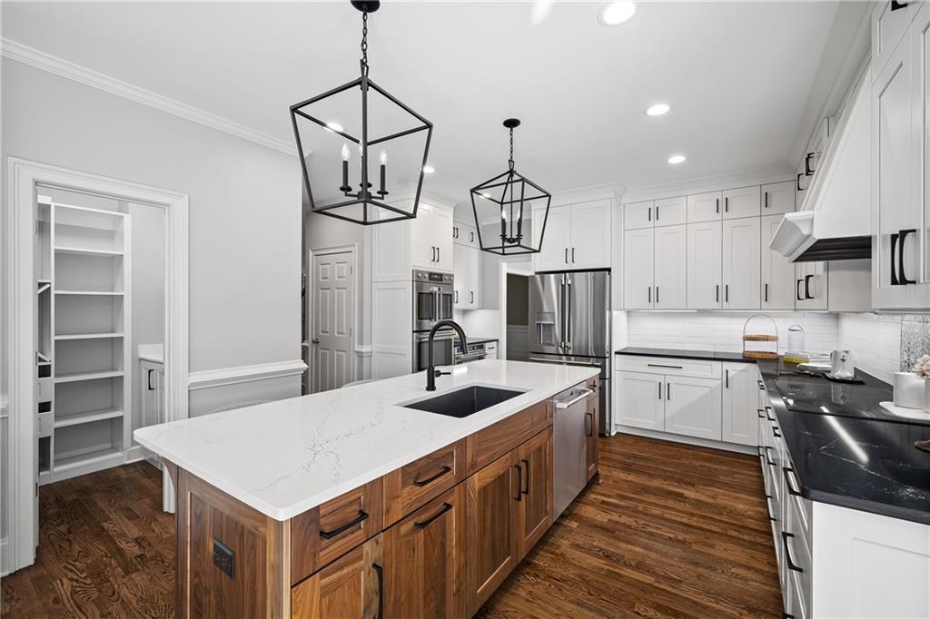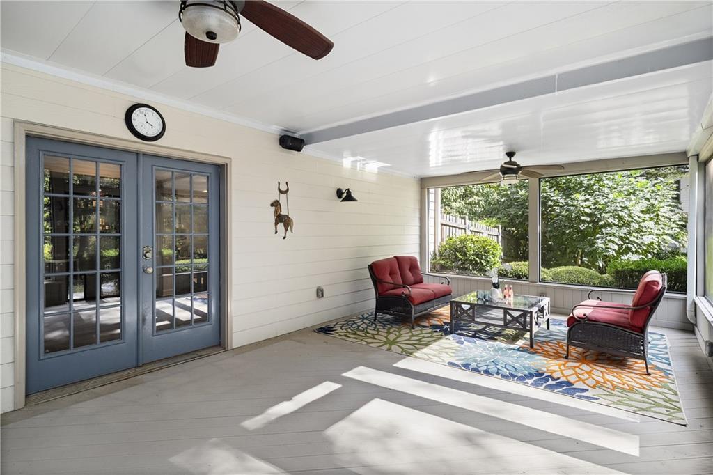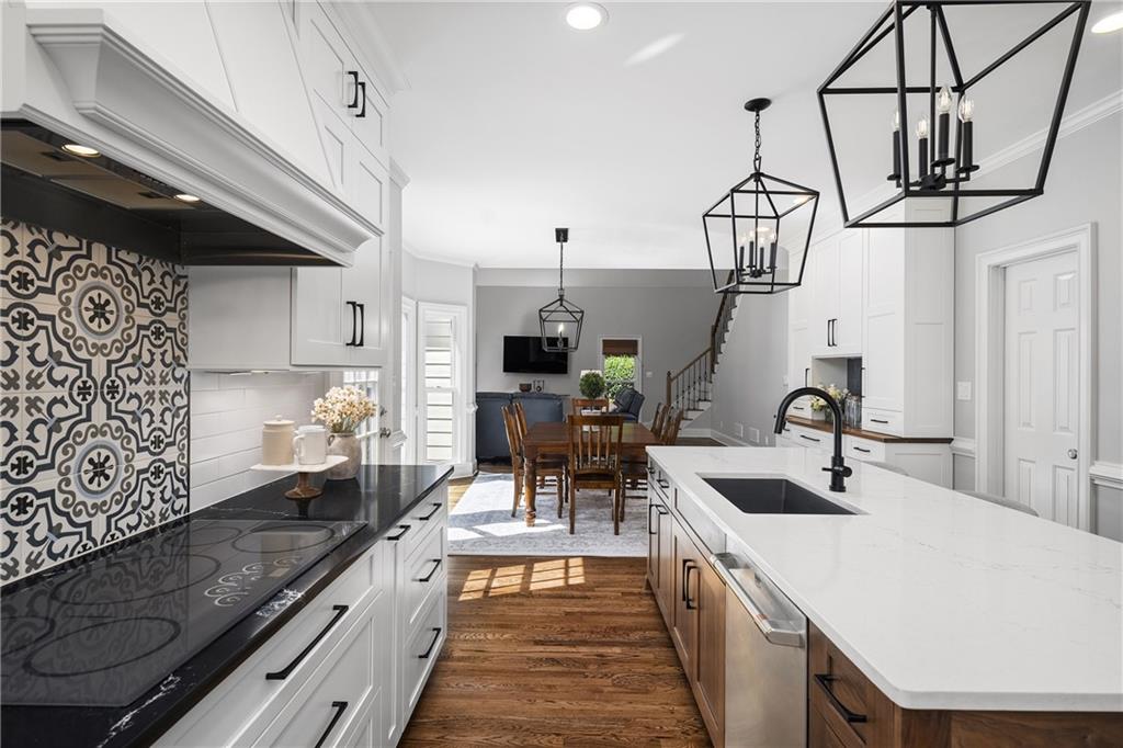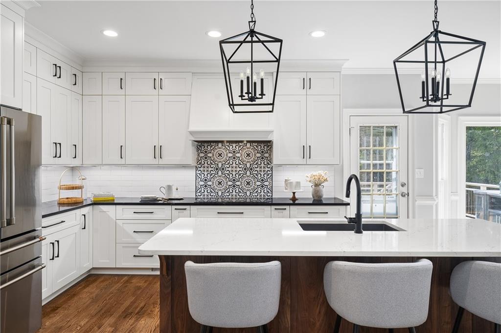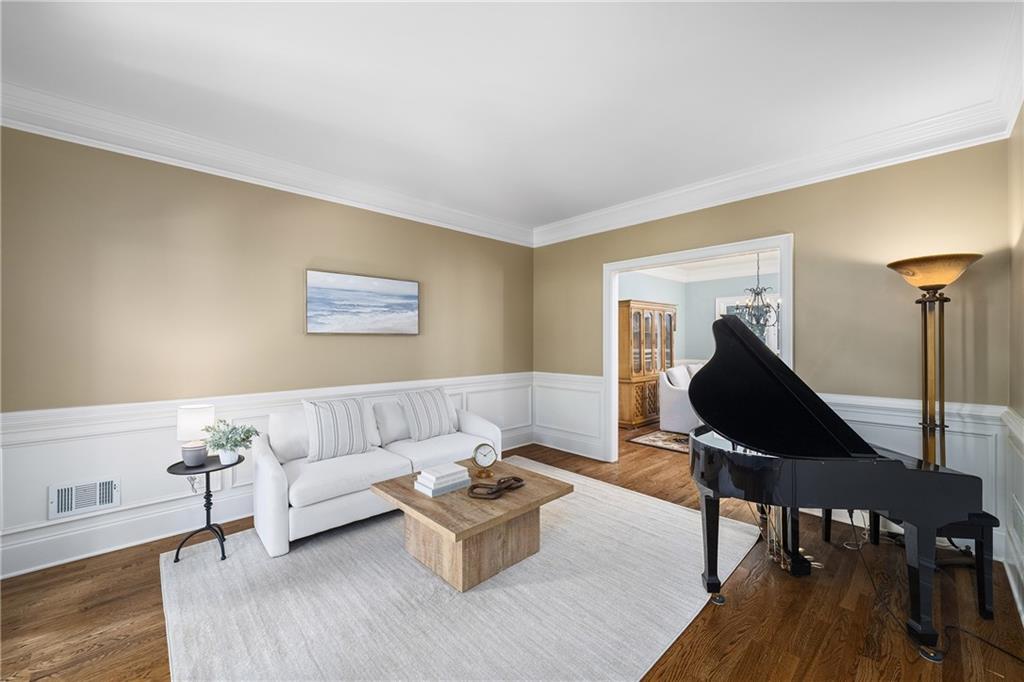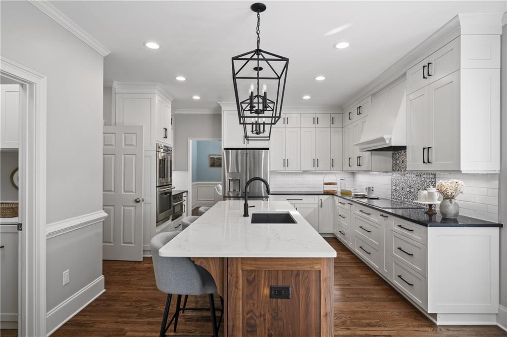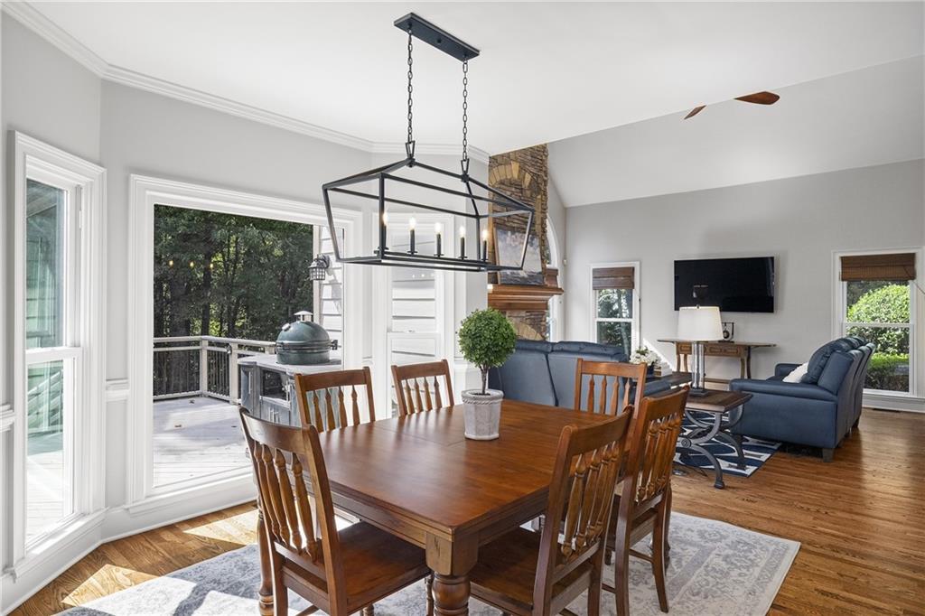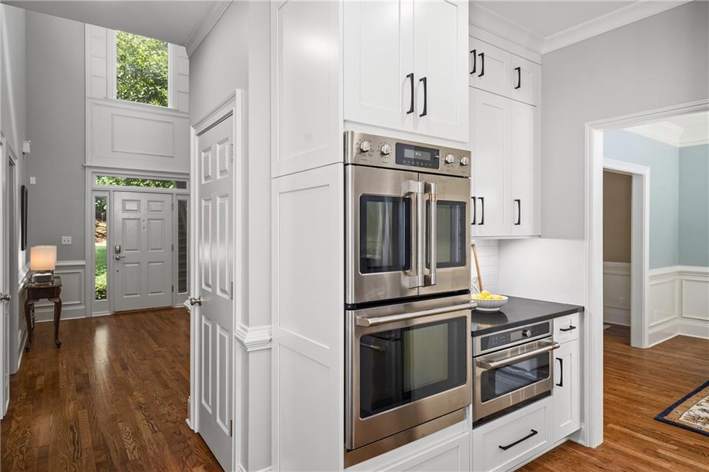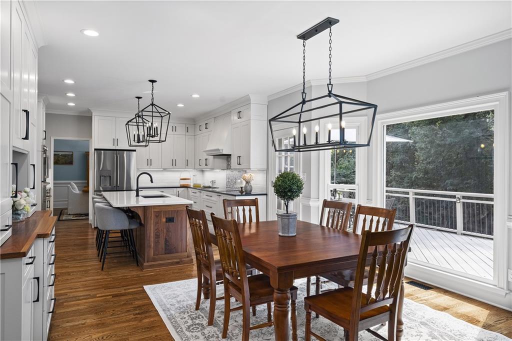 Inside, a soaring two-story foyer introduces hardwood floors, oversized crown molding and wainscoting details that continue throughout the formal living and dining rooms. French doors open from the living room to a private porch, while the inviting dining room enjoys serene views of the rear deck and landscaped yard beyond.