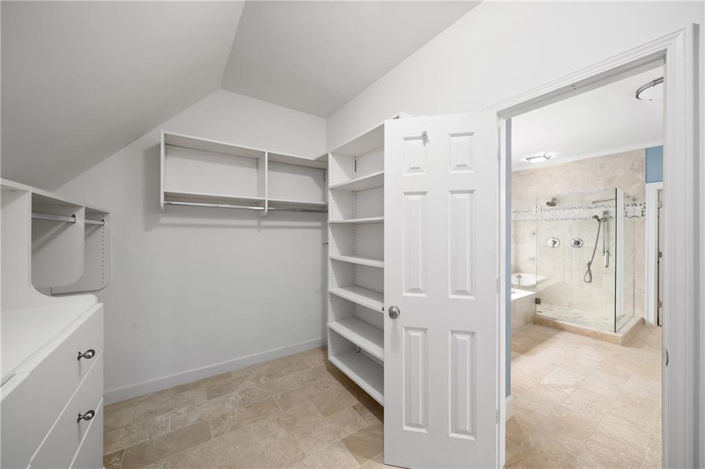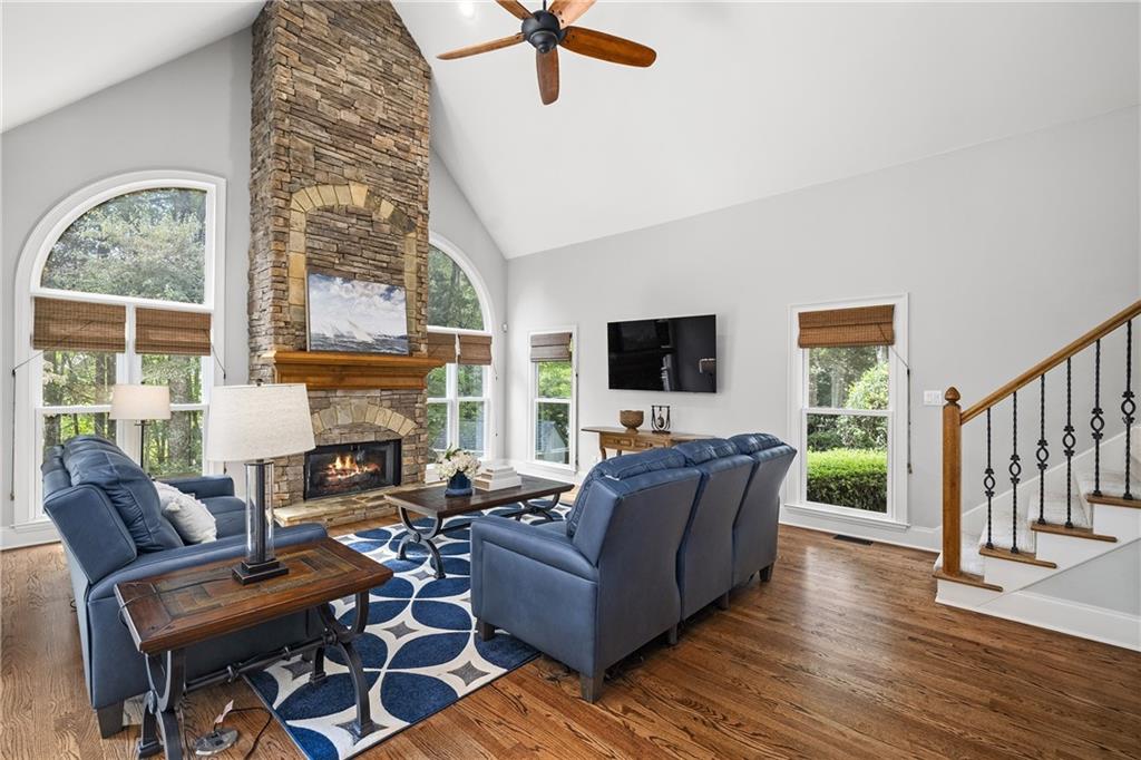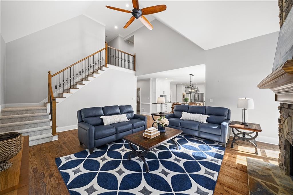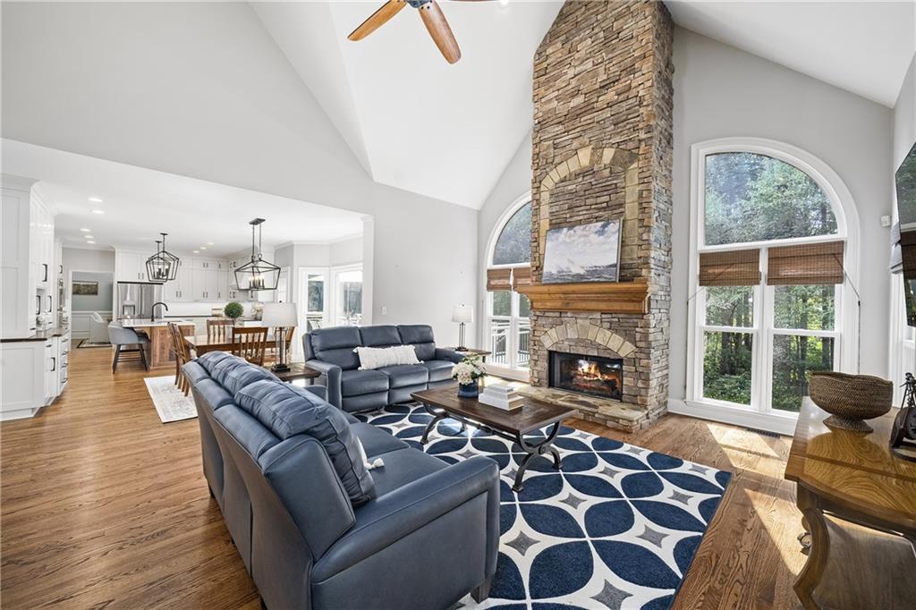 The renovated kitchen serves as the heart of the home, blending function and style with natural wood cabinetry on the center island, white perimeter cabinetry to the ceiling, contrasting quartz and stone countertops, and stainless-steel appliances including an induction cooktop, double wall oven and microwave drawer. A casual dining area with large picture windows and access to the back deck make this a natural gathering place. The adjacent vaulted family room showcases a floor-to-ceiling stacked-stone fireplace and abundant natural light, with a second staircase for convenience. A guest suite, a full bathroom, an update laundry room with storage and access to the three-car garage complete the main level.