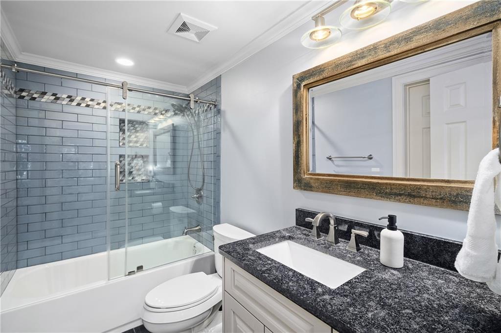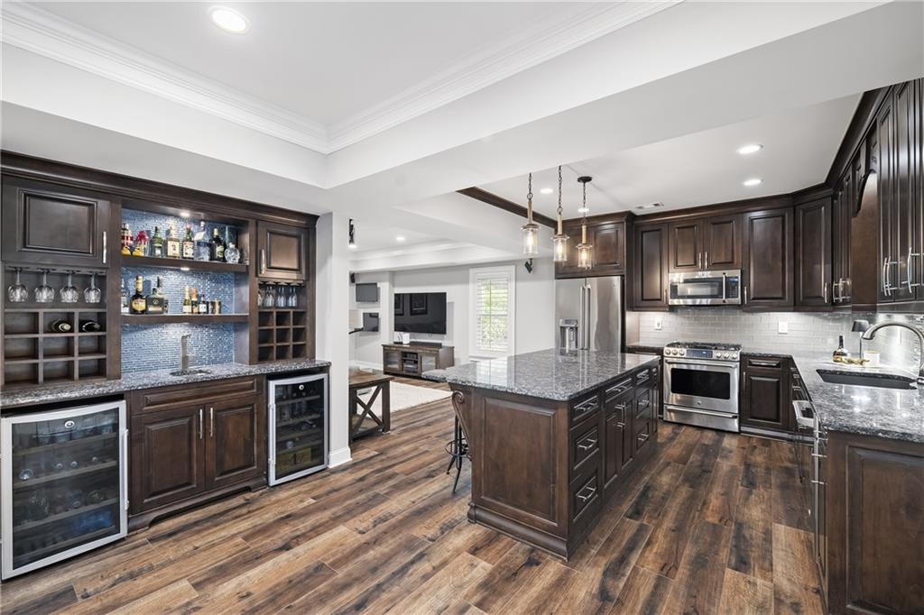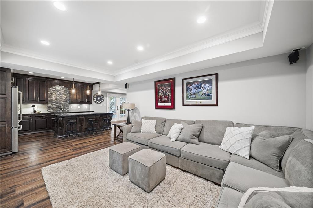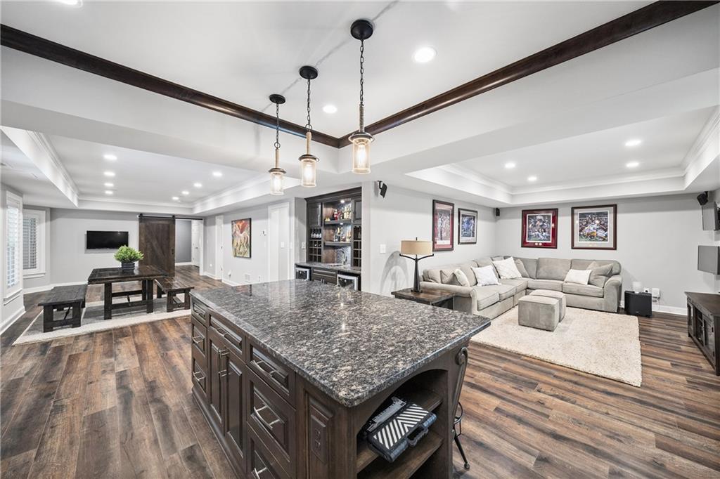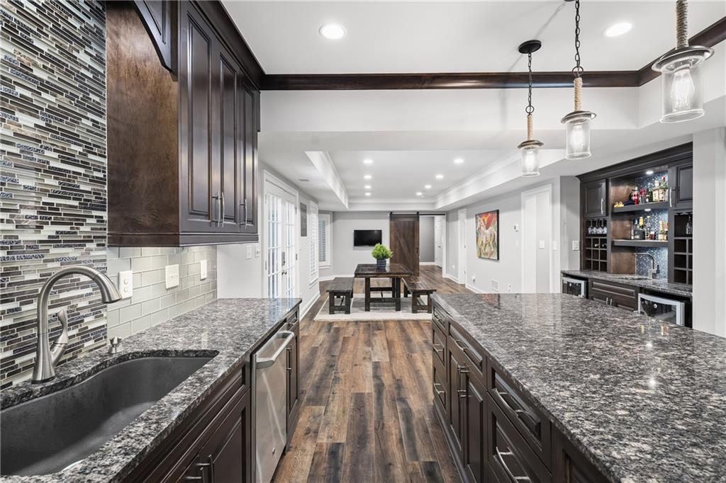The terrace level has been completely reimagined to include a full kitchen with an island, a wet bar with dual wine refrigerators, a dining and living area, a large bedroom, full bathroom and a gym/flex space. Walkout access to the terrace-level screened porch leads to the flat, a fenced backyard with a stone fire pit with stone bench seating and professionally designed landscaping. A second fire pit, paver-lined patio, and vine-covered arbor enhance the side garden. Additional recent upgrades include; new roof, new garage doors, basement dehumidifier, tankless water heater, new carpet, new gutters, exterior painting, new windows and storage shed.