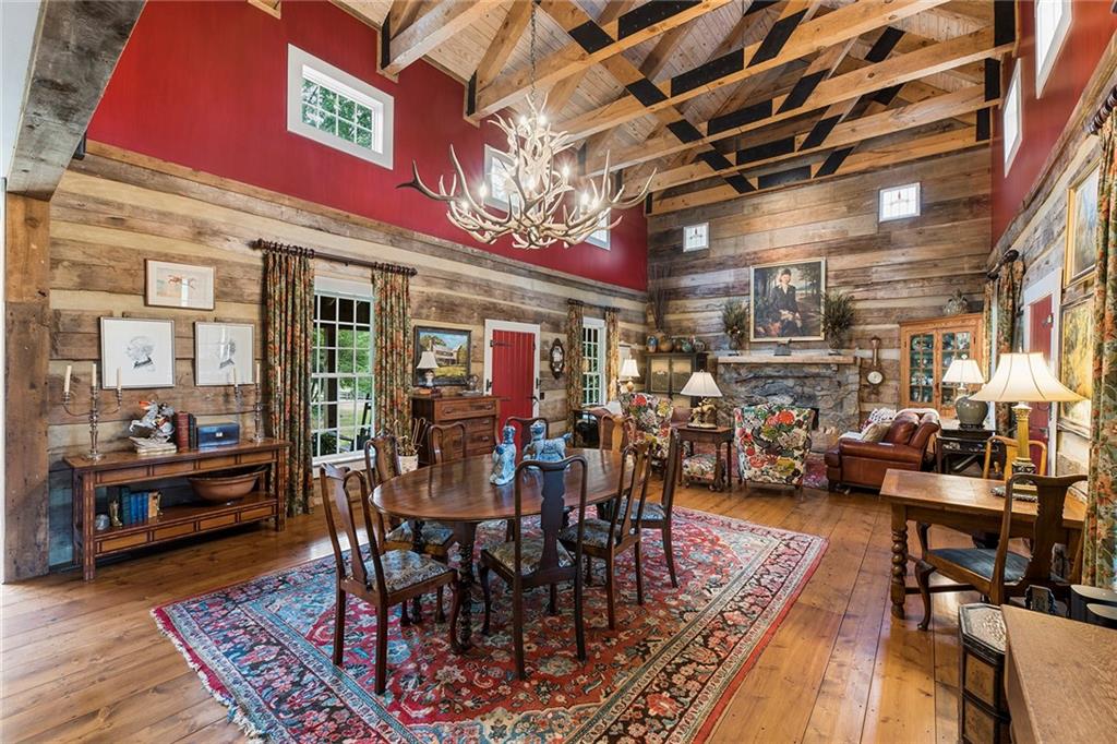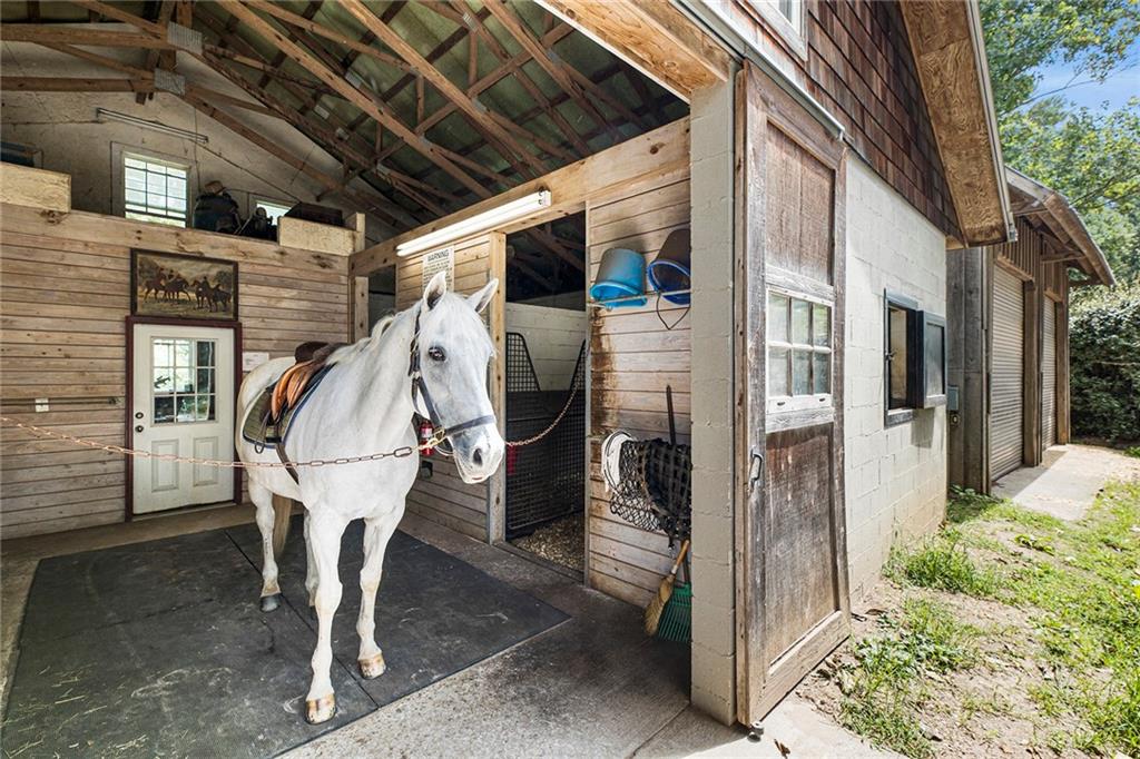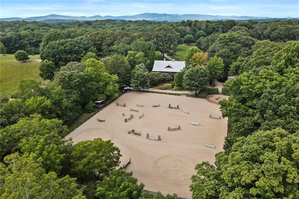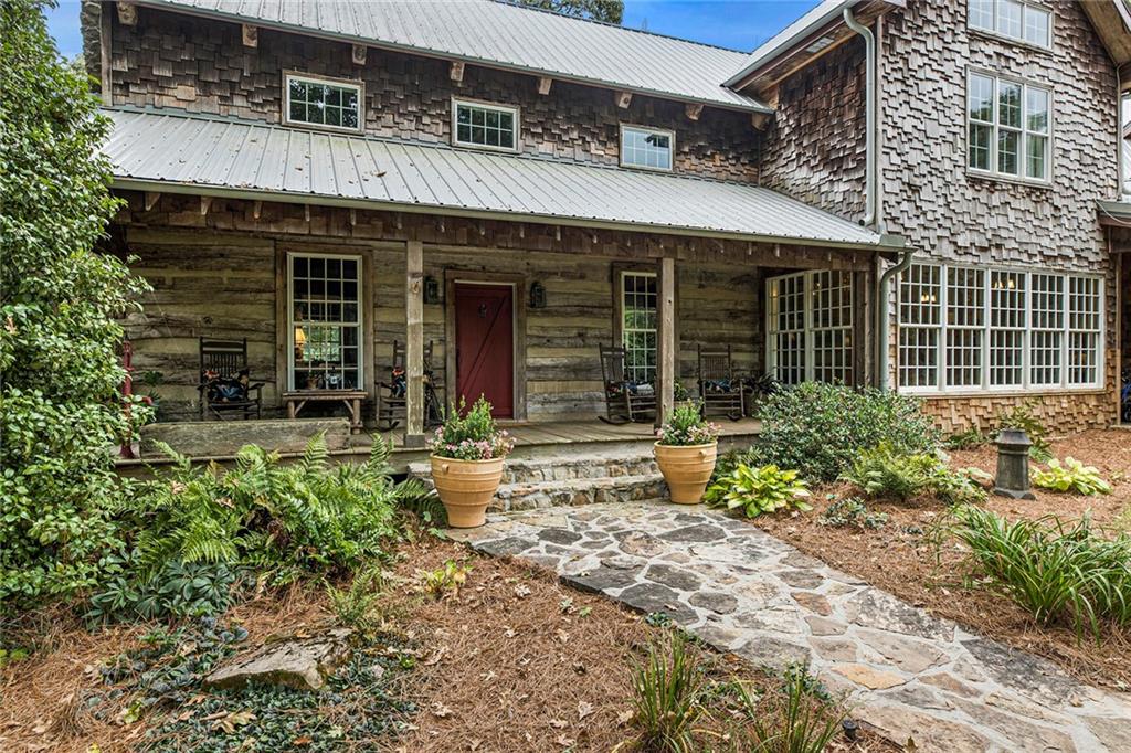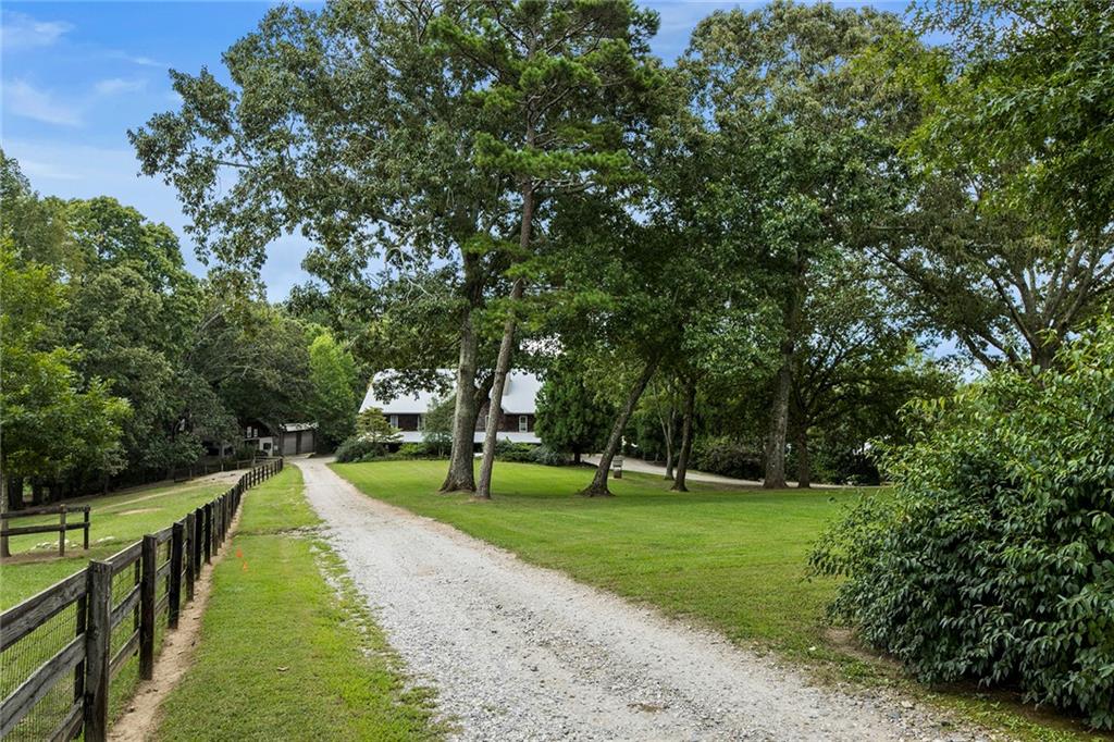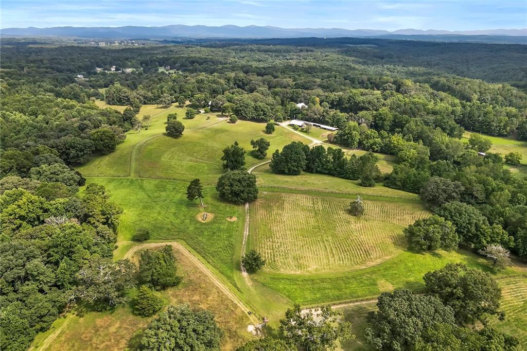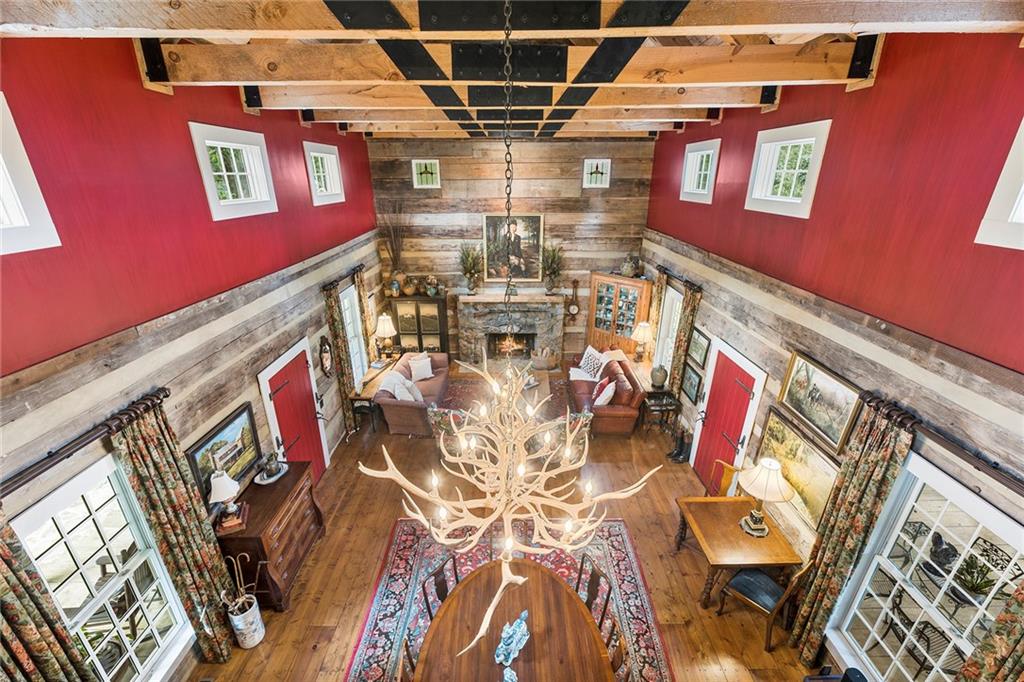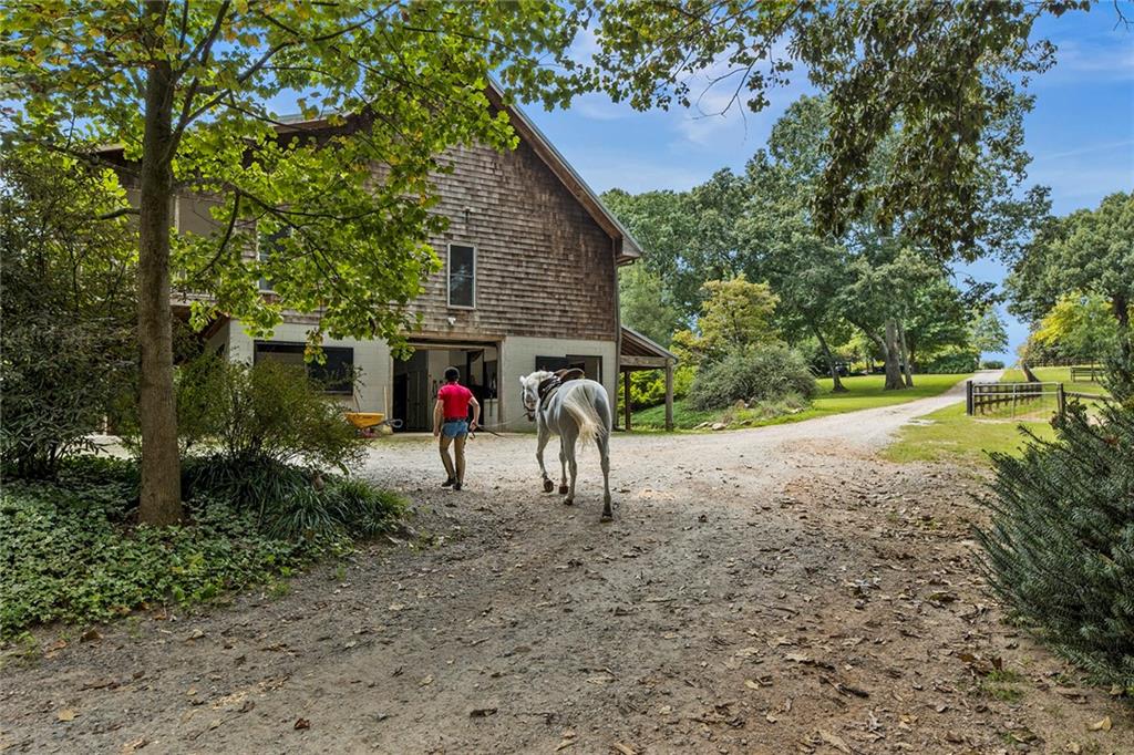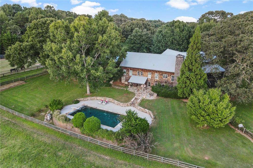 Experience absolute perfection on this 70 acre equestrian farm with rolling pastureland, three barns with 16 stalls, an incredible main house, a pool and a large guest house with elevator. Approached through a gated entry, the driveway winds past acres of fenced pastureland, beautiful hardwoods and riding arenas as you proceed to the wood and cedar-shingled main house. Evoking a bygone era, the home feels centuries old yet provides all the perks of modern living. Enter from the covered front porch into the enormous two-story grand hall with dining room, meant to feel like a log cabin with its wood-lined walls, wide-plank floors, exposed trusses and large stone fireplace. The adjacent gourmet kitchen provides all the luxuries for today's lifestyle with a large island, double-stacked cabinetry, stainless steel appliances, stone countertops, charming butler pantry and walk in pantry, a farmhouse sink and a nearby substantial laundry room. The kitchen flows seamlessly into the fireside keeping room and casual dining area. Huge double-hung windows wrap around the room and frame the sprawling views of the surrounding fields. French doors lead to the charming oversized screened porch with plenty of room for separate dining and sitting areas. Three en-suite bedrooms and large mud room complete the main level. Upstairs, you will find a large open office loft space, overlooking the grand hall as well as the primary bedroom featuring a cathedral ceiling with rustic beams, a fireplace, stained glass clerestory windows, a dressing room with two walk-in closets and an en suite bathroom with dual vanities, a jetted bathtub and a separate shower. Head downstairs to the incredible Garden & Gun-style terrace level, which features a wine cellar, fireside professional theatre room two built-in desks, a wet bar, a slate tiled game room, a gym or bedroom and a full bathroom. Venture outside to the refreshing, heated, saltwater pool with a large stone pool deck, a diving board and a motorized retractable pool cover. The property also features a four-stall barn with a tack room, a 12-stall barn with a washroom, and ample storage space. Spacious guest cottage above with elevator up is on the second level with a two-bedroom guest house with large additional office space. Perfect for a caretaker, this luxurious guest house includes an open floor plan with a two-story cathedral ceiling in the dining and living rooms, a white kitchen with an island, two large bedrooms, two bathrooms and a huge screened porch. Completely private and bordering a lake and creek with charming walking bridge, the property also includes an oversized arena, a round pen and a considerable outbuilding with a workshop and additional storage. Short ride by horse to Dawson Forest with endless trails (trail ride, mountain bike, hike). The property is also located close to a Elliot Field Private Airport, Atlanta Motorsports Park, Amicalola Falls, Lake Lanier and the North Georgia Outlets. A once-in-a-lifetime opportunity, this property is an equestrian lover's paradise!