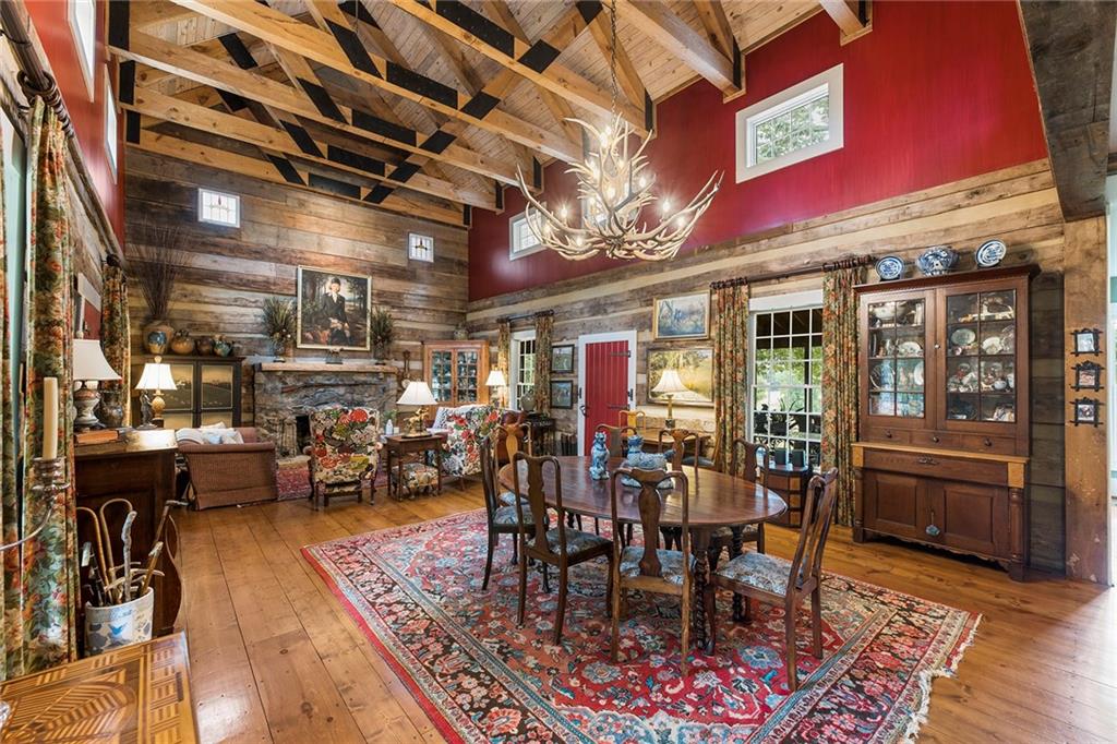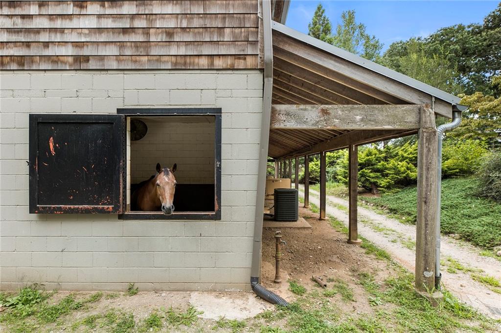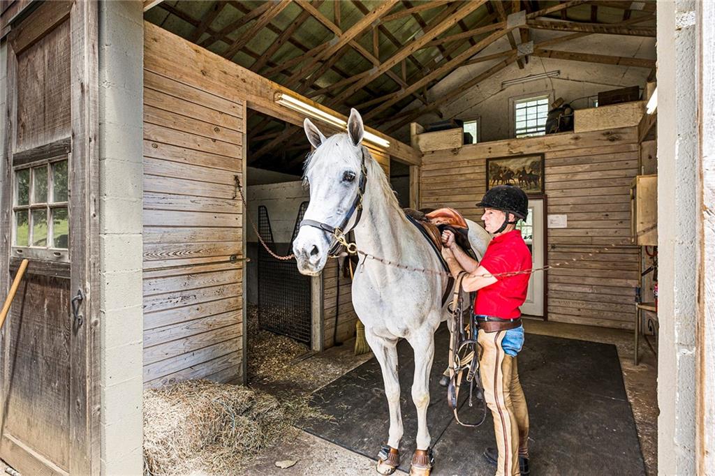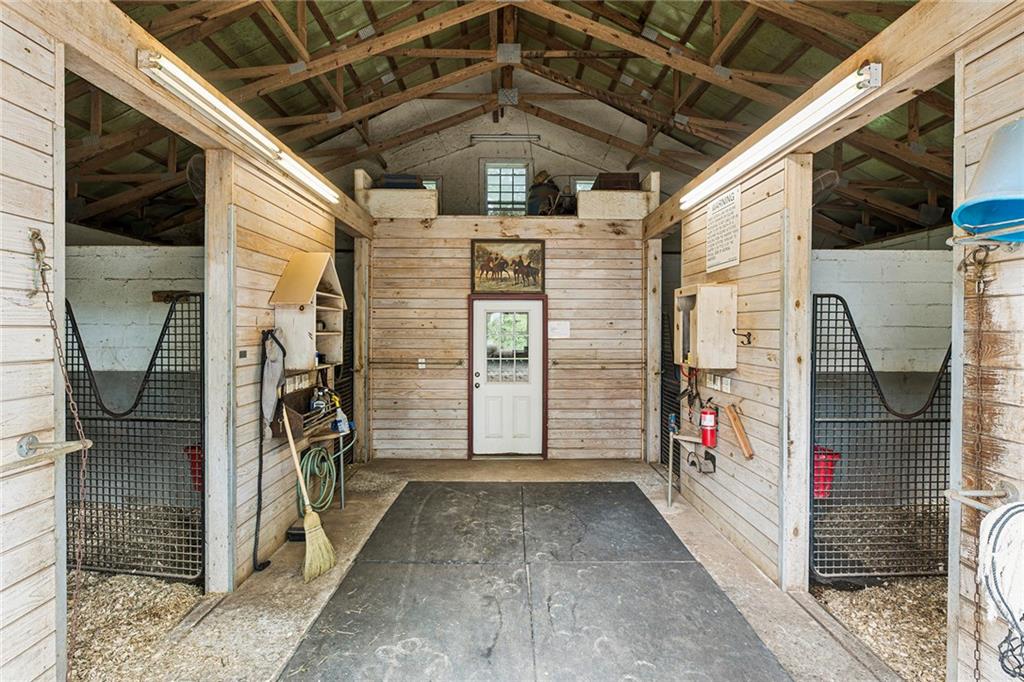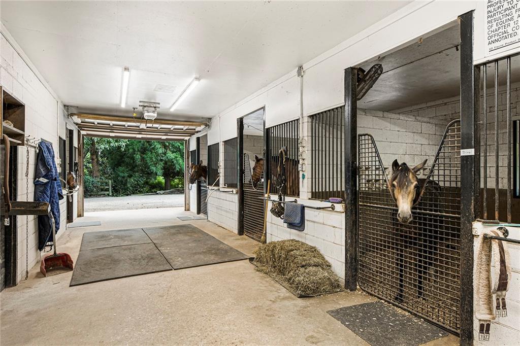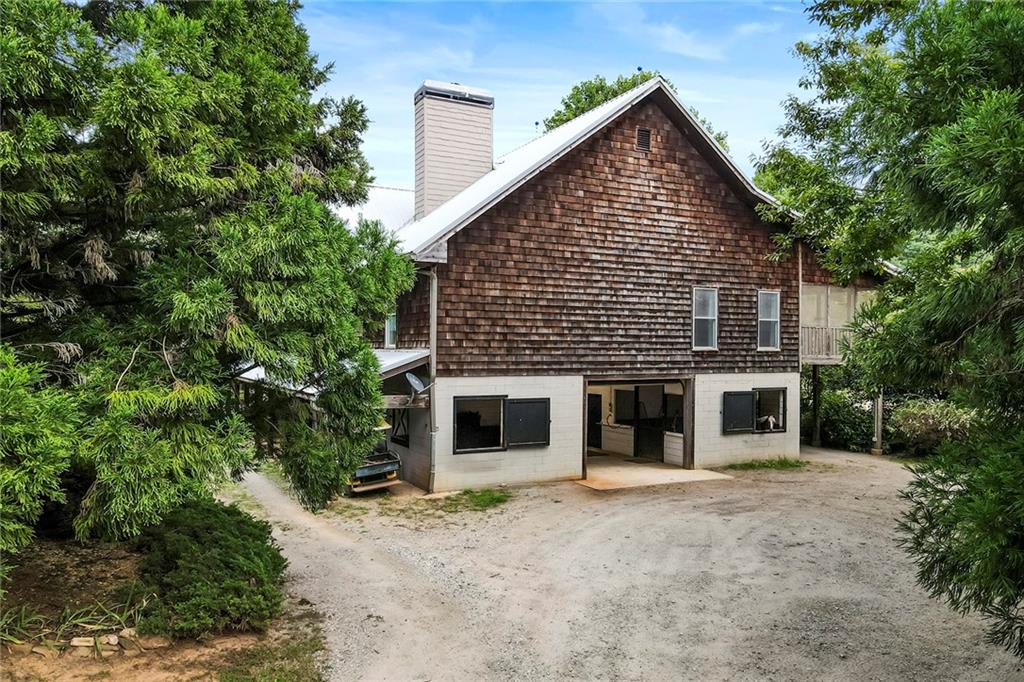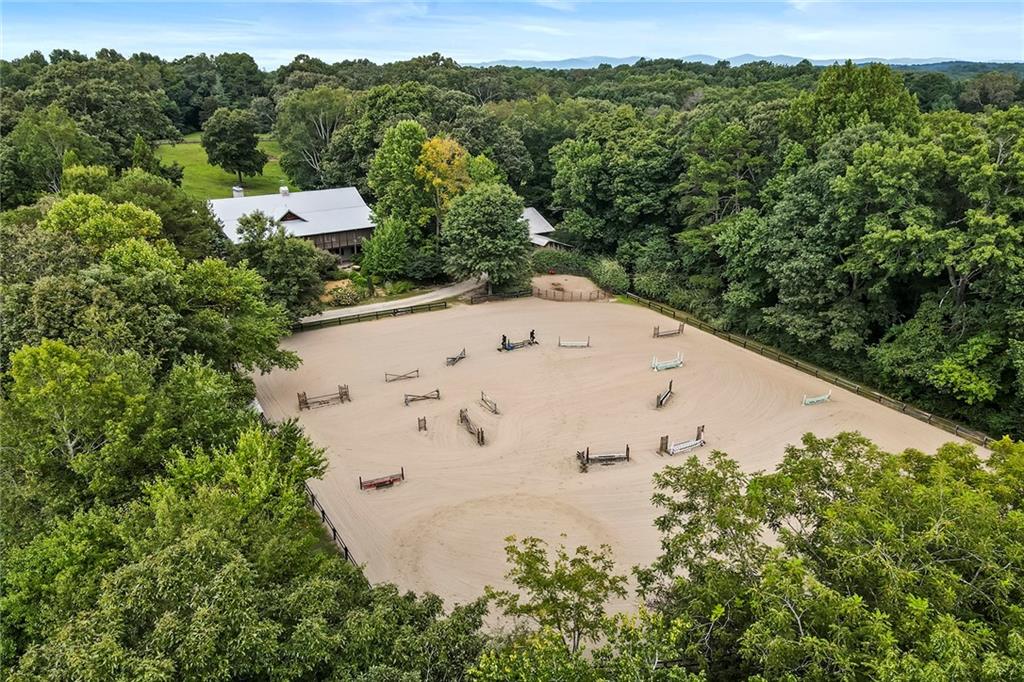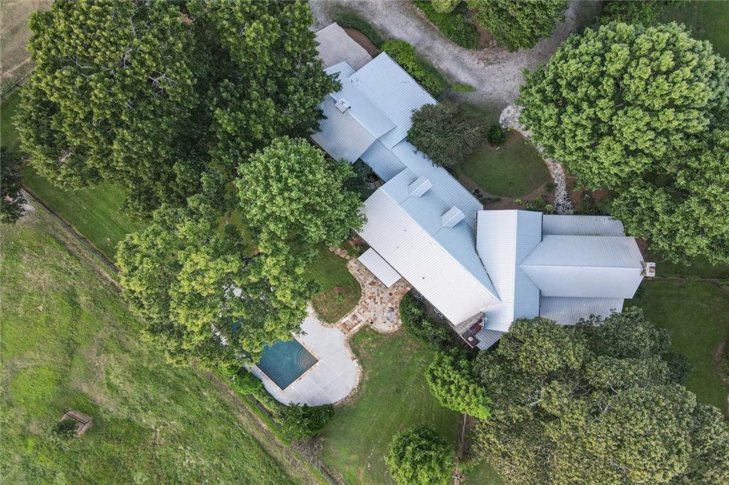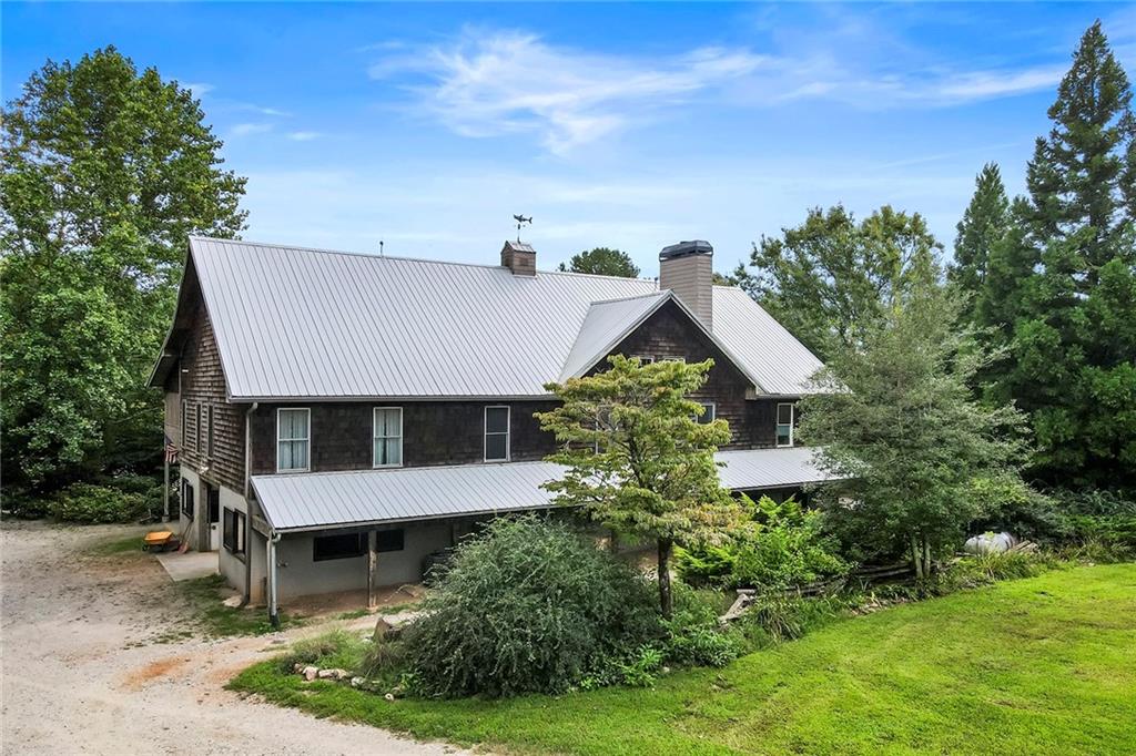 Experience absolute perfection on this 70 acre equestrian farm with rolling pastureland, three barns with 16 stalls, an incredible main house, a pool and a large guest house with elevator. Approached through a gated entry, the driveway winds past acres of fenced pastureland, beautiful hardwoods and riding arenas as you proceed to the wood and cedar-shingled main house. Evoking a bygone era, the home feels centuries old yet provides all the perks of modern living. Enter from the covered front porch into the enormous two-story grand hall with dining room, meant to feel like a log cabin with its wood-lined walls, wide-plank floors, exposed trusses and large stone fireplace. The adjacent gourmet kitchen provides all the luxuries for today's lifestyle with a large island, double-stacked cabinetry, stainless steel appliances, stone countertops, charming butler pantry and walk in pantry, a farmhouse sink and a nearby substantial laundry room. The kitchen flows seamlessly into the fireside keeping room and casual dining area. Huge double-hung windows wrap around the room and frame the sprawling views of the surrounding fields. French doors lead to the charming oversized screened porch with plenty of room for separate dining and sitting areas. Three en-suite bedrooms and large mud room complete the main level. Upstairs, you will find a large open office loft space, overlooking the grand hall as well as the primary bedroom featuring a cathedral ceiling with rustic beams, a fireplace, stained glass clerestory windows, a dressing room with two walk-in closets and an en suite bathroom with dual vanities, a jetted bathtub and a separate shower. Head downstairs to the incredible Garden & Gun-style terrace level, which features a wine cellar, fireside professional theatre room two built-in desks, a wet bar, a slate tiled game room, a gym or bedroom and a full bathroom. Venture outside to the refreshing, heated, saltwater pool with a large stone pool deck, a diving board and a motorized retractable pool cover. The property also features a four-stall barn with a tack room, a 12-stall barn with a washroom, and ample storage space. Spacious guest cottage above with elevator up is on the second level with a two-bedroom guest house with large additional office space. Perfect for a caretaker, this luxurious guest house includes an open floor plan with a two-story cathedral ceiling in the dining and living rooms, a white kitchen with an island, two large bedrooms, two bathrooms and a huge screened porch. Completely private and bordering a lake and creek with charming walking bridge, the property also includes an oversized arena, a round pen and a considerable outbuilding with a workshop and additional storage. Short ride by horse to Dawson Forest with endless trails (trail ride, mountain bike, hike). The property is also located close to a Elliot Field Private Airport, Atlanta Motorsports Park, Amicalola Falls, Lake Lanier and the North Georgia Outlets. A once-in-a-lifetime opportunity, this property is an equestrian lover's paradise!