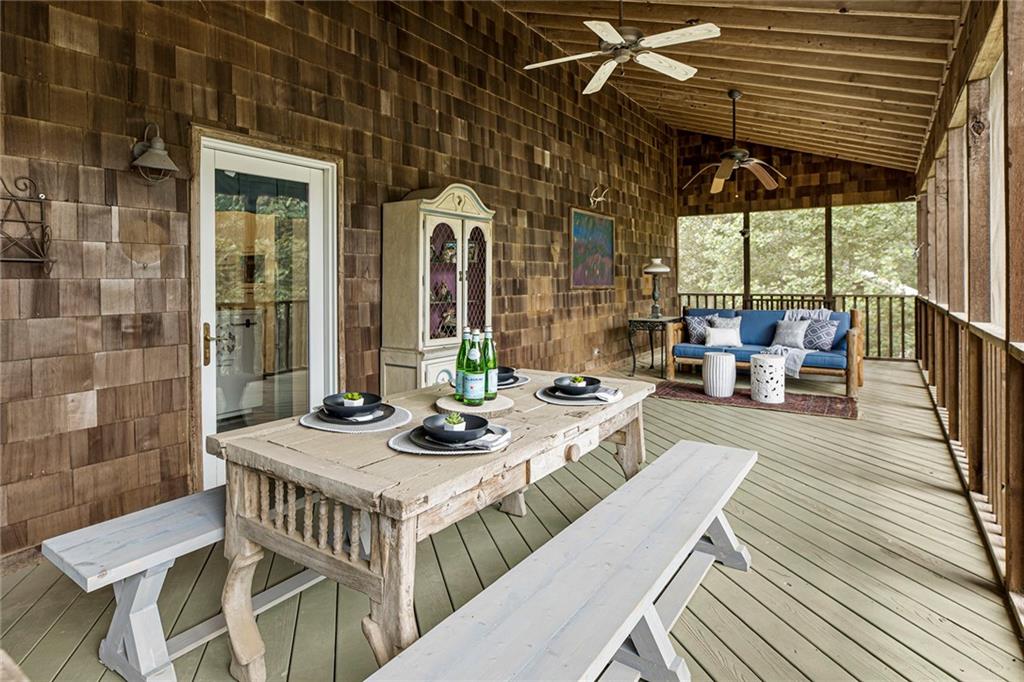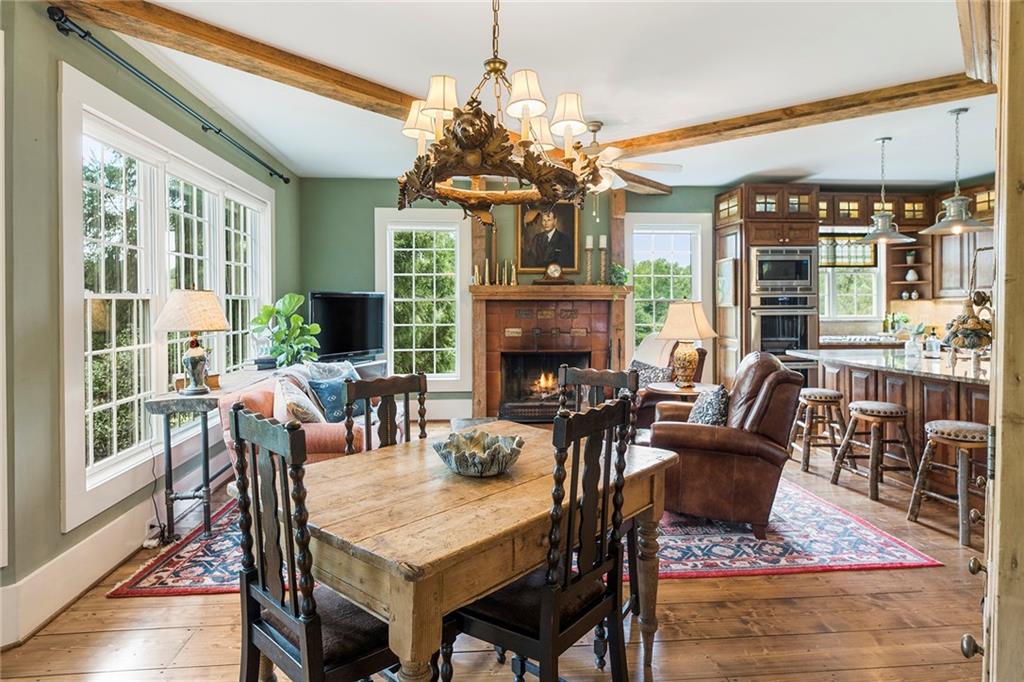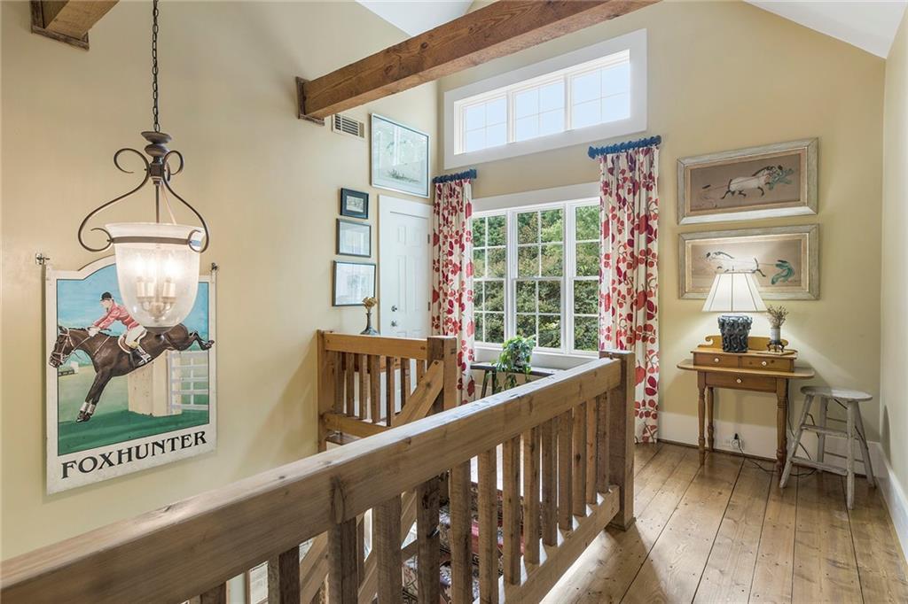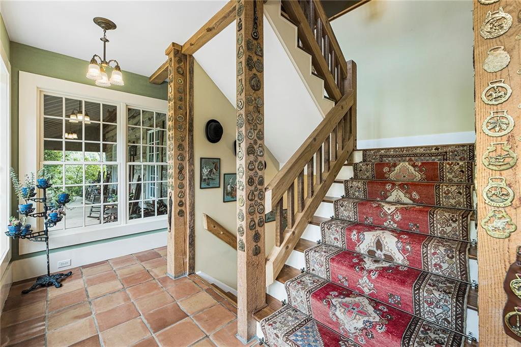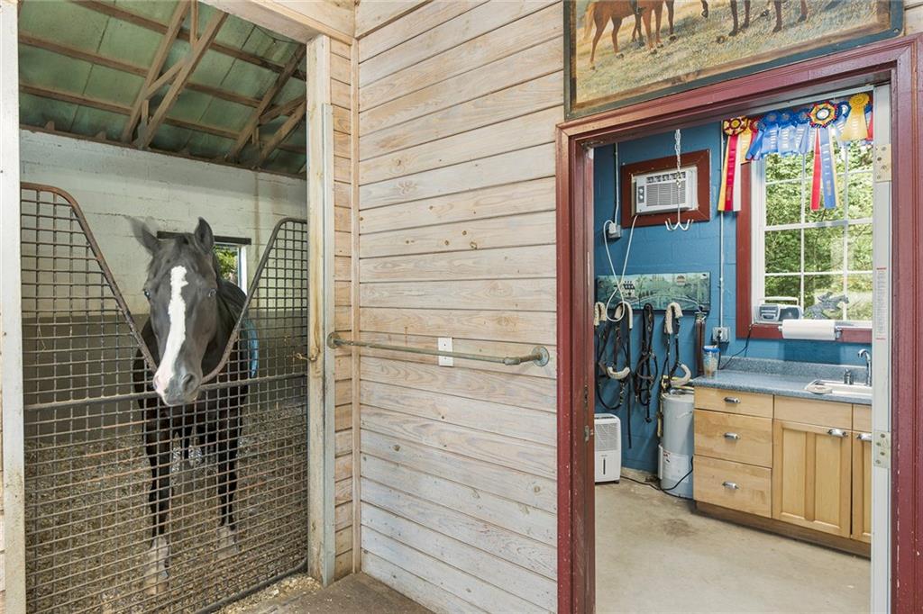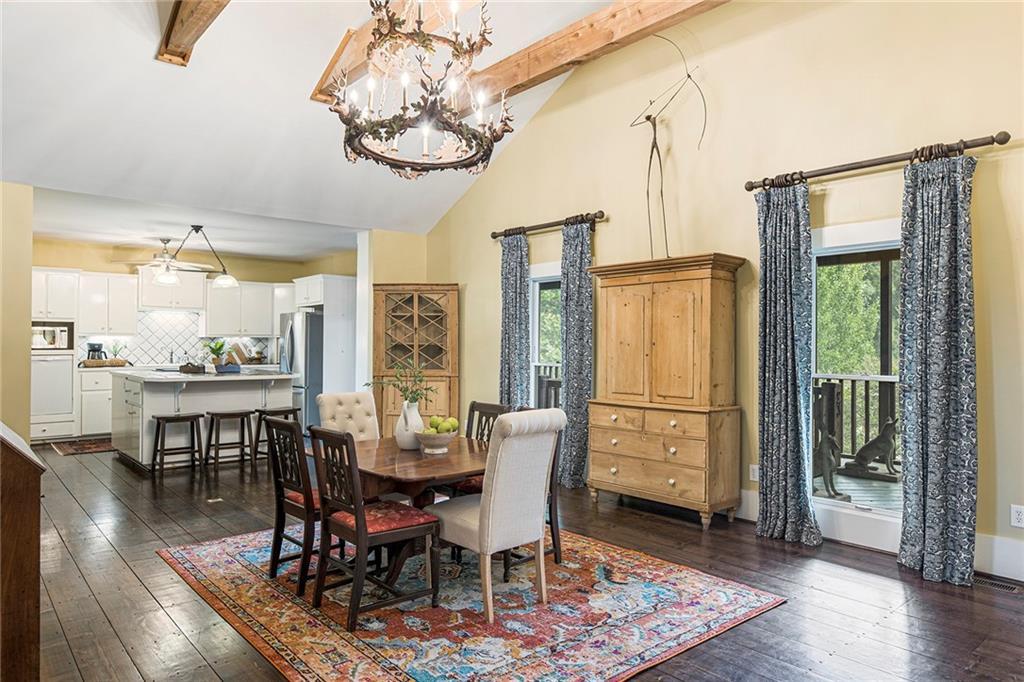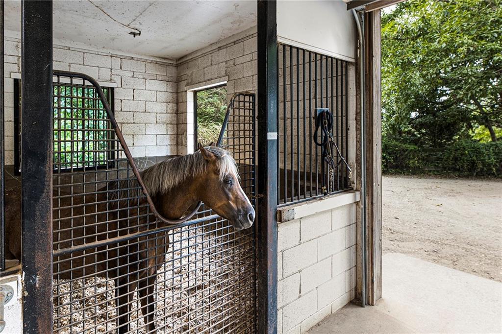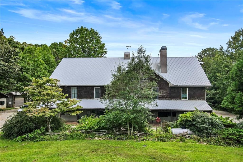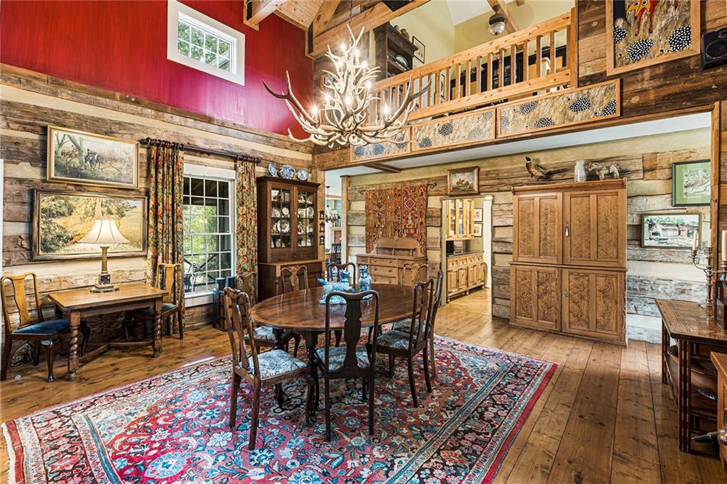 Experience absolute perfection on this 70 acre equestrian farm with rolling pastureland, three barns with 16 stalls, an incredible main house, a pool and a large guest house with elevator. Approached through a gated entry, the driveway winds past acres of fenced pastureland, beautiful hardwoods and riding arenas as you proceed to the wood and cedar-shingled main house. Evoking a bygone era, the home feels centuries old yet provides all the perks of modern living. Enter from the covered front porch into the enormous two-story grand hall with dining room, meant to feel like a log cabin with its wood-lined walls, wide-plank floors, exposed trusses and large stone fireplace. The adjacent gourmet kitchen provides all the luxuries for today's lifestyle with a large island, double-stacked cabinetry, stainless steel appliances, stone countertops, charming butler pantry and walk in pantry, a farmhouse sink and a nearby substantial laundry room. The kitchen flows seamlessly into the fireside keeping room and casual dining area. Huge double-hung windows wrap around the room and frame the sprawling views of the surrounding fields. French doors lead to the charming oversized screened porch with plenty of room for separate dining and sitting areas. Three en-suite bedrooms and large mud room complete the main level. Upstairs, you will find a large open office loft space, overlooking the grand hall as well as the primary bedroom featuring a cathedral ceiling with rustic beams, a fireplace, stained glass clerestory windows, a dressing room with two walk-in closets and an en suite bathroom with dual vanities, a jetted bathtub and a separate shower. Head downstairs to the incredible Garden & Gun-style terrace level, which features a wine cellar, fireside professional theatre room two built-in desks, a wet bar, a slate tiled game room, a gym or bedroom and a full bathroom. Venture outside to the refreshing, heated, saltwater pool with a large stone pool deck, a diving board and a motorized retractable pool cover. The property also features a four-stall barn with a tack room, a 12-stall barn with a washroom, and ample storage space. Spacious guest cottage above with elevator up is on the second level with a two-bedroom guest house with large additional office space. Perfect for a caretaker, this luxurious guest house includes an open floor plan with a two-story cathedral ceiling in the dining and living rooms, a white kitchen with an island, two large bedrooms, two bathrooms and a huge screened porch. Completely private and bordering a lake and creek with charming walking bridge, the property also includes an oversized arena, a round pen and a considerable outbuilding with a workshop and additional storage. Short ride by horse to Dawson Forest with endless trails (trail ride, mountain bike, hike). The property is also located close to a Elliot Field Private Airport, Atlanta Motorsports Park, Amicalola Falls, Lake Lanier and the North Georgia Outlets. A once-in-a-lifetime opportunity, this property is an equestrian lover's paradise!