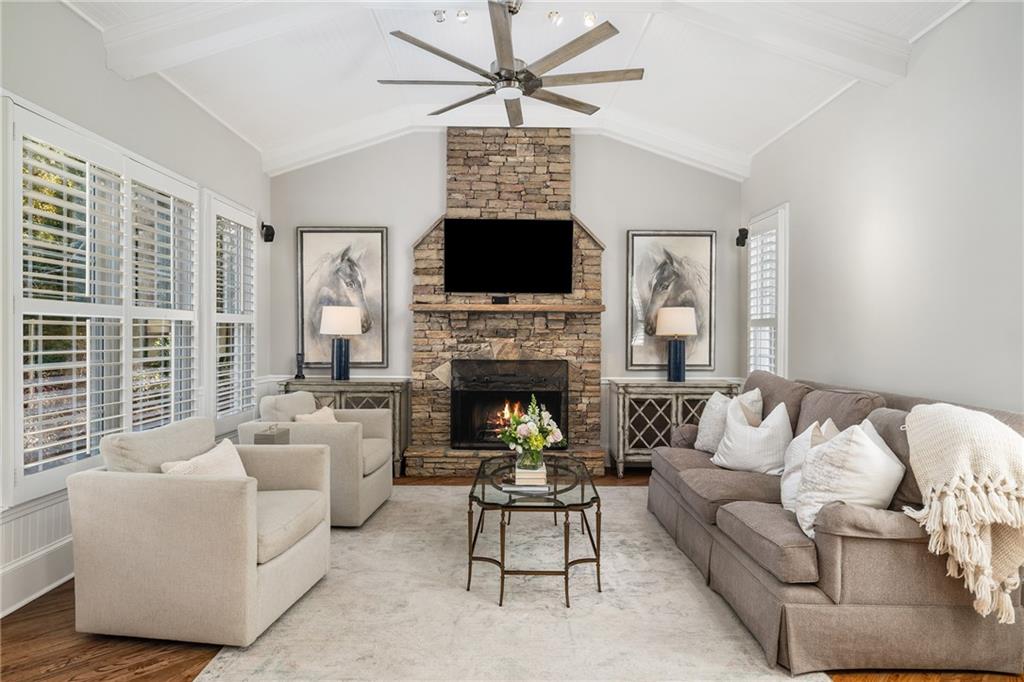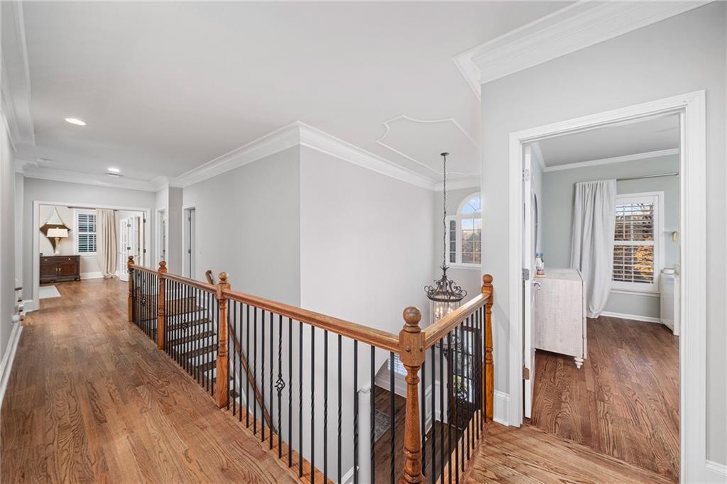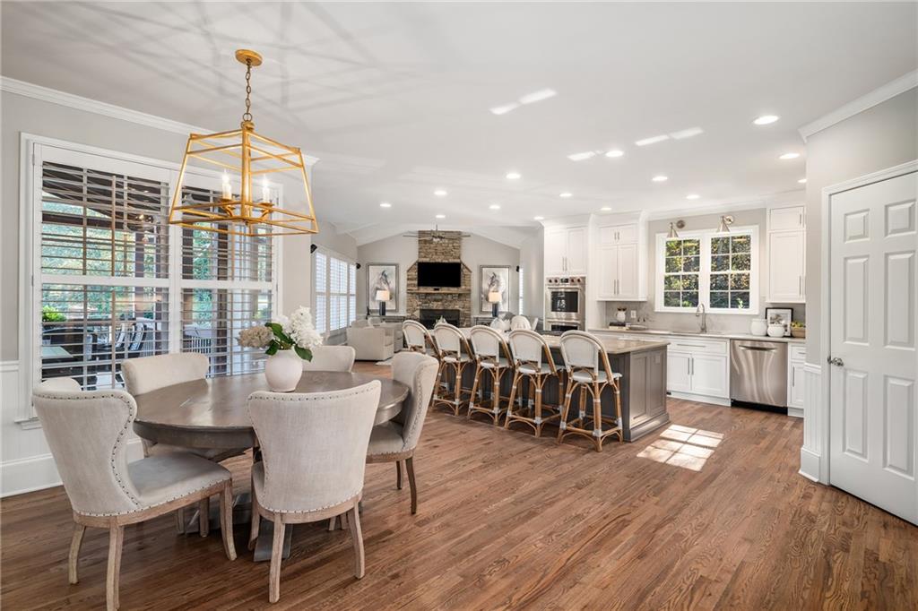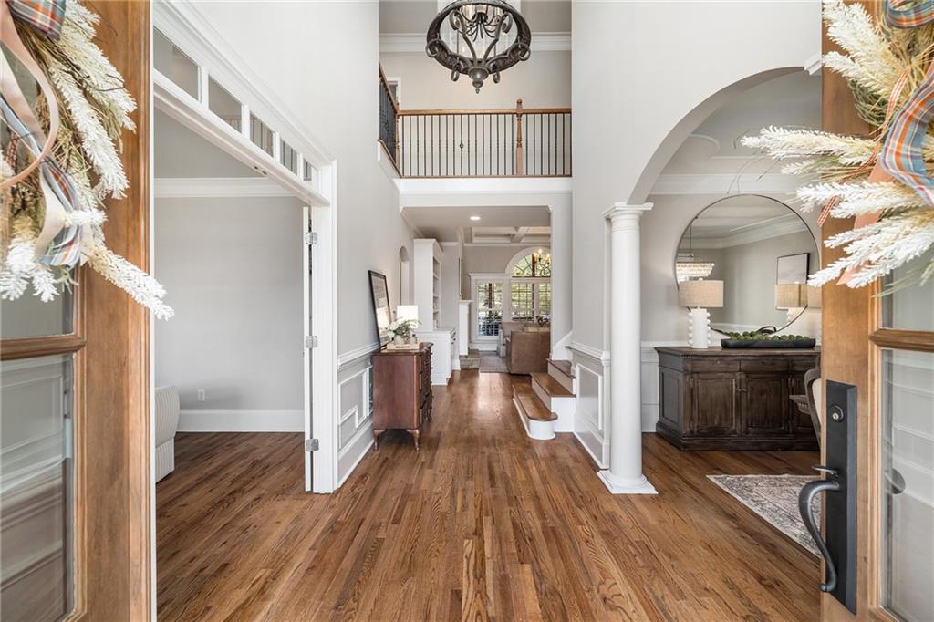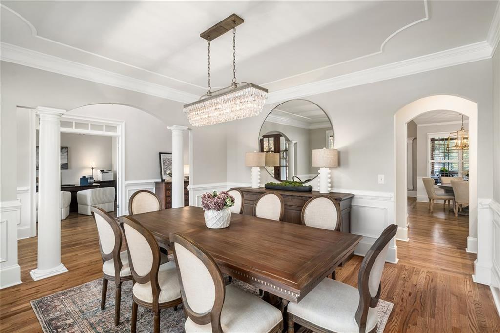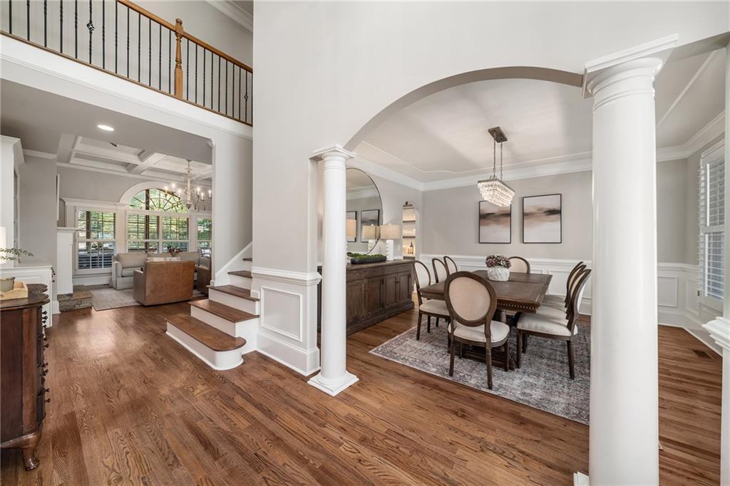 Inside, a bright two story foyer opens to hardwood floors that continue throughout the main and upper levels including all bedrooms. Plantation shutters, updated lighting, and detailed trim work create a timeless backdrop for both everyday living and elegant entertaining. The formal dining room and offiice sit gracefully at the front of the home, while the layout naturally draws you into the heart of the house with a more open concept.
