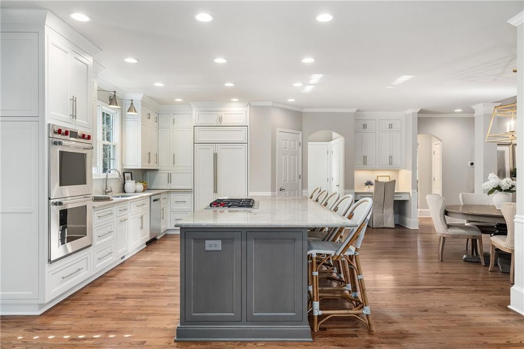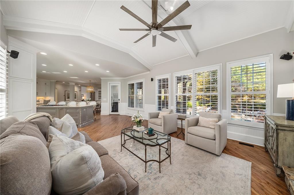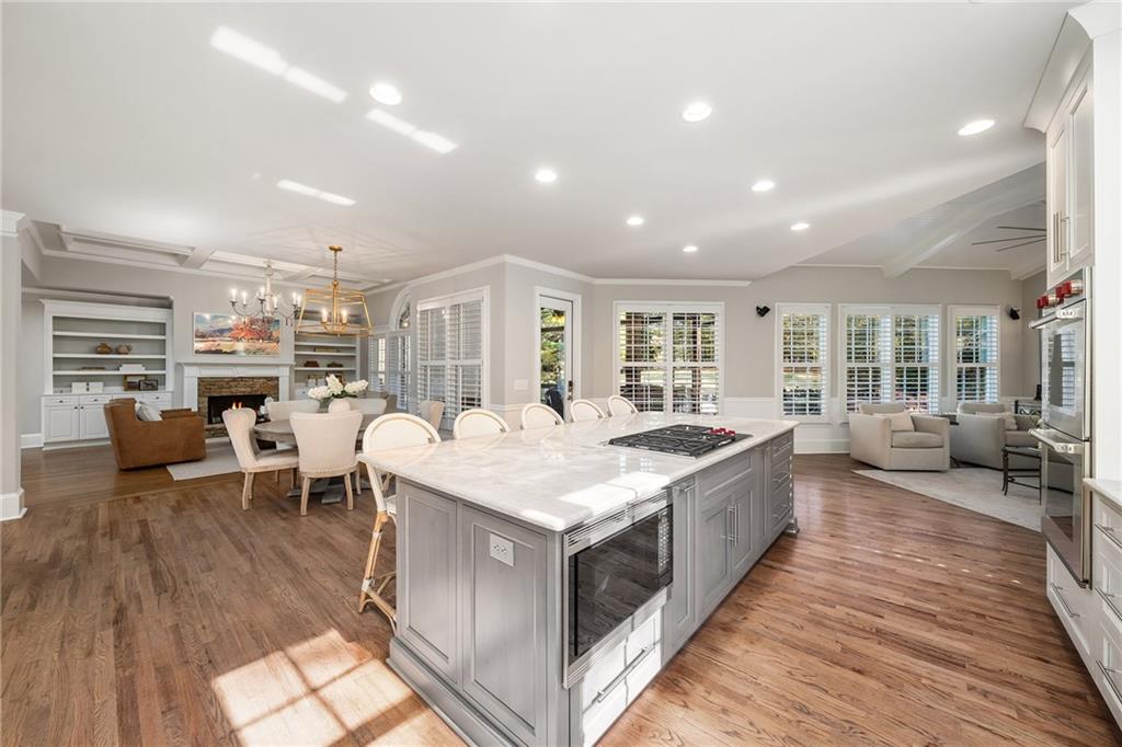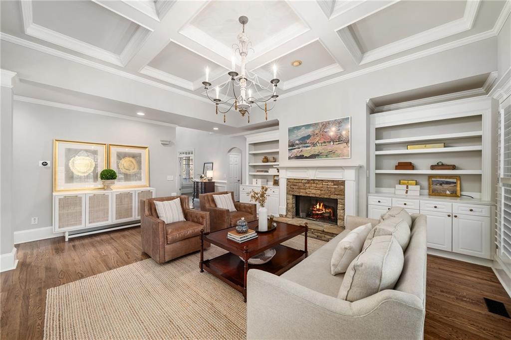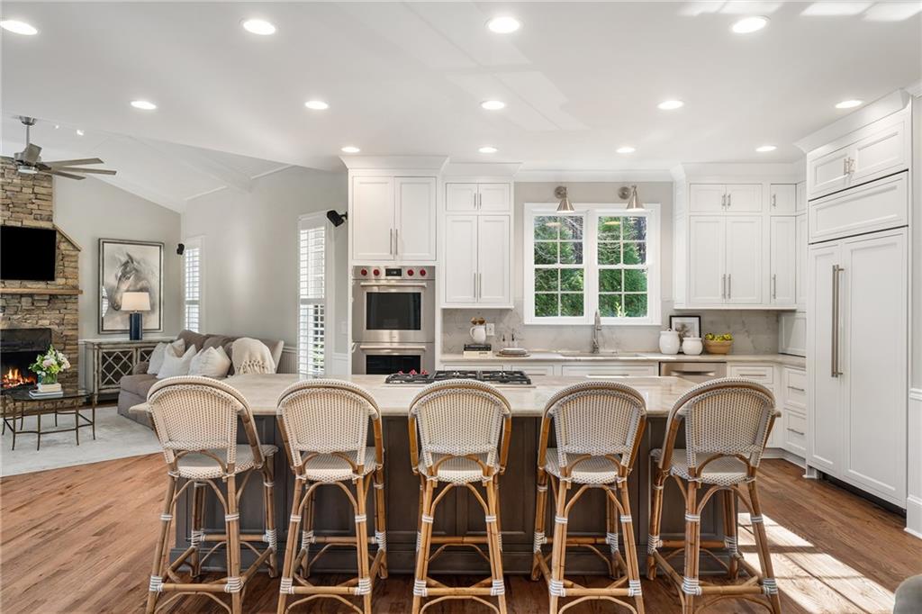 The fireside living room with coffered ceilings and built-in bookshelves flows to the breakfast area and on to the renovated kitchen. Blending function and refined design, custom cabinetry, quartzite countertops and backsplash, a Sub Zero refrigerator, and a full suite of Wolf stainless steel appliances make up this space. Organized storage solutions elevate the cooking experience, and an additional ice maker at the bar enhances entertaining. On the other side of the kitchen, the fireside keeping room awaits with vaulted ceilings, overlooking the backyard and offering access to the expansive covered deck for easy indoor to outdoor flow. The nearby mudroom provides exceptional storage and keeps daily routines seamless.