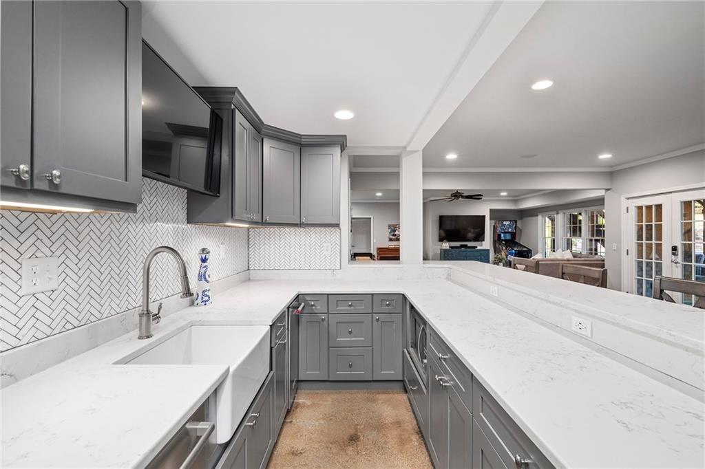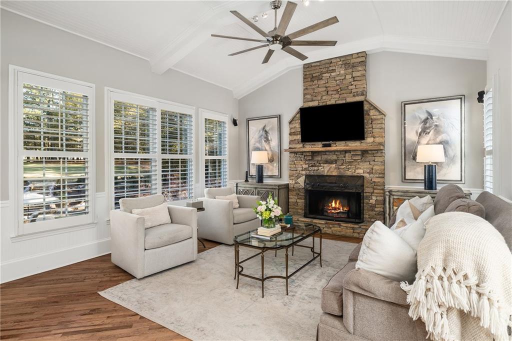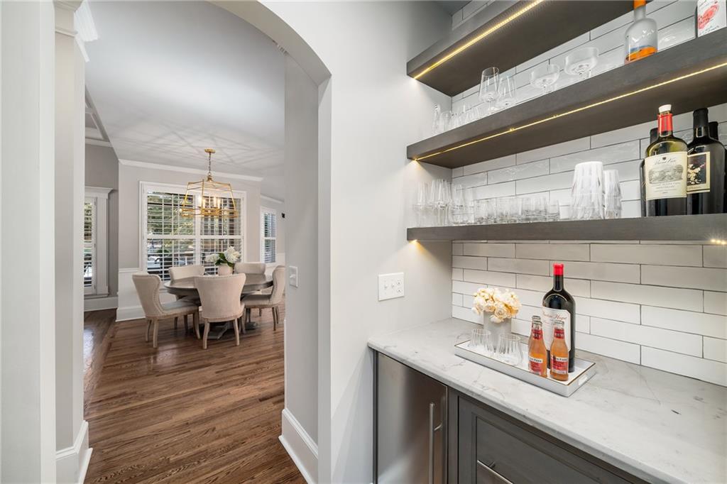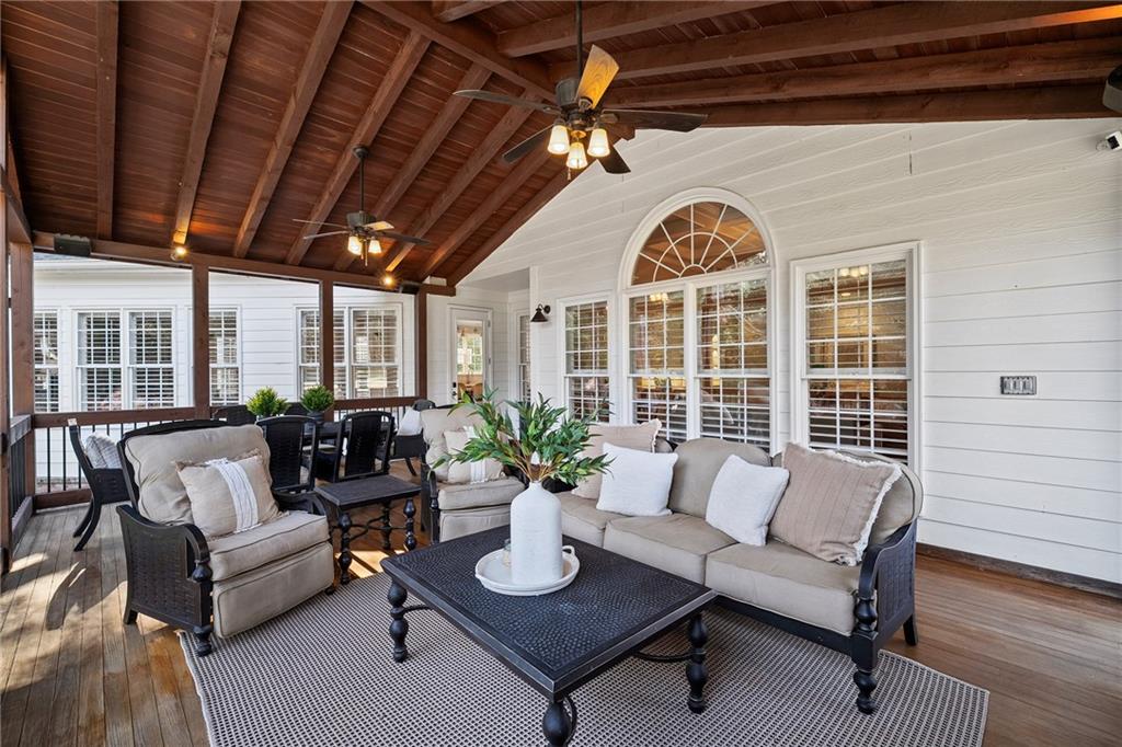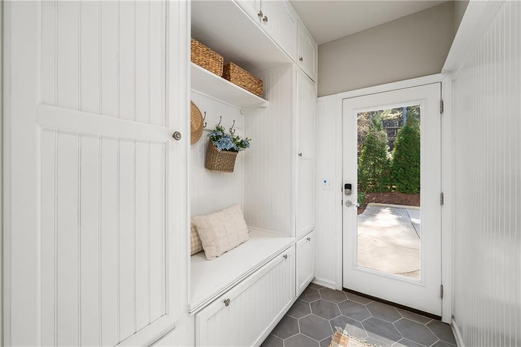 The fireside living room with coffered ceilings and built-in bookshelves flows to the breakfast area and on to the renovated kitchen. Blending function and refined design, custom cabinetry, quartzite countertops and backsplash, a Sub Zero refrigerator, and a full suite of Wolf stainless steel appliances make up this space. Organized storage solutions elevate the cooking experience, and an additional ice maker at the bar enhances entertaining. On the other side of the kitchen, the fireside keeping room awaits with vaulted ceilings, overlooking the backyard and offering access to the expansive covered deck for easy indoor to outdoor flow. The nearby mudroom provides exceptional storage and keeps daily routines seamless.