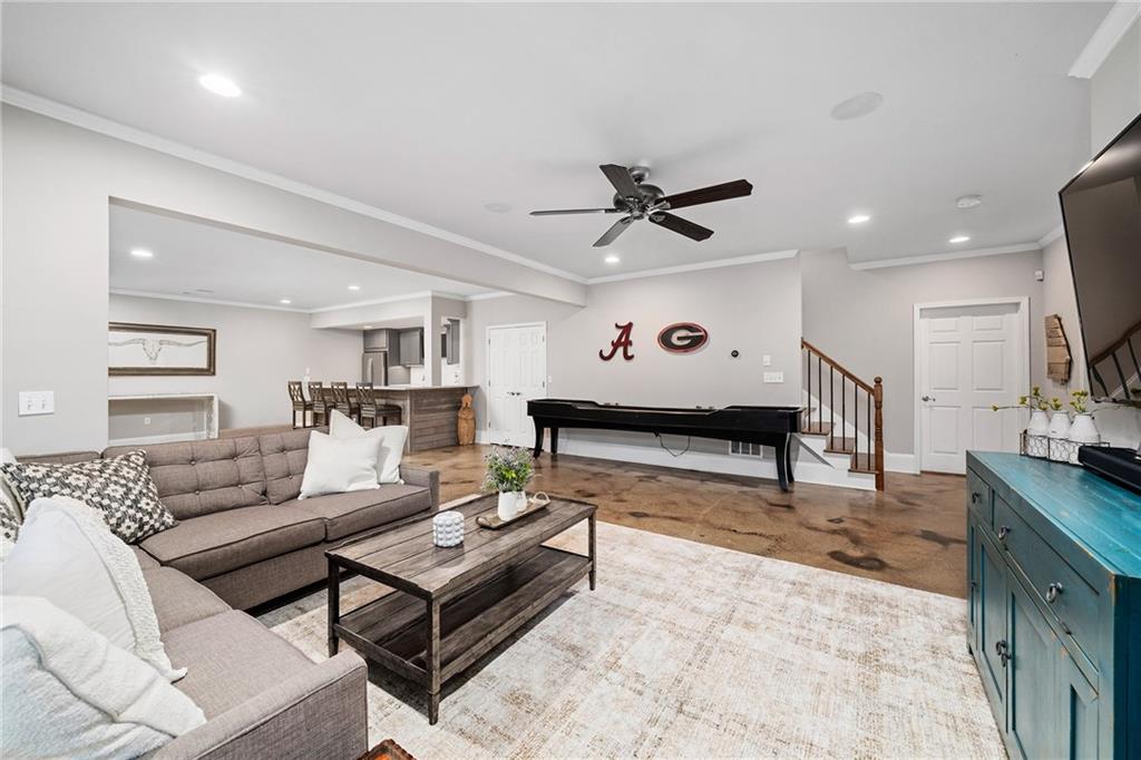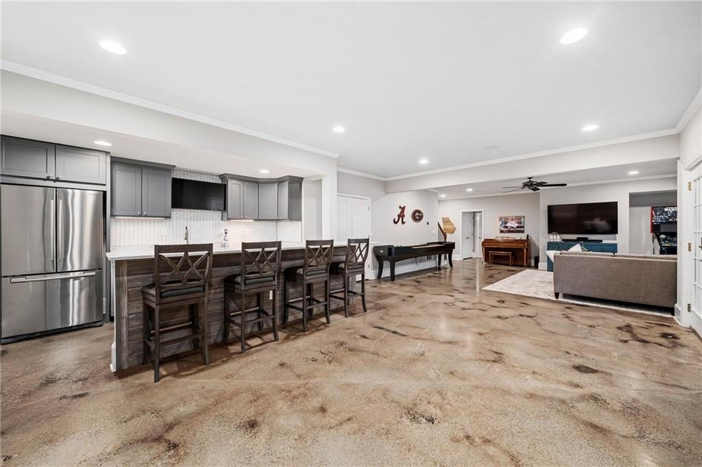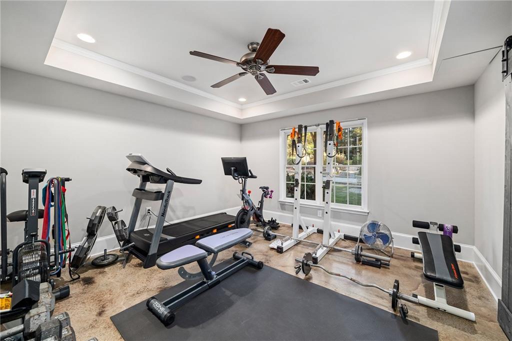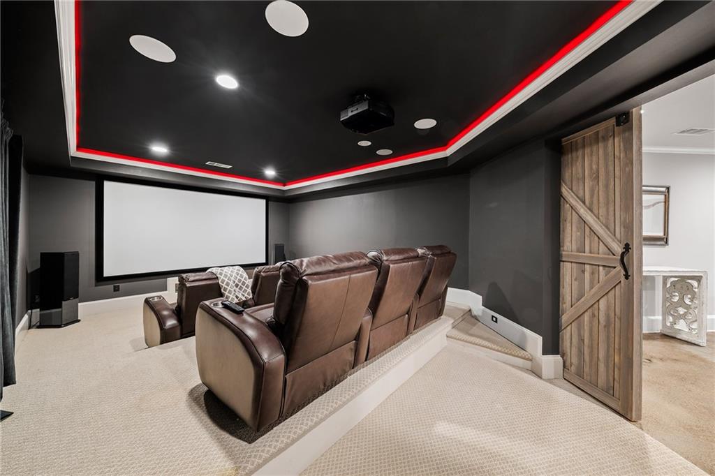 The terrace level has been thoughtfully transformed into a multifunctional extension of the home. A full bar with a dishwasher, microwave, full refrigerator and ice maker anchors a spacious living area with four television and speaker zones. A dedicated home theater, a gym with a steam shower, a secondary washer and dryer, custom barn doors, and generous workroom and storage areas complete this impressive level.