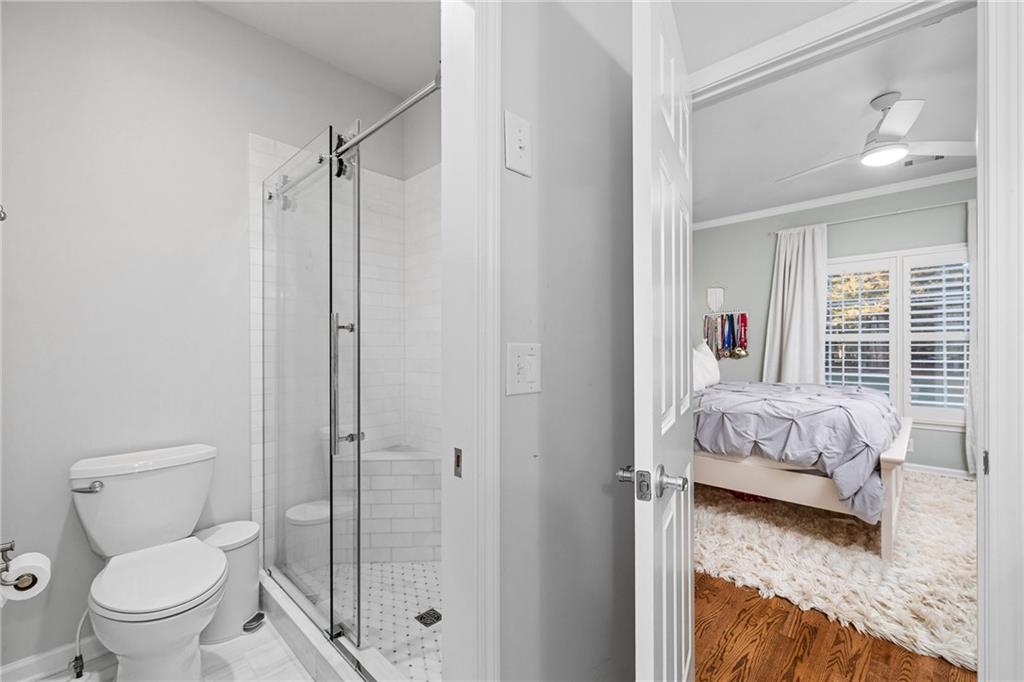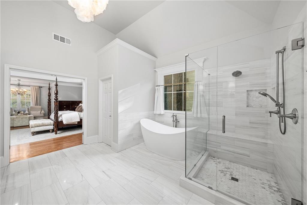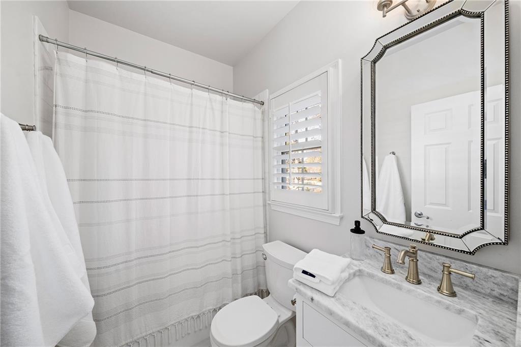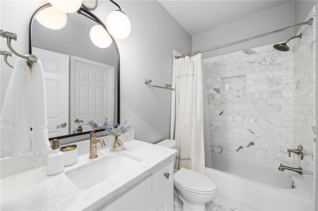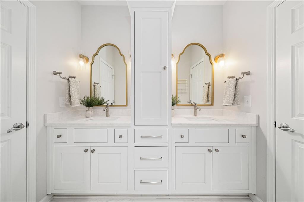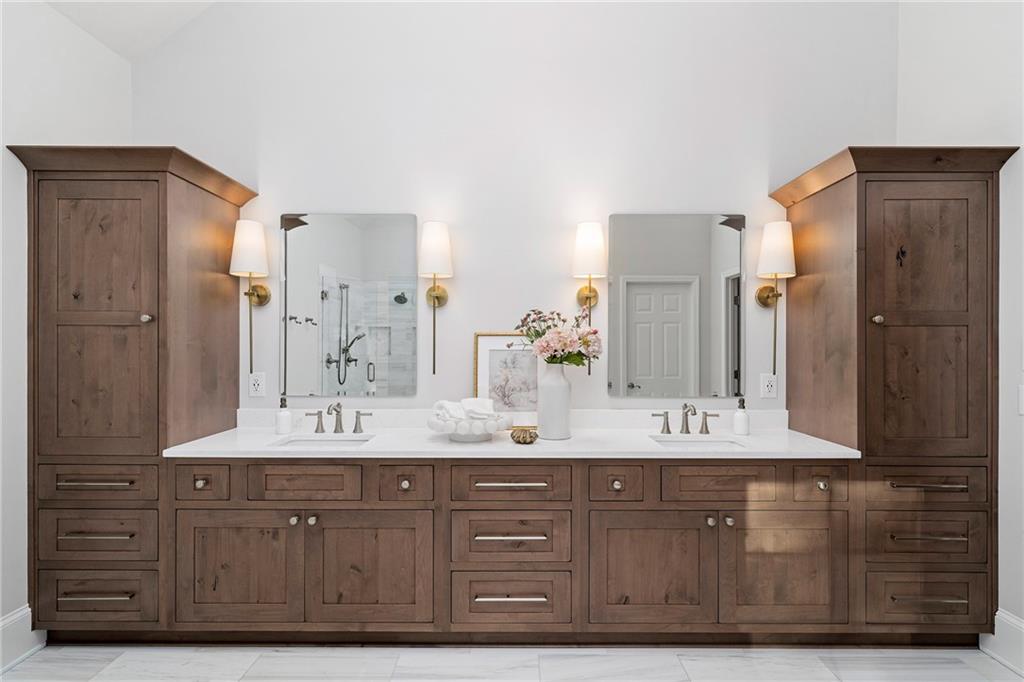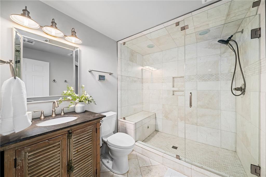 Upstairs, the primary suite offers a peaceful retreat with a sitting area and a marble bathroom renovated in 2022. Heated floors, custom cabinetry, a soaking bathtub, a large walk-in closet and a beautifully designed shower create a spa inspired atmosphere. All additional full bathrooms on the main and upper levels were remodeled in marble for a cohesive and elevated aesthetic.