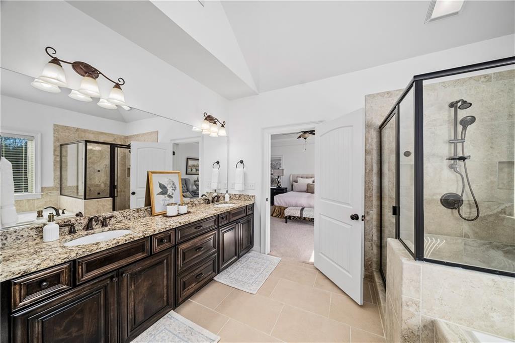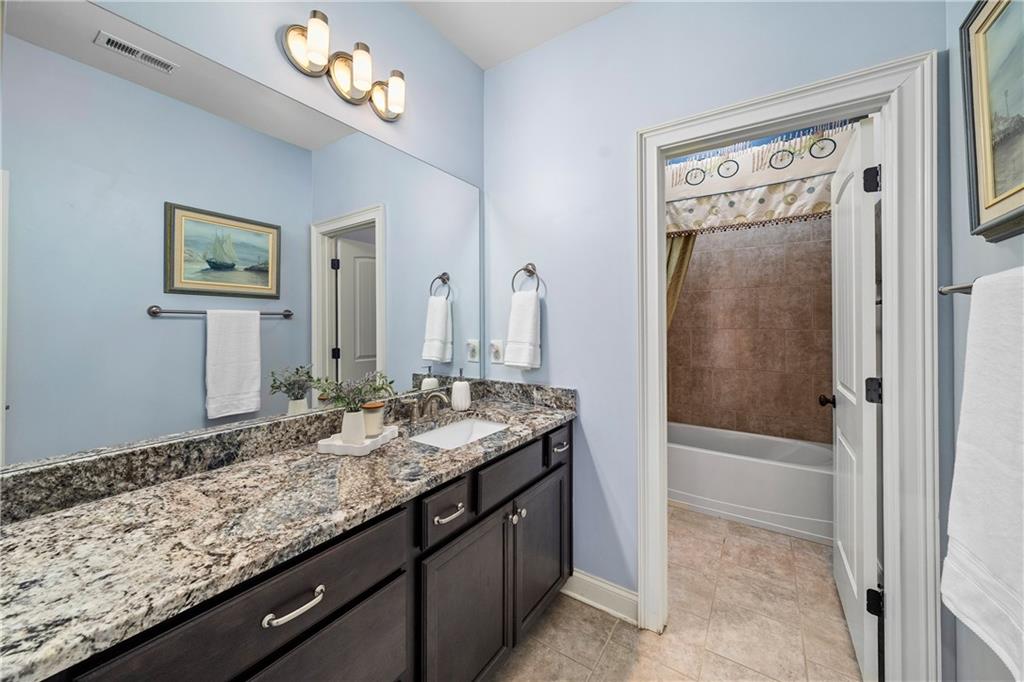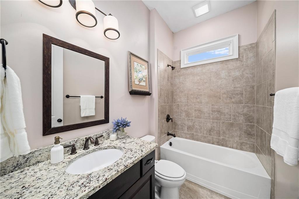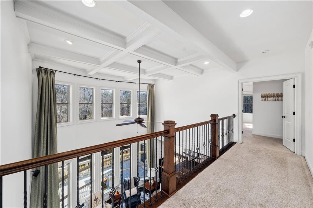 Upstairs, the primary suite is a true retreat with a coffered ceiling, spa inspired bath with dual vanities, soaking tub, walk in shower, and an expansive walk in closet plus an additional secondary closet. Two secondary bedrooms share a full hall bath, while an oversized fourth bedroom enjoys its own ensuite bath. The laundry room is thoughtfully located upstairs for added convenience.