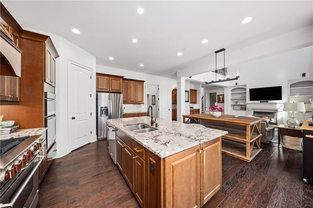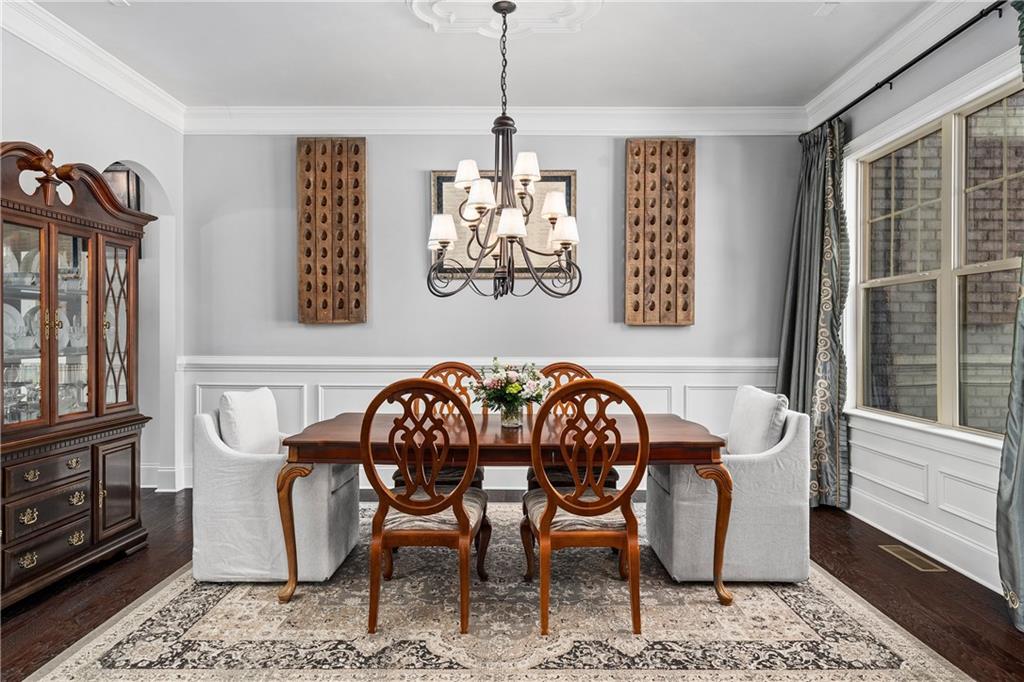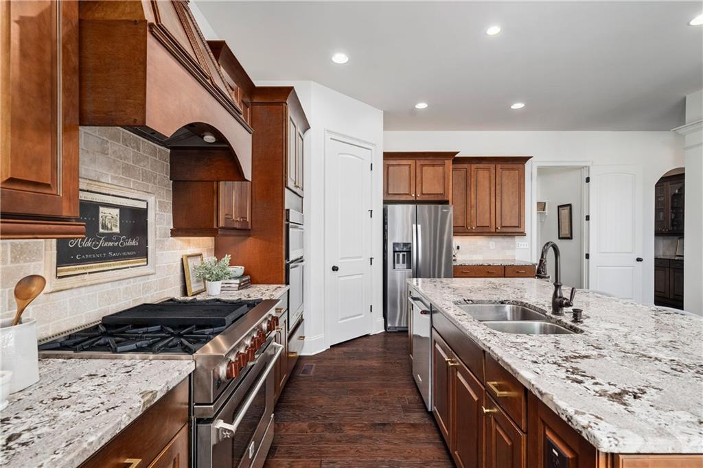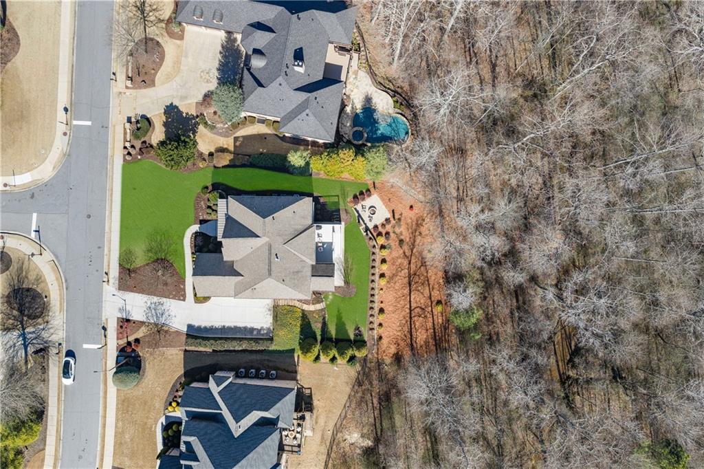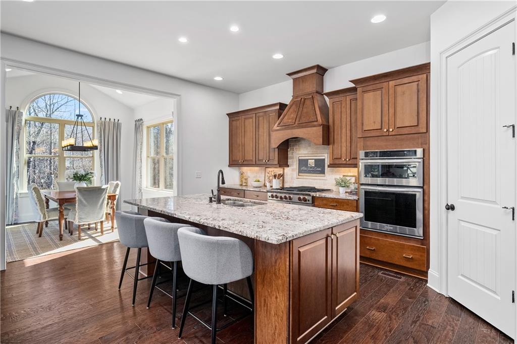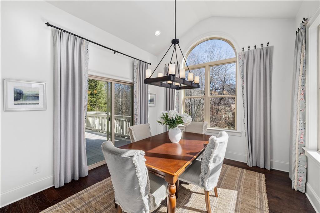 The kitchen is designed for both beauty and function, complete with a large island with cookbook storage on both ends, pull out cabinet drawers, double ovens, a professional 6 burner gas range, and a generous walk in pantry. The adjoining breakfast room, wrapped in windows and glass doors on three sides, offers a treehouse like view of the private backyard. Step outside to a spacious deck with a built in gas grill overlooking lush landscaping.