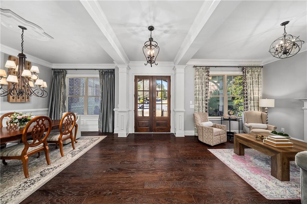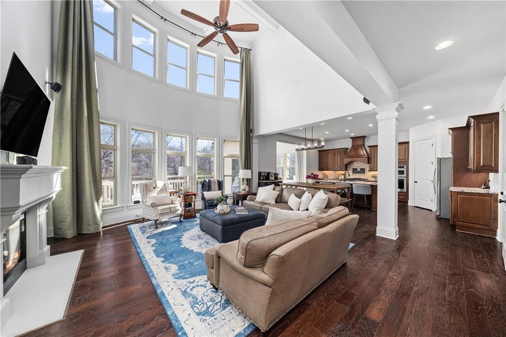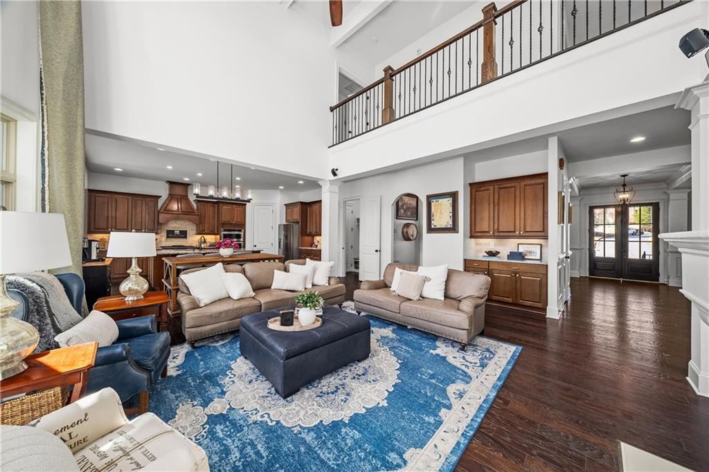 A stacked stone front porch and impressive 8 foot double doors create a warm welcome. Inside, formal dining and living rooms set the tone with refined details and a fireplace that anchors the space. The main living area opens to a dramatic two story family room featuring exposed beams, a fireplace, custom built ins, and a wall of windows that fills the home with natural light. A stylish bar area and butler's pantry connect seamlessly to the dining room, creating effortless flow for gatherings.