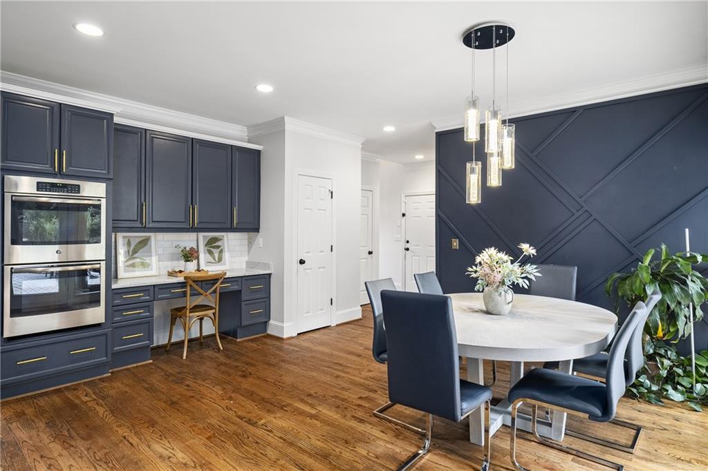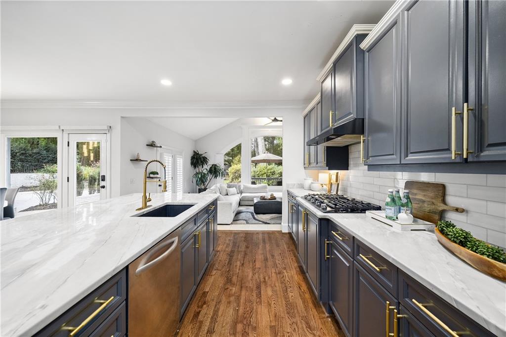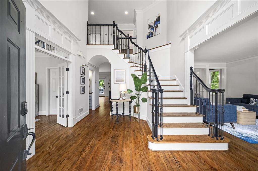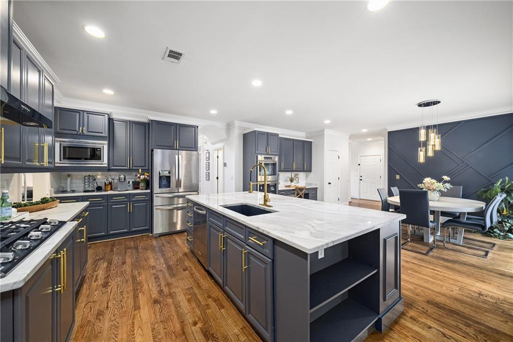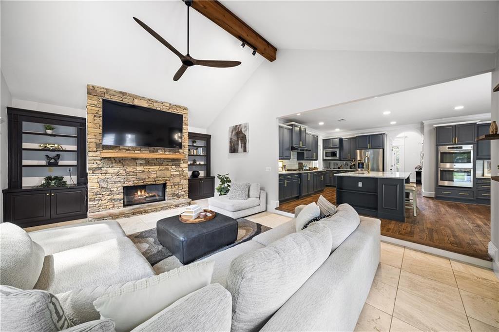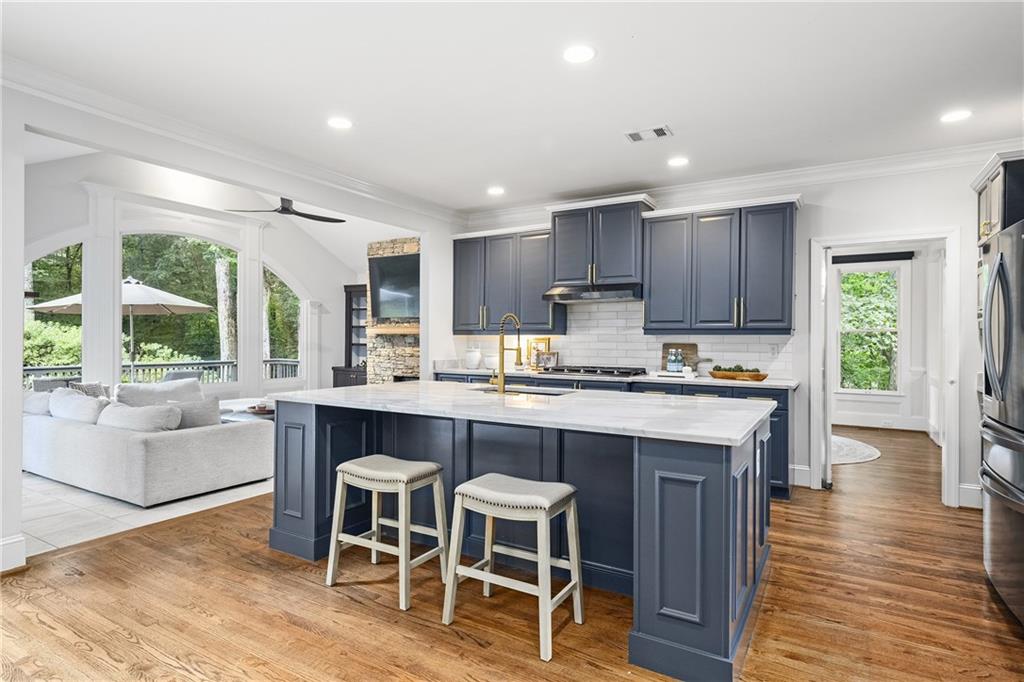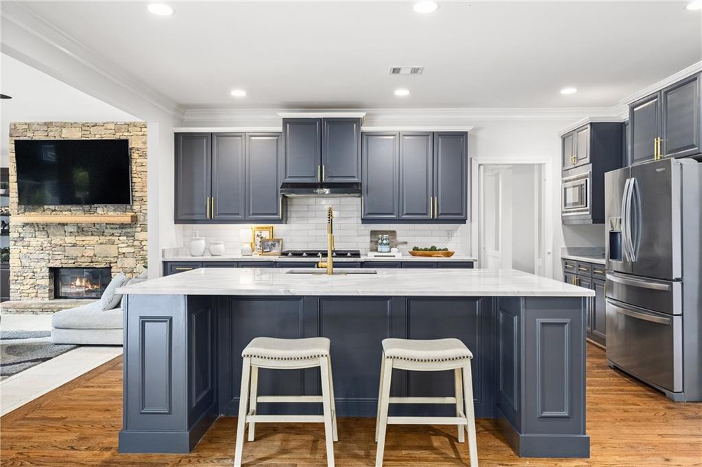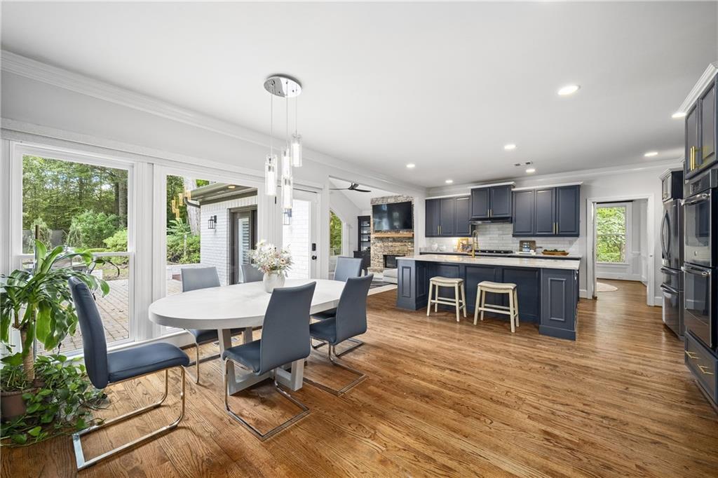 Light-filled interiors showcase hardwood floors, soaring ceilings, and a flowing layout designed for both everyday living and elegant entertaining. The chef's kitchen features professional-grade appliances, a large center island, custom cabinetry, and a breakfast nook that opens seamlessly to the fireside keeping room. A dramatic two-story great room with a wall of windows frames views of the private backyard and provides a grand yet inviting gathering space.